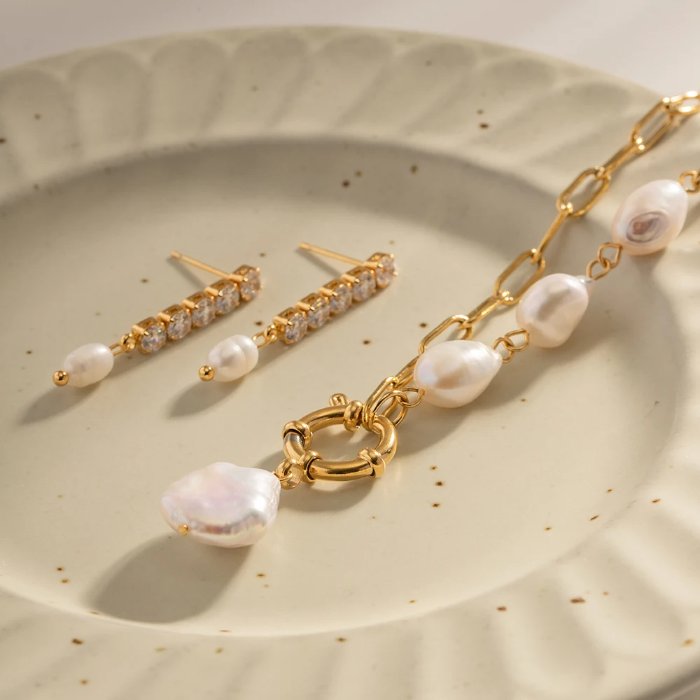 - The design combines polished metallic shine with organic pearl textures, creating a sophisticated, layered, and textured aesthetic suitable for both casual and party wear.