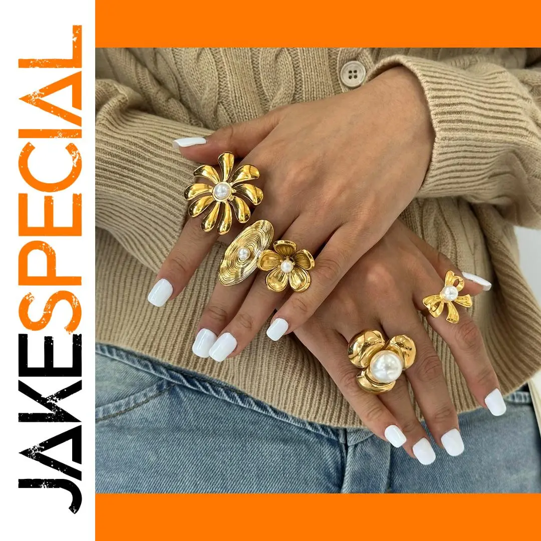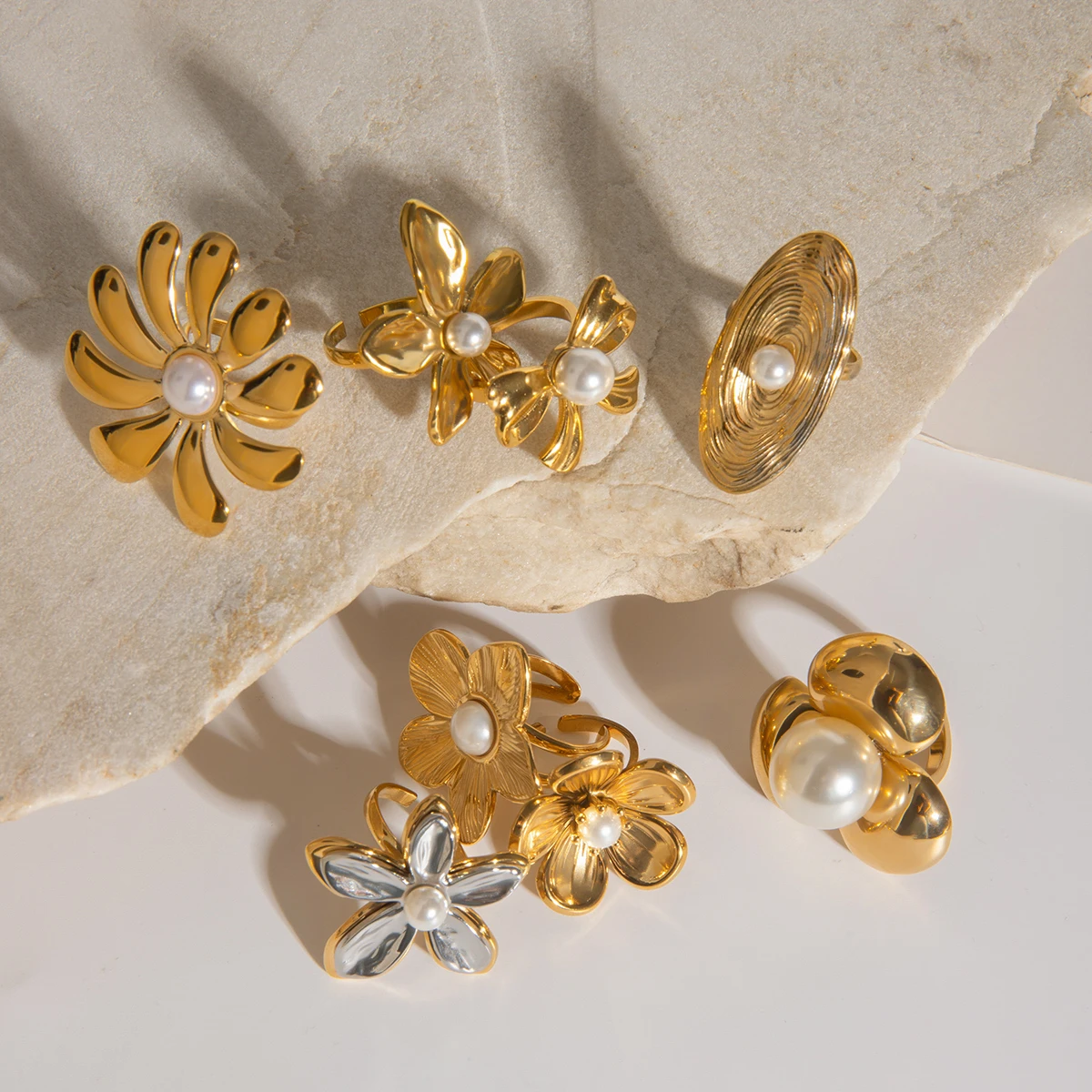 - Decorated with floral motifs, rounded petals, and a central pearl, the bold design combines elegance and statement style in a chunky, fashionable silhouette perfect for engagement or cocktail occasions.