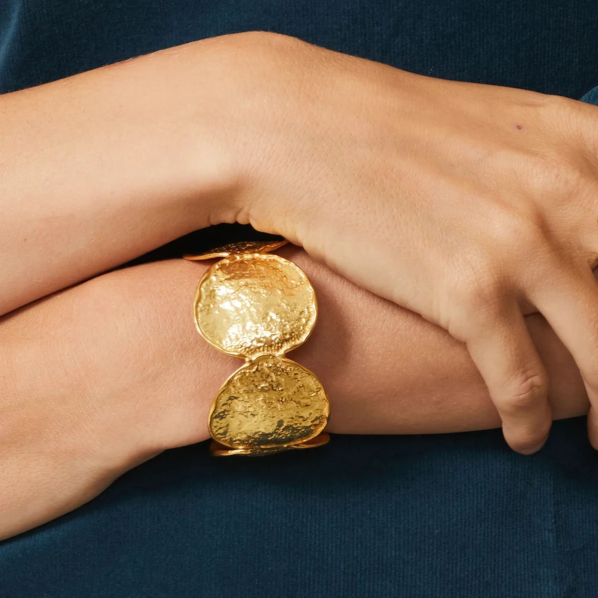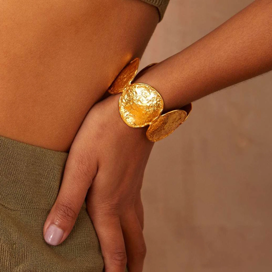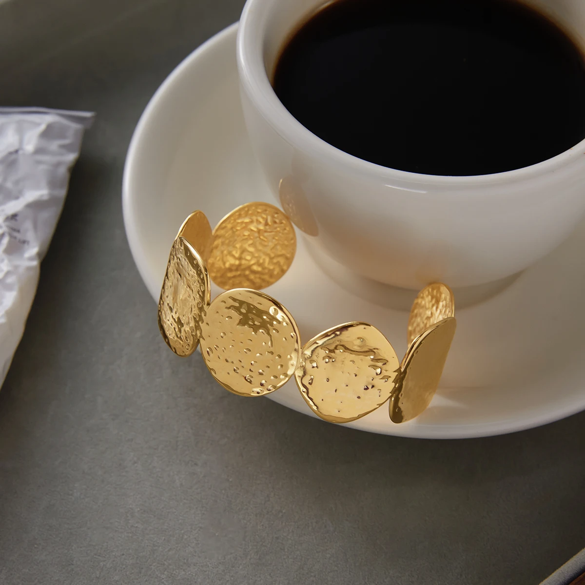 Enhance your jewelry collection with this stunning stainless steel gold-plated hammered circular bangle, model JDB0107010. Featuring an open cuff design for adjustable comfort, it showcases large interconnected circular links with a textured hammered surface that adds artisanal charm. Crafted from high-quality stainless steel with an 18K gold-like finish, this bracelet offers a shiny, reflective appearance, combining elegance with durability. Its waterproof and impact-resistant properties make it perfect for daily wear, while its hypoallergenic, chemical-free composition ensures skin safety. Make a bold style statement and enjoy versatile sophistication with this modern, eye-catching accessory.
