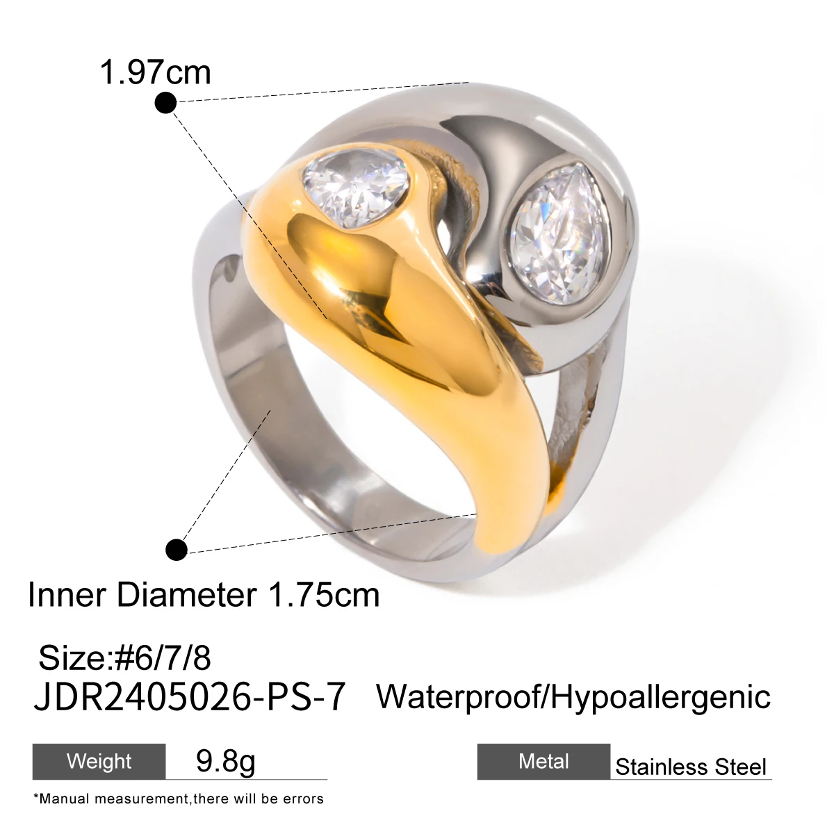 Experience the elegance of this trendy stainless steel gold ring designed for women who want to stand out. Featuring a bold, chunky design with modern geometric shapes, this piece exudes luxury and sophistication. The shiny PVD gold finish adds a warm hue that lasts for years, resisting scratches and fading. Set with attractive artificial gemstones, the ring showcases intricate details like swirling and knot patterns, enhancing its artistic modern flair. Perfect for parties or special occasions, its waterproof construction ensures durability. With sizes 6, 7, and 8, and weighing approximately 15 grams, this statement jewelry is comfortable yet eye-catching. Elevate your style with a piece that combines fashion, quality, and resilience in one elegant design.