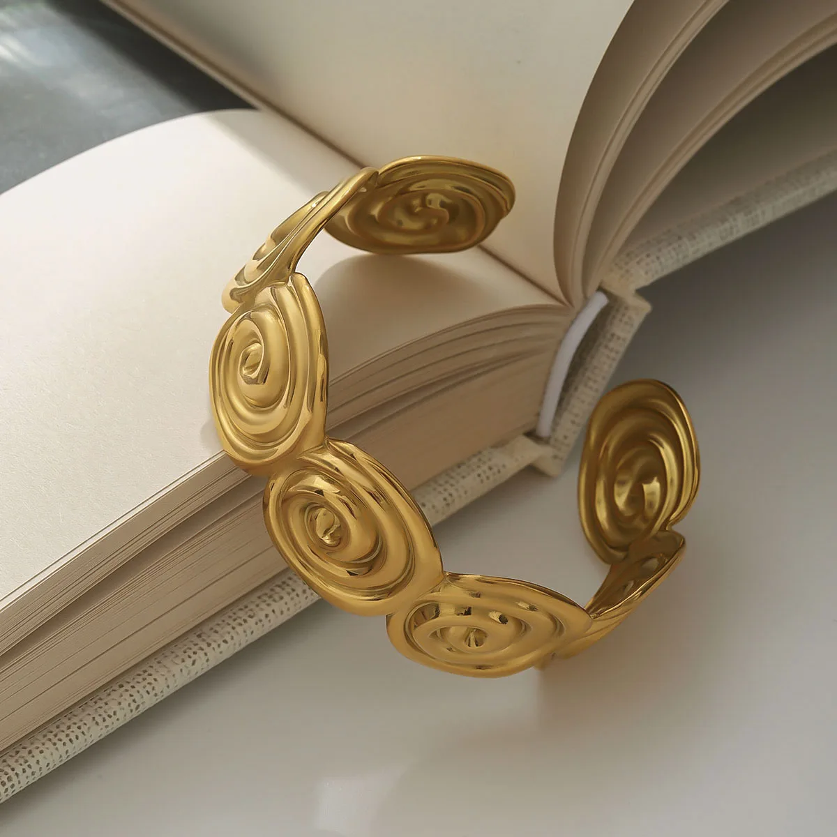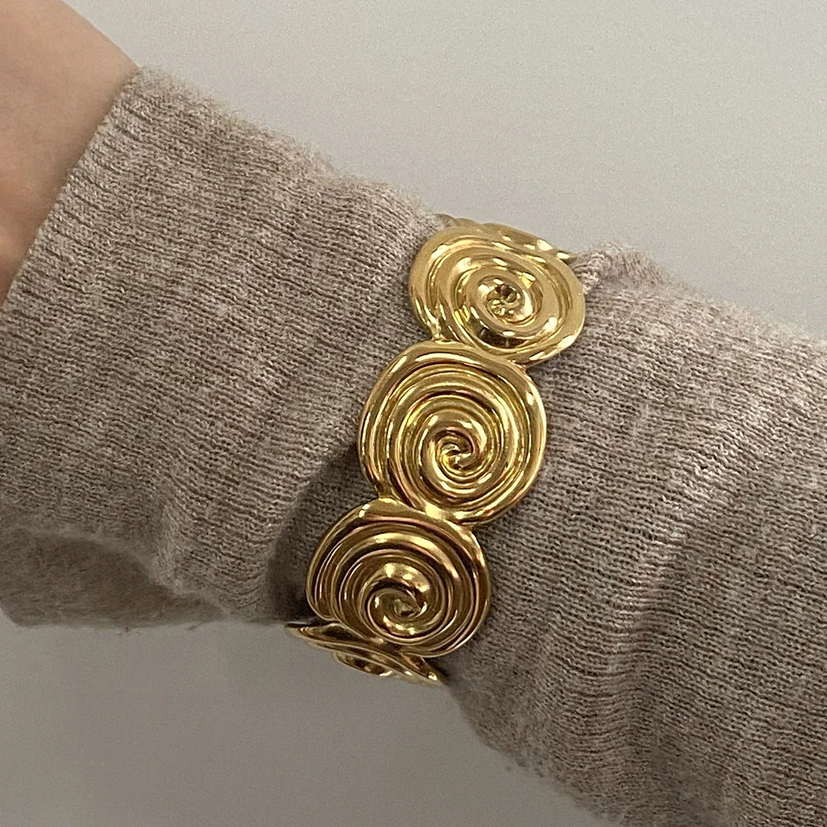 Enhance your style with this stainless steel minimalist spiral cuff bracelet, featuring interconnected open spirals in a luminous gold finish. The modern geometric design exudes sophistication and contemporary elegance, while its open cuff style allows for easy adjustment and a comfortable fit that contours naturally to your wrist. Crafted for durability and lightweight comfort, the smooth, rounded edges make it perfect for all-day wear. Measuring approximately [specific dimensions not provided], this versatile accessory seamlessly complements casual, sporty, or chic outfits, adding a touch of luxurious minimalism to any look. Ideal for expressing your unique style with confidence and grace.