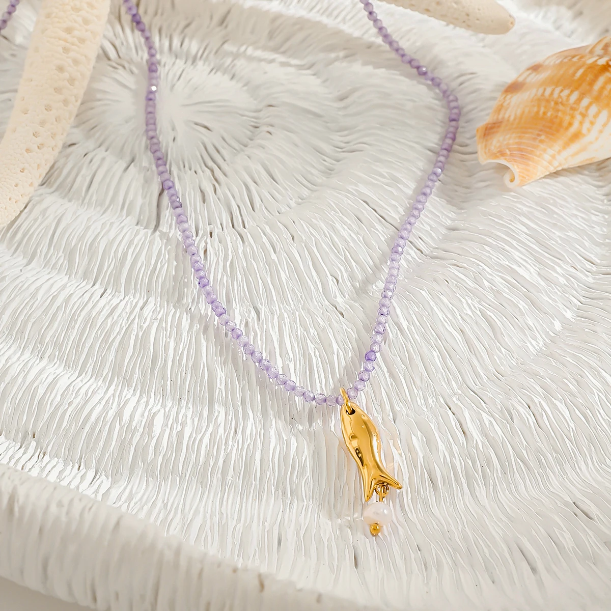- The elongated fish charm, attached with a small circular loop, features a smooth surface and a tiny white bead at the bottom, adding a subtle elegance inspired by marine life.