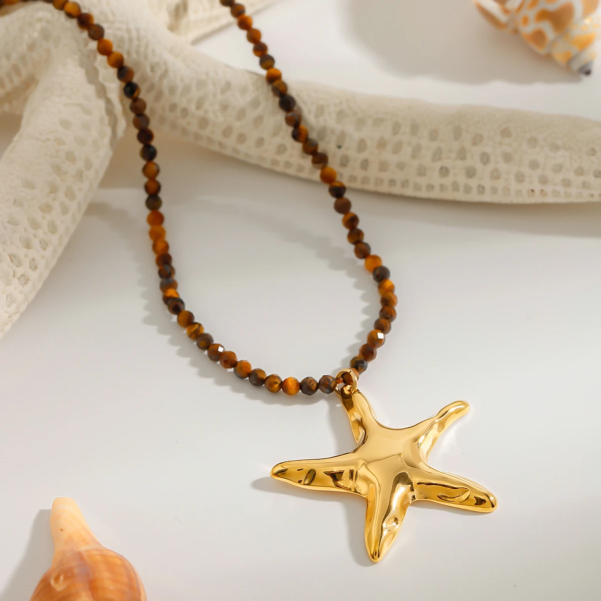 - The starfish pendant measures approximately [Size], with a hammered texture providing an eye-catching, tactile surface that mimics ocean waves, finished in durable PVD gold coating for lasting shine and scratch resistance.