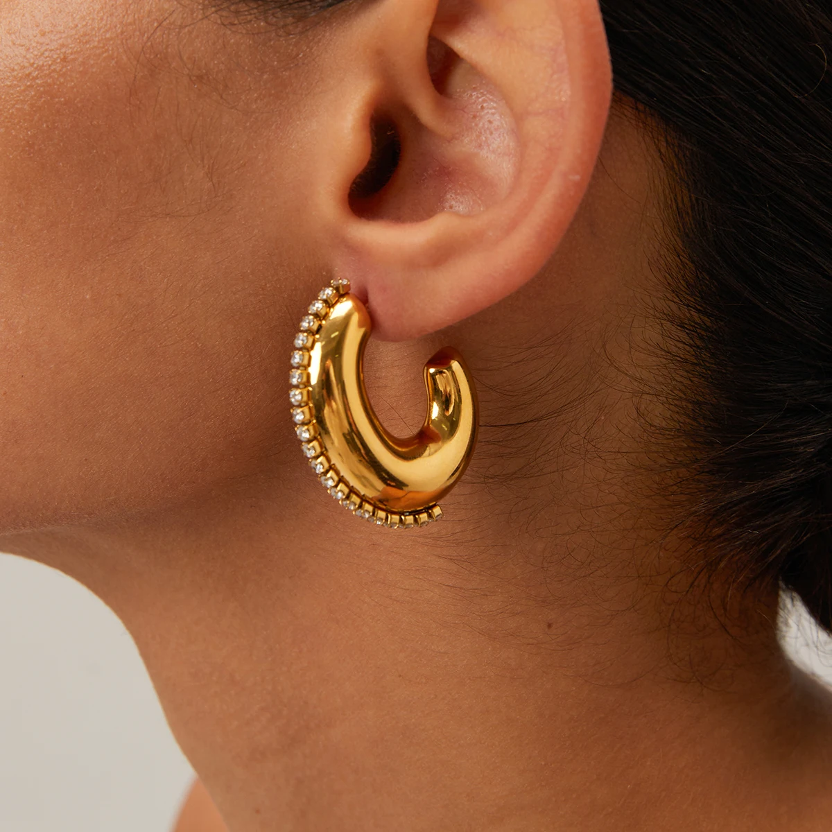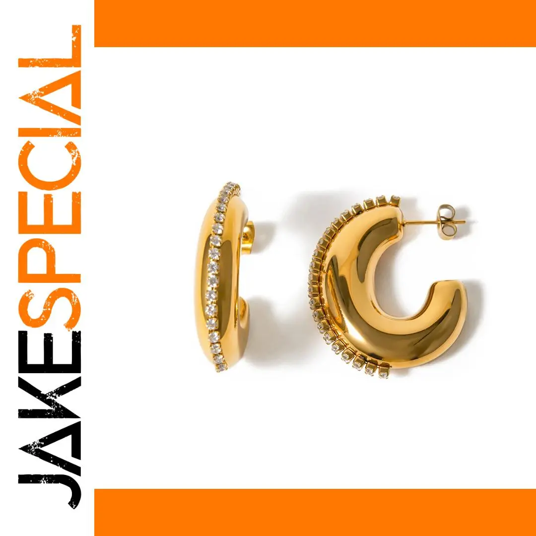 Imagine adding a touch of refined elegance to your daily look with this stylish pair of crescent-shaped earrings. Made from durable stainless steel with a radiant gold-tone finish, these earrings offer a luxurious shine that catches the light beautifully. Their bold yet sophisticated rounded crescent design measures approximately 25mm in diameter, making them perfect for both casual and formal outfits. An eye-catching row of sparkling rhinestones traces the outer edge, infusing each pair with subtle shimmer and elegance. Waterproof and built for everyday wear, these earrings are designed to withstand active outdoor conditions while maintaining their pristine appearance. Their secure push-back fastenings guarantee all-day comfort and stability, making them an essential addition to your jewelry collection.