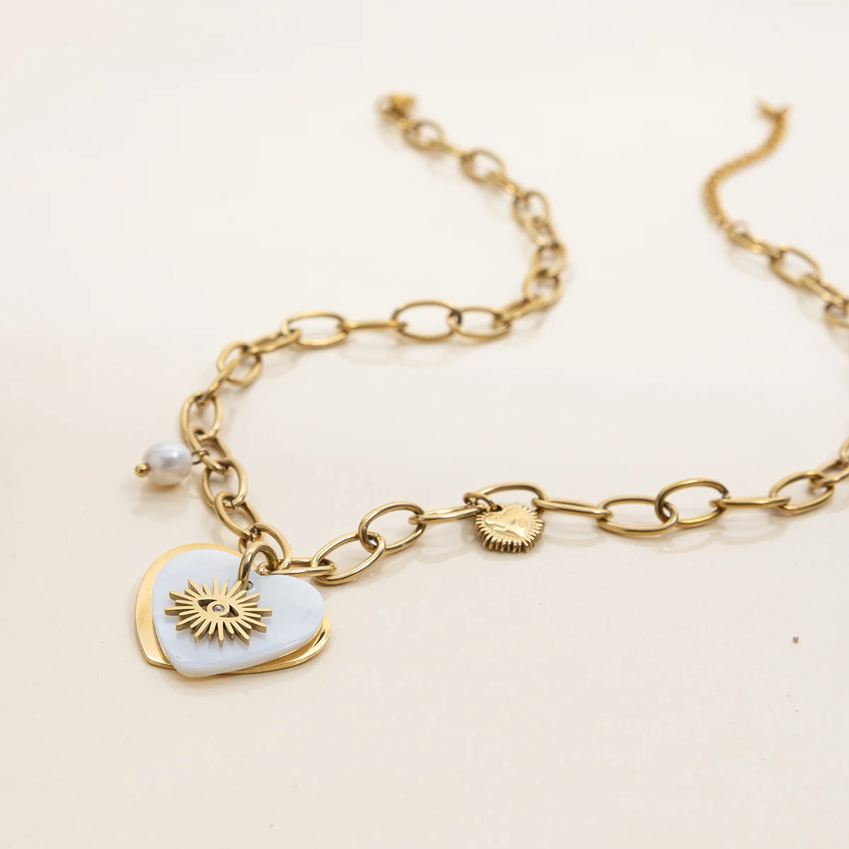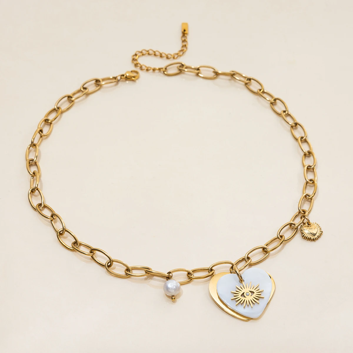 Experience the charm and sophistication of this beautiful women's necklace, designed to elevate your everyday style. Crafted with a durable stainless steel chain in a shimmering gold-tone finish, it features a striking heart-shaped pendant measuring approximately 2.3 cm. The glossy white surface of the pendant is bordered with a delicate gold-tone edge and is accented by a small gold sun motif with radiating rays and a central rhinestone, symbolizing positivity and good luck. Attached to the chain are a lustrous white pearl bead and a textured gold heart charm, adding visual variety and elegance. With its classic O-chain design, this necklace offers versatility, durability, and a timeless aesthetic—perfect for daily wear, special occasions, or as a meaningful gift.