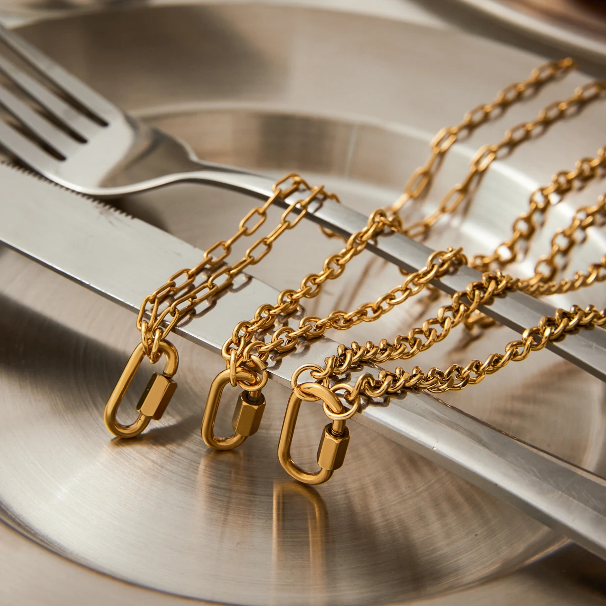 Step into a world of contemporary sophistication with this beautiful gold-tone stainless steel chain necklace. Designed to effortlessly suit both men and women, it features a layered geometric pattern of large, medium, and small links that create a modern yet timeless look. The polished, high-gloss finish reflects light perfectly, adding a touch of luxury to any outfit. Whether you're dressing for a casual day or a special occasion, this versatile piece enhances your style with its minimalist elegance. Crafted from durable stainless steel, it resists tarnishing and scratches, ensuring a lasting shine. The discreet rectangular clasp with rounded edges complements the sleek design, making it an essential accessory in your jewelry collection.