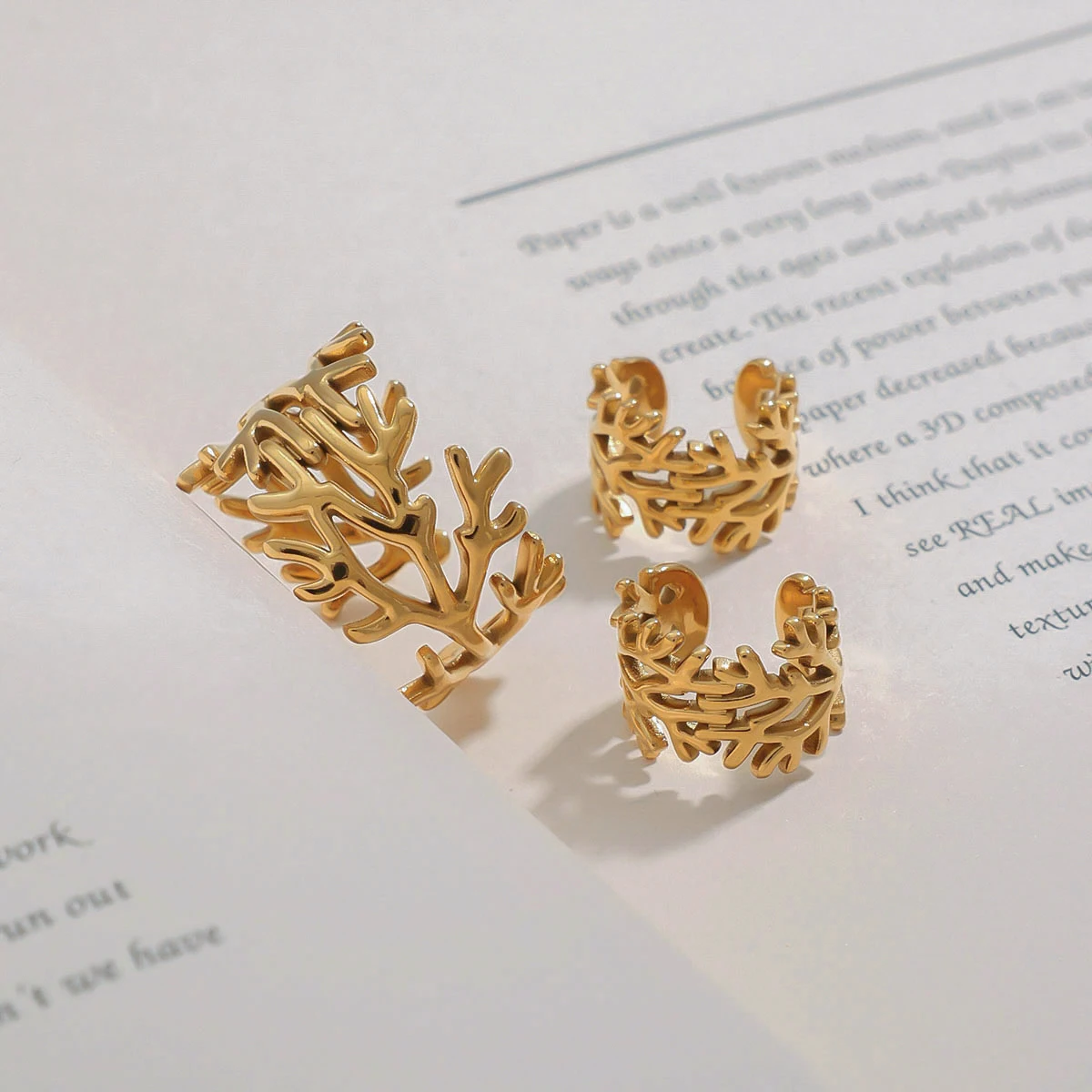 Experience effortless elegance with this stunning set of gold-tone stainless steel earrings that evoke natural beauty. Featuring a delicate hollow tree branch motif with flowing, organic curves, these open cuff clip-on earrings offer a lightweight, comfortable fit without requiring piercings. The shiny, polished surface adds a reflective, sophisticated glow, perfect for casual or formal occasions. Designed for durability, they resist tarnishing and water exposure, ensuring they remain flawless over time. With a sleek botanical-inspired style, these earrings bring a touch of modern minimalism and natural charm to your jewelry collection. Feel confident wearing these versatile accessories that blend nature’s grace with contemporary design, elevating your everyday look effortlessly.