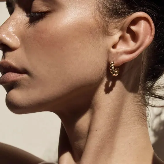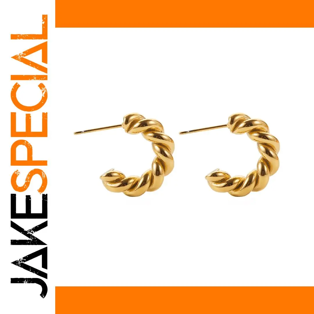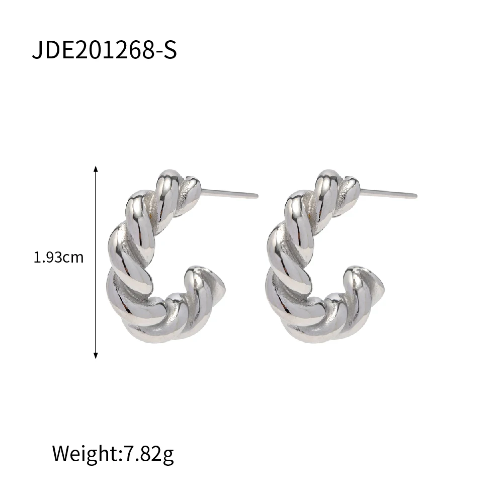 These stainless steel twisted hoop earrings feature a polished gold finish, measuring approximately 20mm in diameter and 15mm in width. Their unique spiral pattern adds a modern geometric touch, while the smooth, reflective surface exudes elegance. Equipped with a straight post for easy pierced earlobe insertion, they provide a comfortable fit for everyday wear. Perfect for both casual and formal occasions, these versatile earrings blend contemporary style with durable craftsmanship, making them a timeless addition to any jewelry collection. Available in multiple color options, they offer a sophisticated and stylish accessory that enhances any outfit with subtle luxury.
