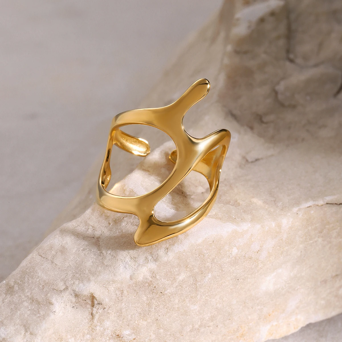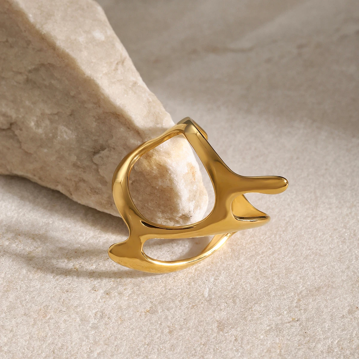 Immerse yourself in the sophisticated charm of this this stylish geometric twisted ring, crafted from durable stainless steel with a luxurious PVD gold finish. Its modern design features smooth, flowing curves and abstract shapes, perfect for adding a bold yet elegant touch to your everyday style. Whether dressing up for a party or enhancing your casual wear, this accessory offers a versatile look. The polished surface reflects light beautifully, creating a luxurious glow with every movement. Lightweight at just 7 grams, it provides comfortable wear while maintaining its color and shine for years, thanks to its anti-scratch, waterproof coating. Elevate your jewelry collection with this captivating, high-quality piece that exudes contemporary elegance.
