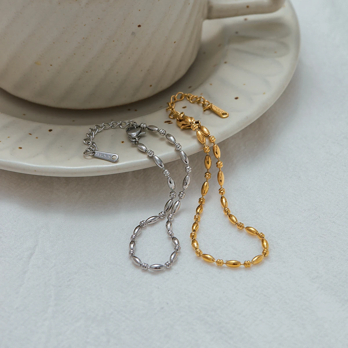- Designed with elongated oval-shaped beads and a sleek, polished surface, it reflects a contemporary yet timeless style suitable for both men and women.