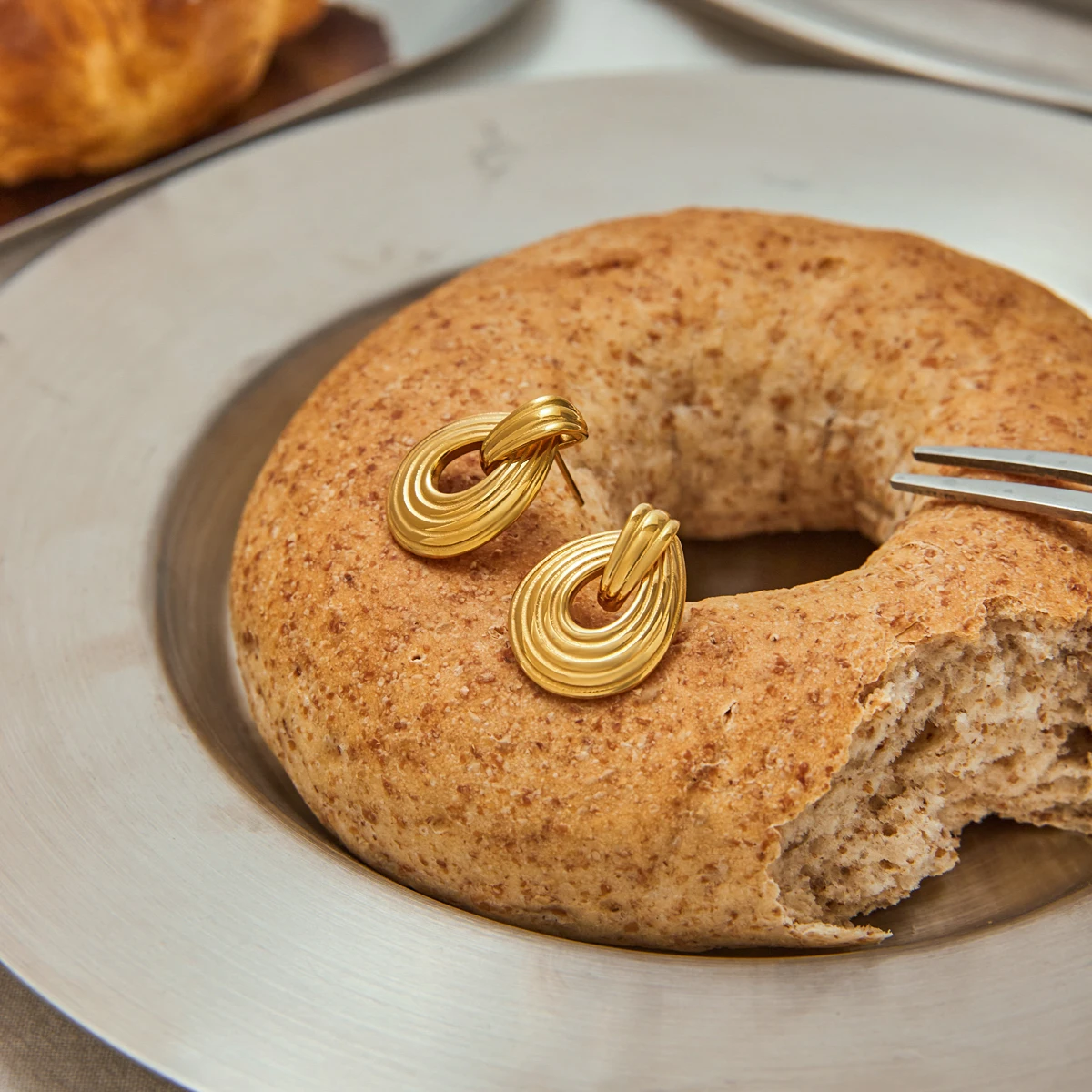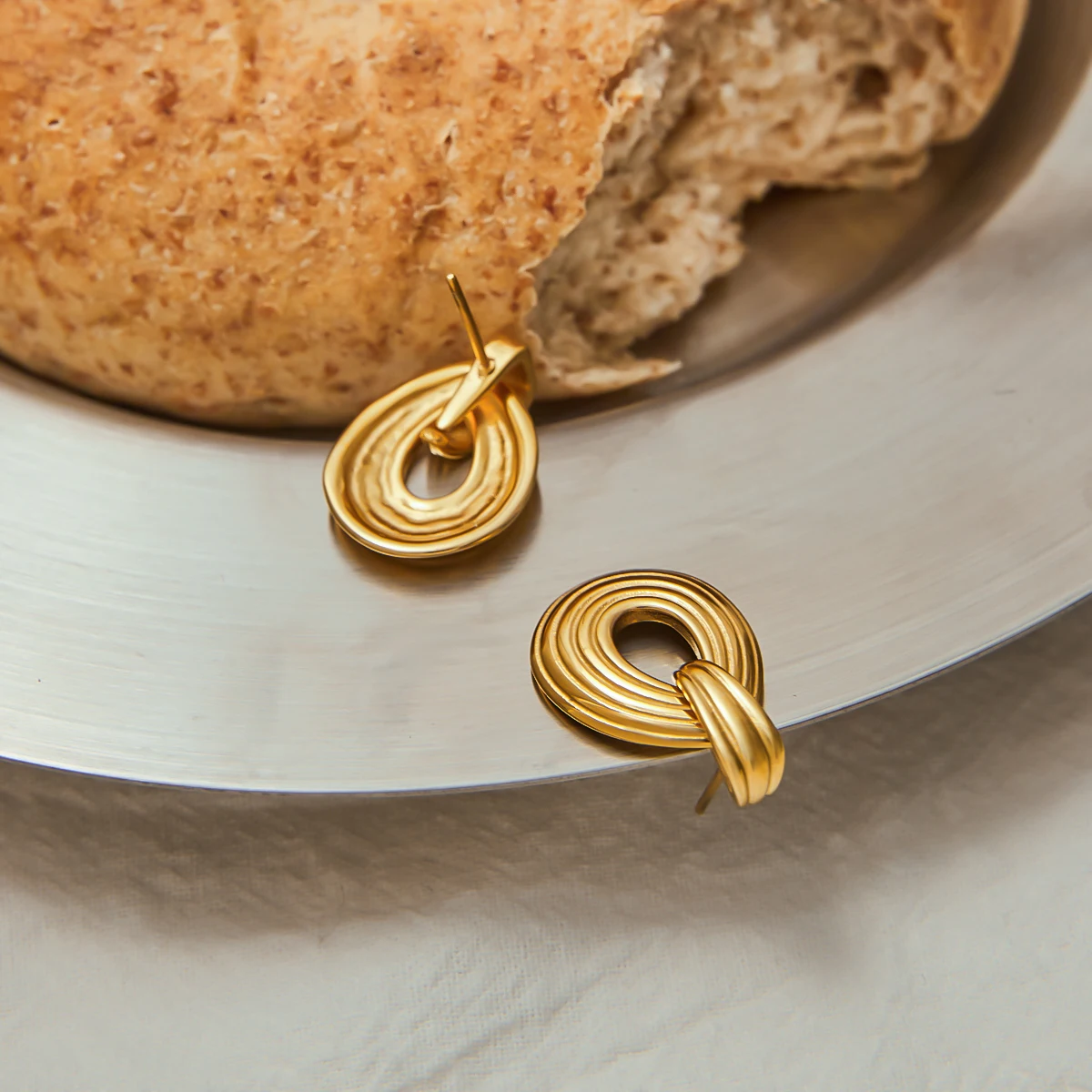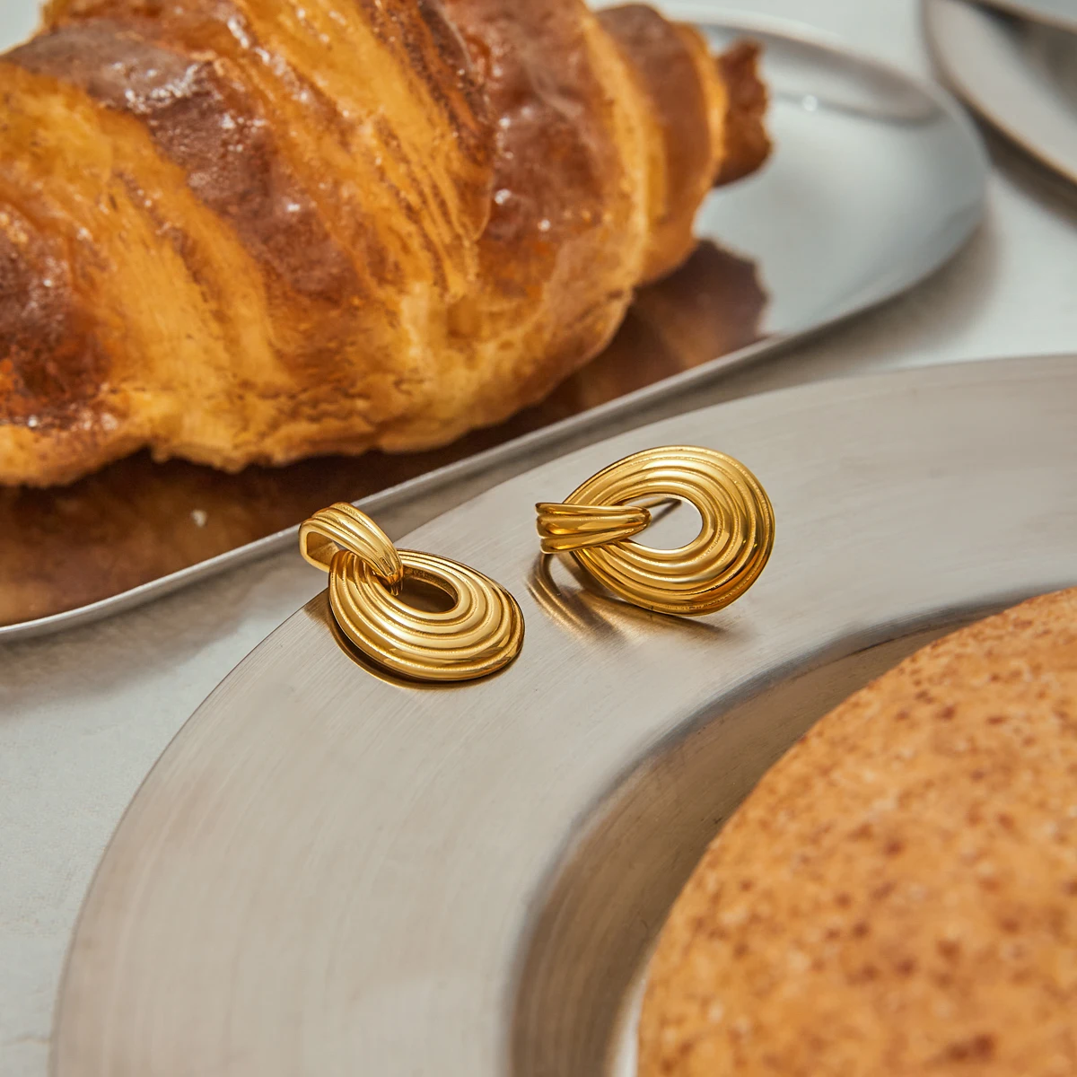 Experience the timeless charm of this pair of earrings, crafted to elevate your jewelry collection. Featuring a sophisticated water drop shape with concentric ridges and a polished, textured finish, these earrings combine organic design with trendy appeal. Made of durable stainless steel with a PVD gold coating, they boast enhanced longevity, ensuring the color remains vibrant year after year. The screw-back stud design offers comfort and security, perfect for daily wear or special occasions. With a weight of approximately 15 grams, they are lightweight yet impactful. Waterproof and free of nickel, lead, and cadmium, these earrings are safe and suitable for sensitive skin. Treat yourself to jewelry that seamlessly blends elegance and modernity.