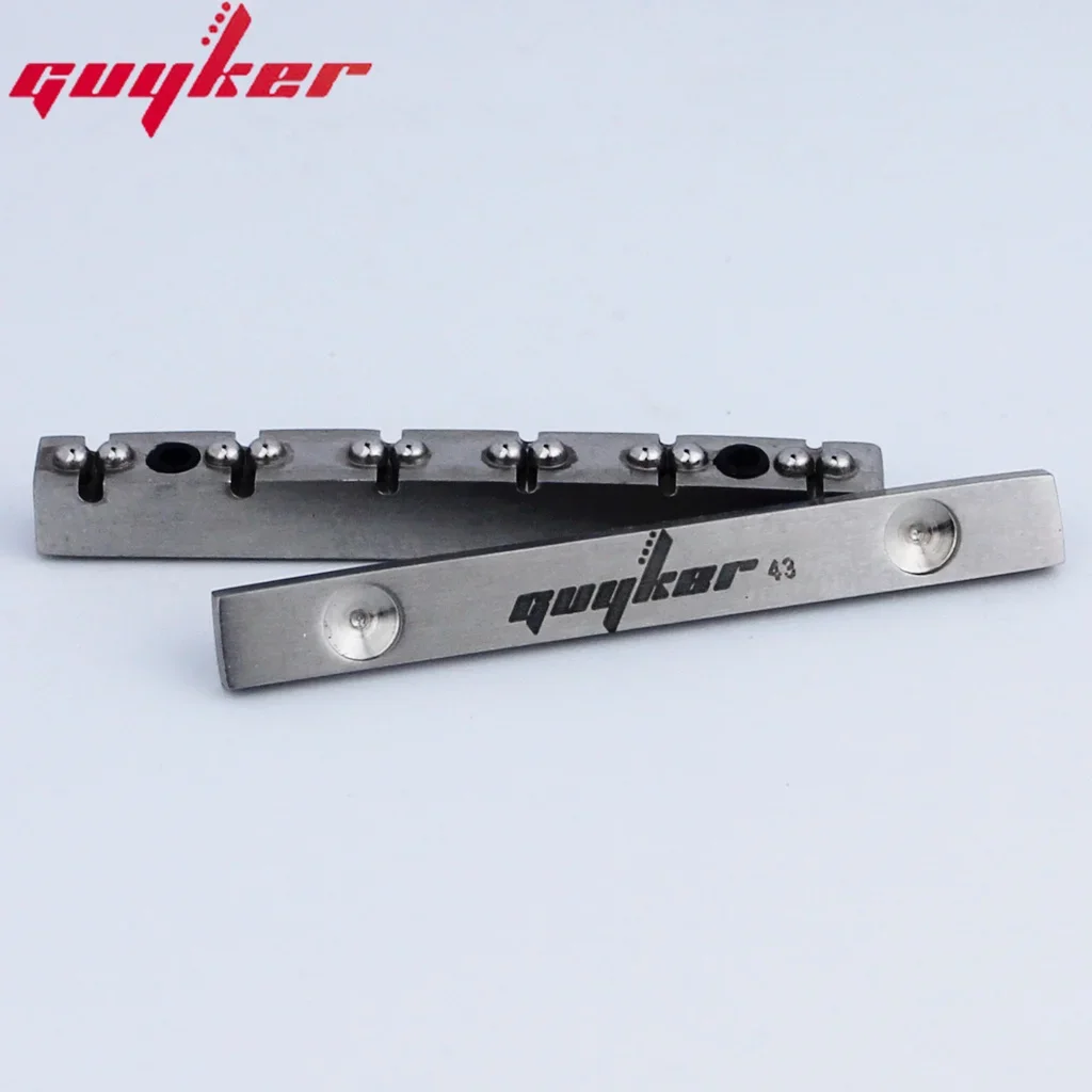 Experience an upgrade with this sleek, stainless steel guitar nut designed specifically for 6-string LP-style guitars. Its polished, metallic surface exudes durability, precision, and modern style. The dual parts, comprising a longer rectangular piece and a smaller support component, ensure reliable performance and customizable setup. With two height options, 42mm or 43mm, you can perfectly tailor your guitar’s string action, resulting in improved sustain and tuning stability. The smooth surface and meticulously arranged beads act as precise string guides. Thanks to its durable metal construction, this replacement nut elevates your playing experience with enhanced durability and performance. Whether you're a professional or enthusiast, this component will seamlessly integrate and elevate your guitar’s resonance and stability.