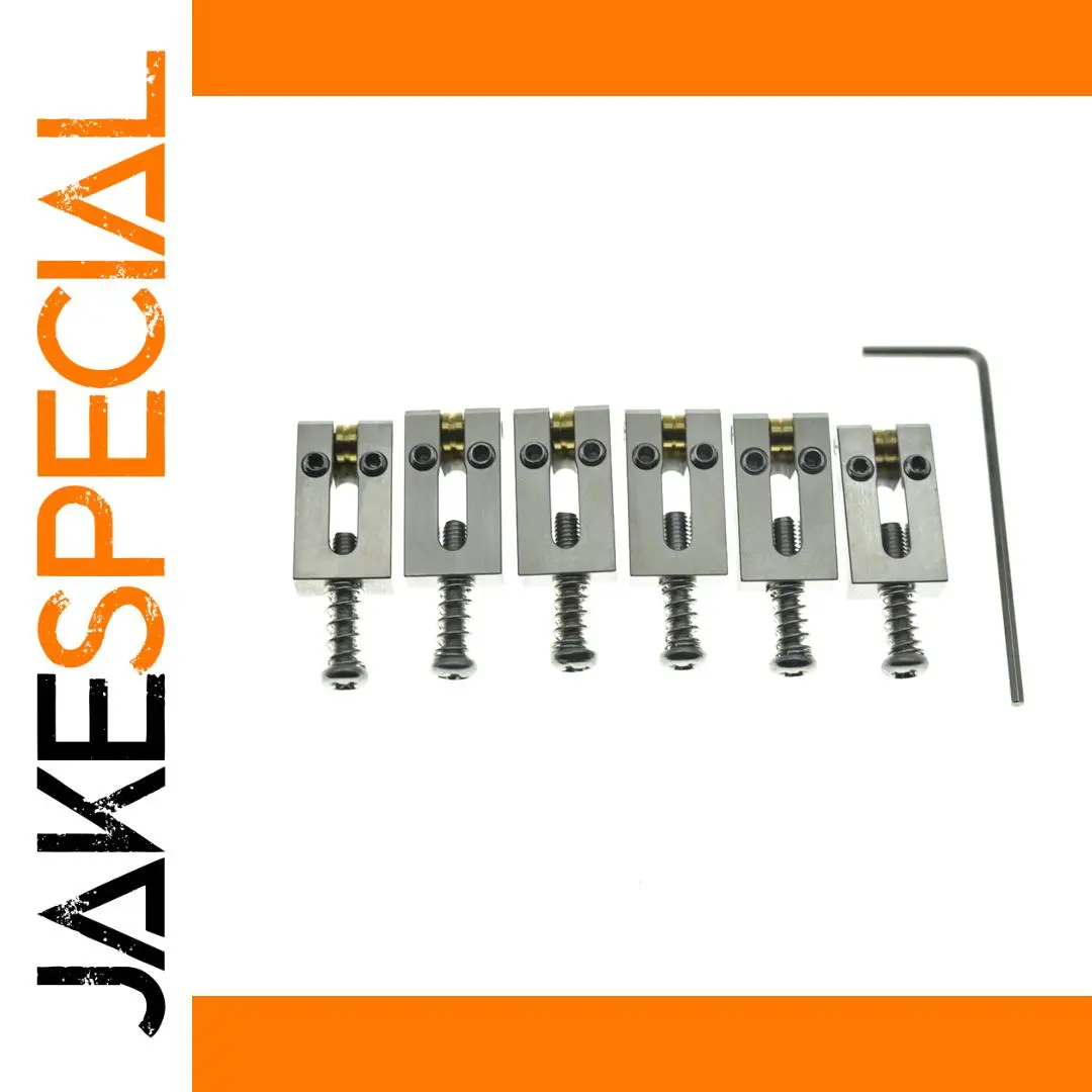 Enhance your electric guitar’s performance with this premium set of six stainless steel bridge roller saddles. Crafted with precision, these saddles feature polished, rectangular bodies with a sleek, reflective finish that exudes durability and professionalism. The brass rollers, mounted seamlessly on each saddle, ensure smooth string movement and precise intonation adjustments. Designed for easy installation, this set provides a significant boost in sustain, tuning stability, and tone clarity. Whether you're upgrading your Stratocaster or Telecaster, these saddles are a reliable choice for musicians seeking high quality components that combine aesthetic appeal with functional excellence. Imagine feeling confident each time you play, knowing your guitar’s performance is optimized with parts that are built to last.