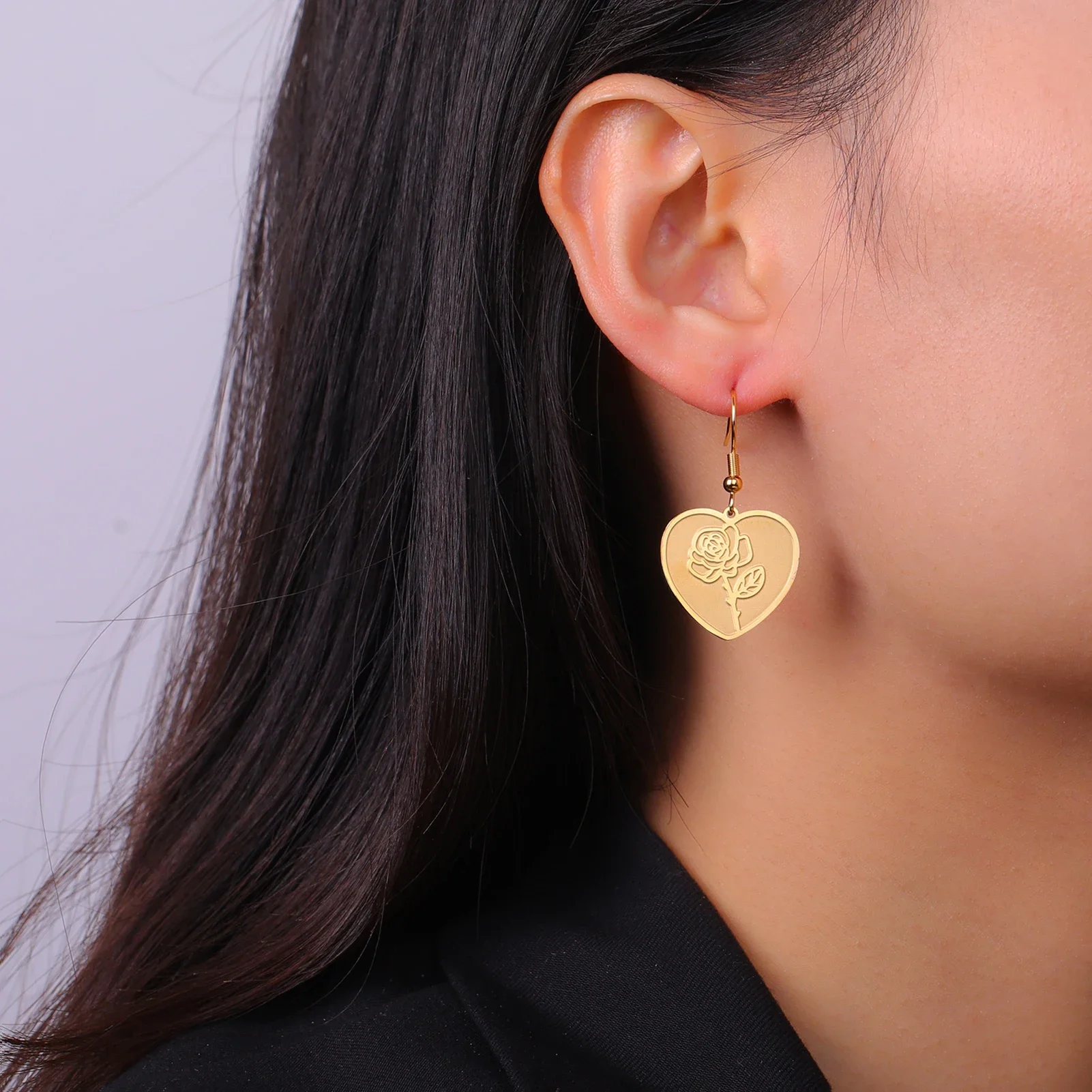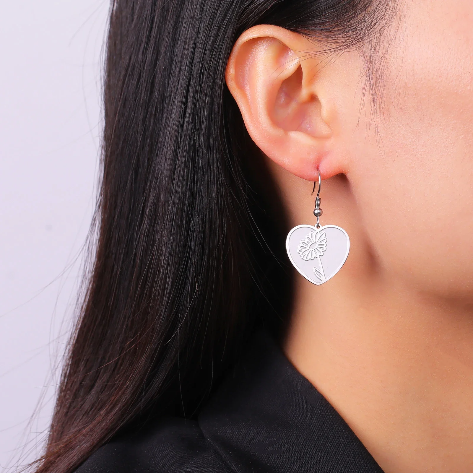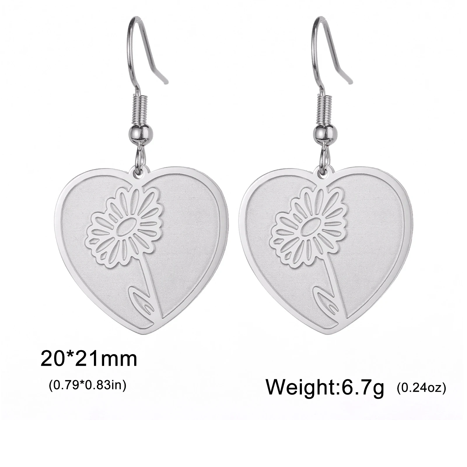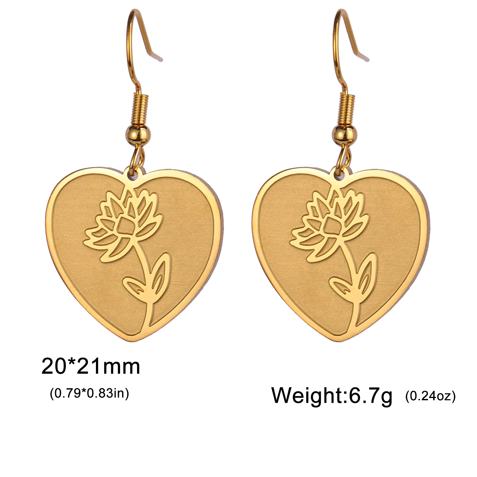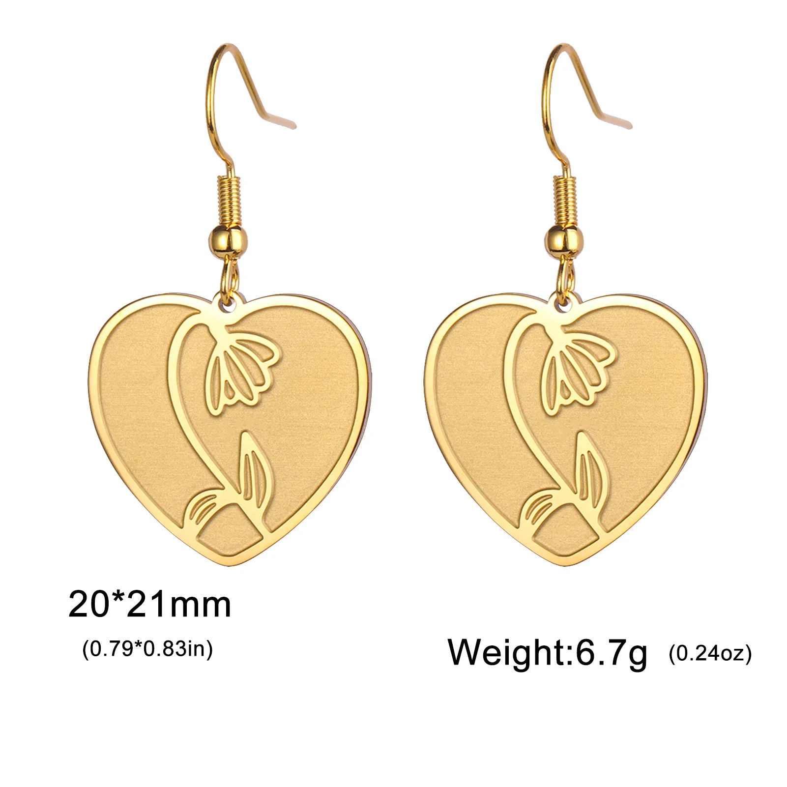 - Technical specifications: Heart diameter approximately 1.5 cm, floral motif inside about 1 cm, hook length 2 cm, made with stainless steel, hypoallergenic, fade-proof, non-deformable.