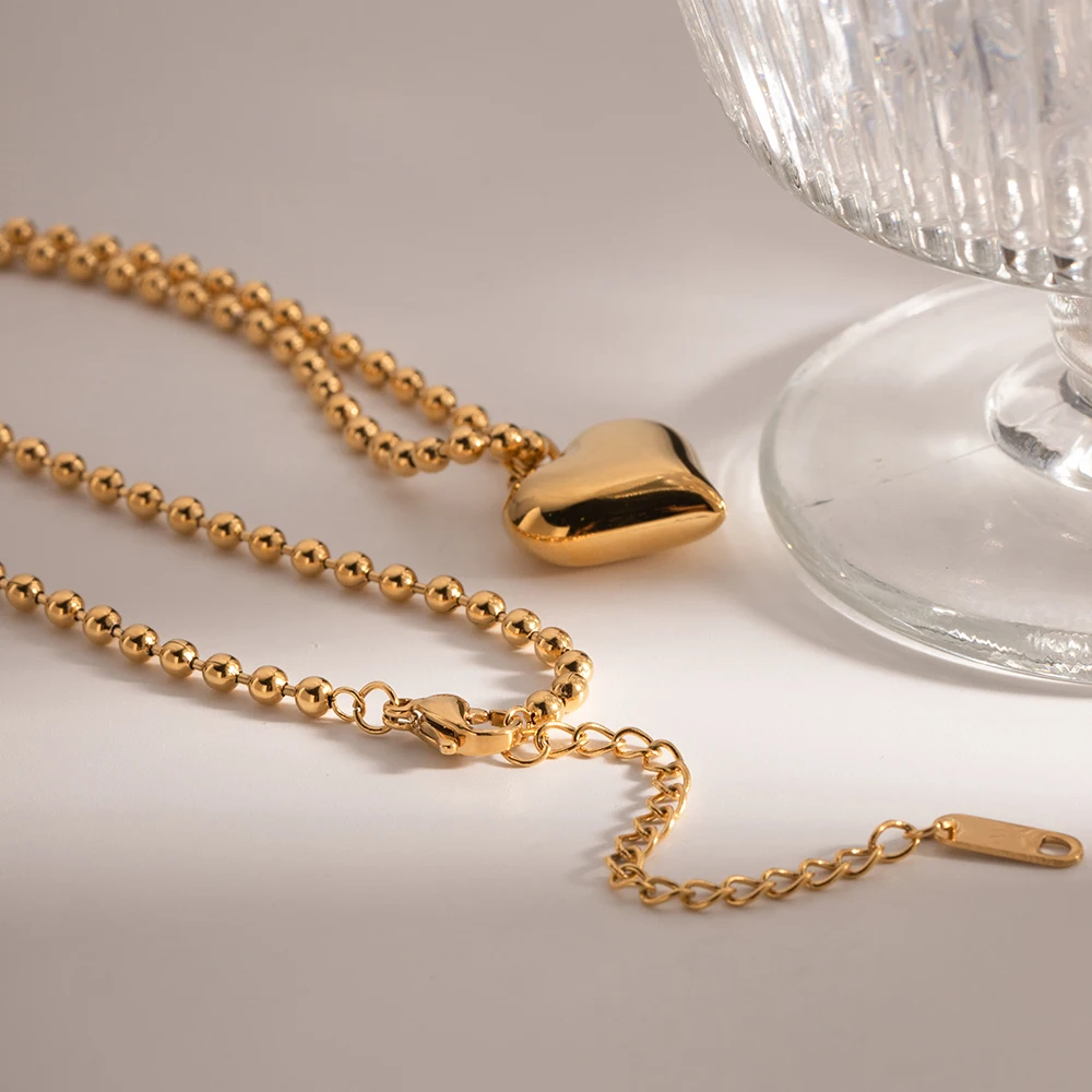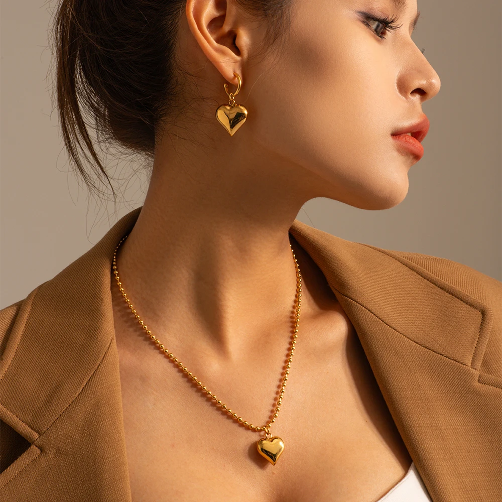 Imagine elevating your style effortlessly with this stunning jewelry set. Designed for modern women, it features a chunky, three-dimensional heart pendant and matching earrings, all crafted from durable stainless steel with a lustrous PVD gold finish. The beaded chain adds texture and shimmer, while the adjustable length offers versatility for different neckline styles. Whether you're heading to a party or simply want to feel confident throughout your day, this eye-catching piece combines elegance and boldness. Its waterproof, nickel-free, and scratch-resistant properties ensure long-lasting beauty, making it an investment in your everyday wardrobe. Feel the confidence that comes with wearing accessories that shine as brightly as you do.