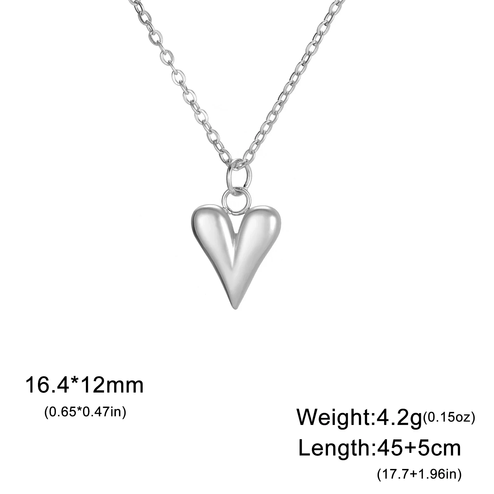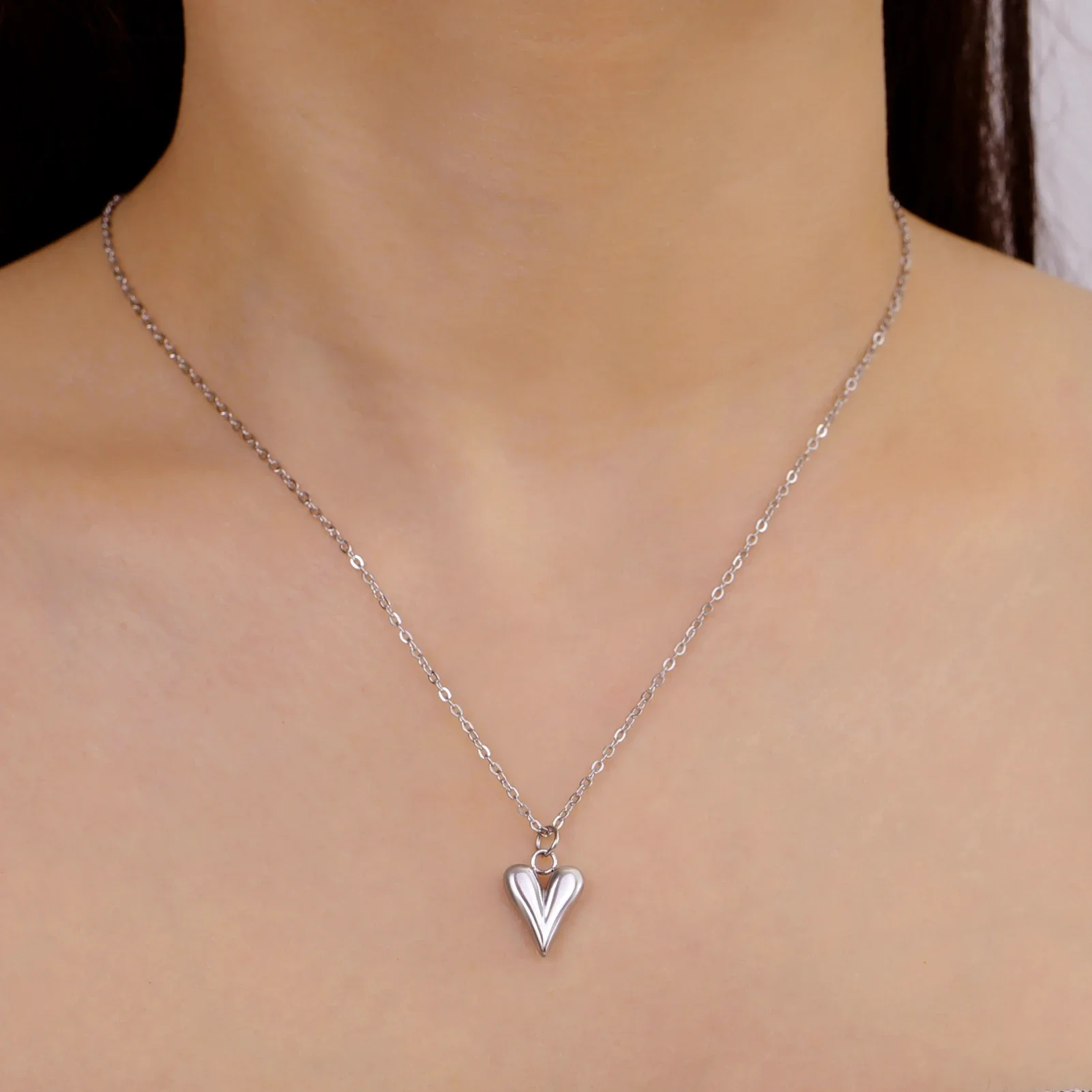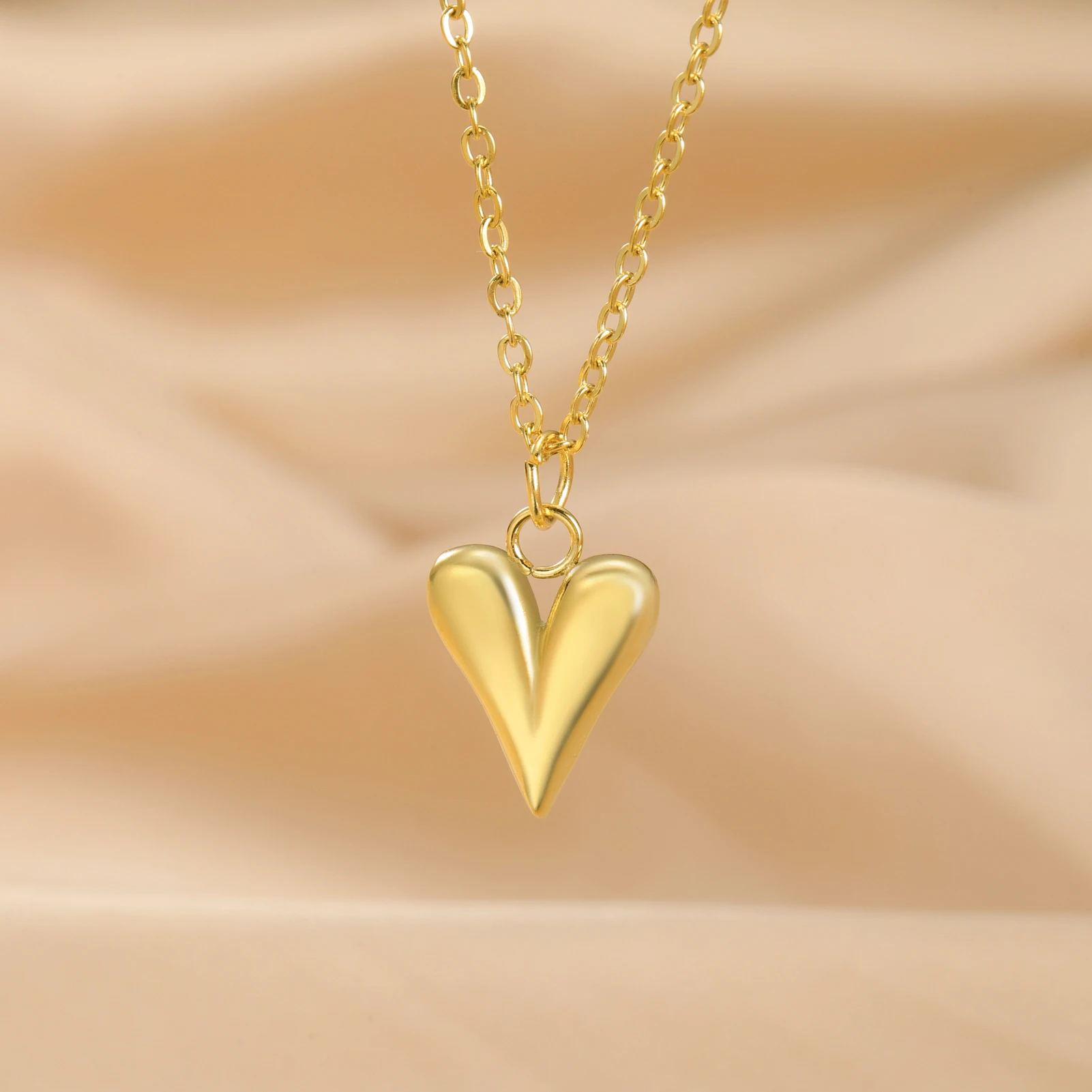 - This necklace features a polished, shiny heart-shaped pendant made from stainless steel or gold-tone, emphasizing the modern, minimalist aesthetic with reflective surface qualities.