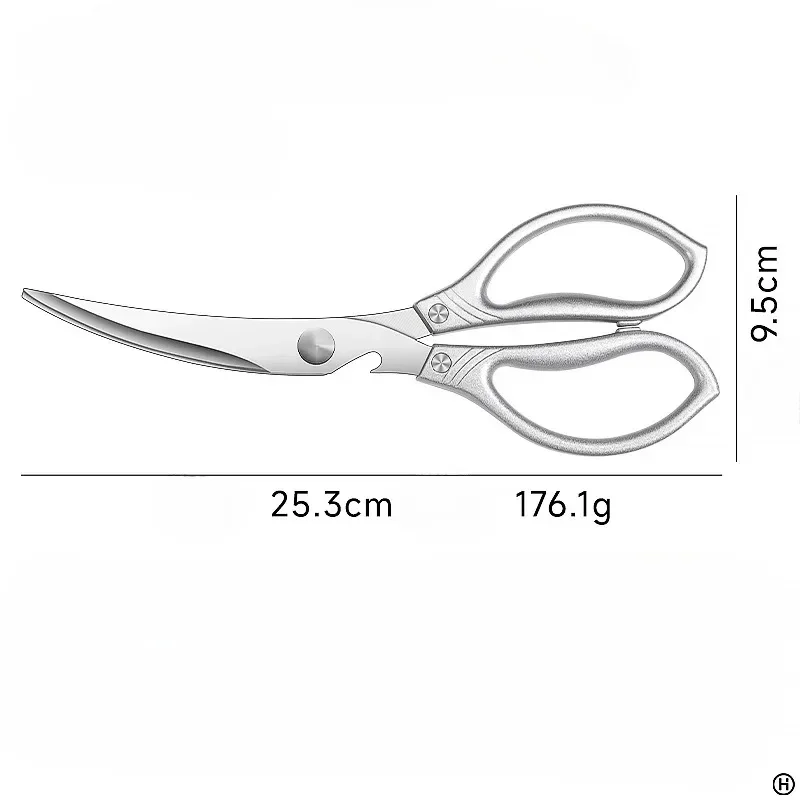 Experience culinary convenience with this sharp stainless steel kitchen scissors, expertly designed for heavy-duty tasks. With its sleek, shiny silver finish, the scissors not only provide supremacy in functionality but also an elegant touch to your kitchen. The long, slightly curved blades effortlessly tackle tougher materials, such as chicken bones, while the ergonomic handles promise supreme comfort and excellent maneuverability. Whether you're chopping vegetables or preparing meats, these multifunctional scissors are your reliable partner in the kitchen's hustle. Crafted from durable stainless steel, they ensure longevity and resistance to corrosion, making them a valuable addition to any culinary space.