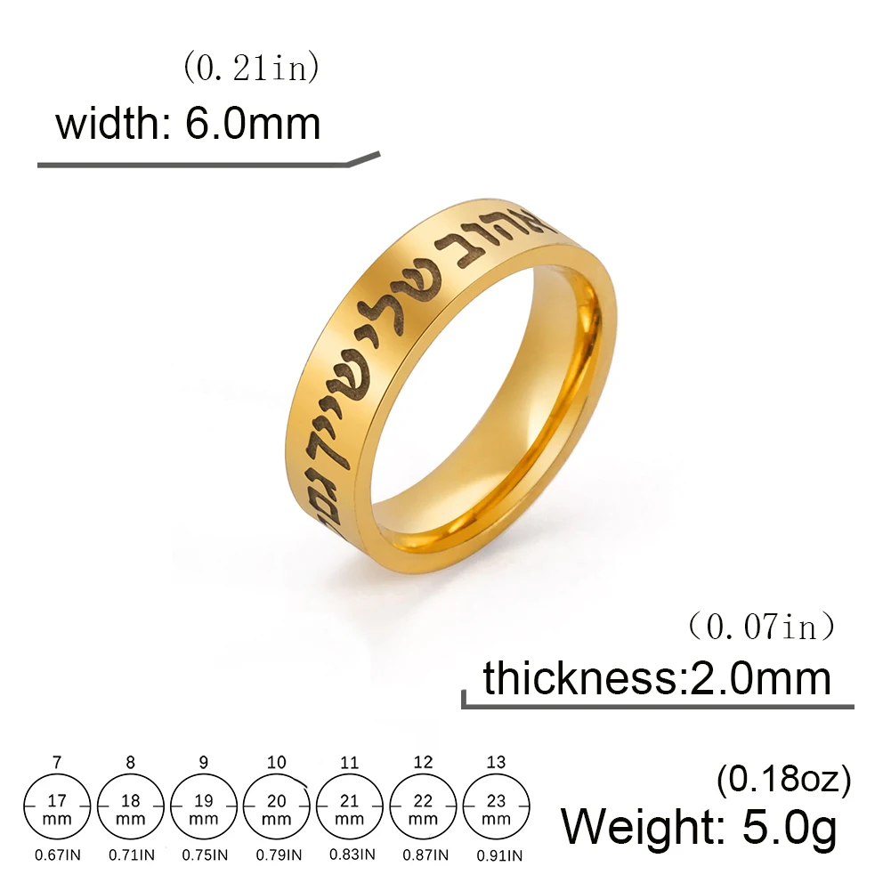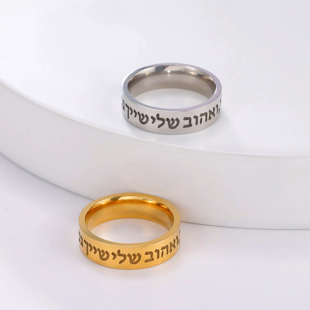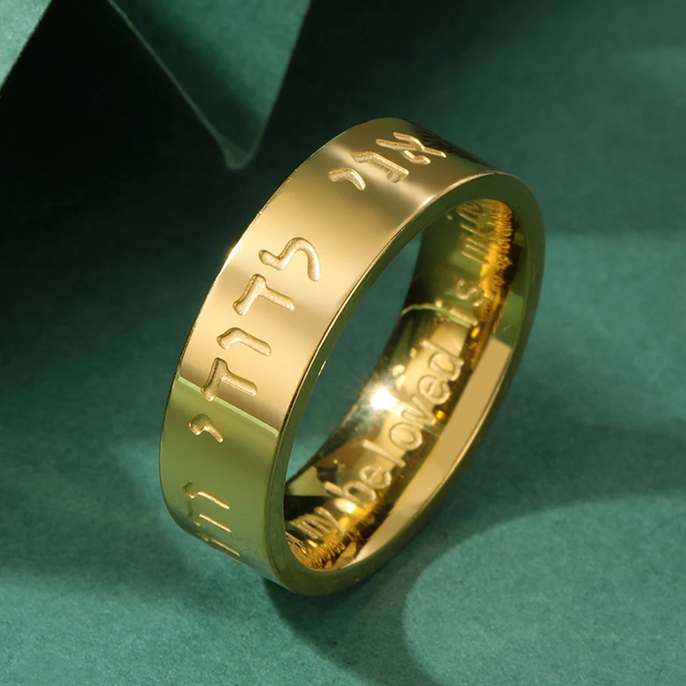 Experience the timeless elegance of this stainless steel Shema ring, designed for both men and women who wish to carry a symbol of faith close to their hearts. Its sleek 6mm wide surface features an engraved Hebrew inscription of the Shema prayer, highlighting spiritual devotion and belief. Available in stunning dual-tone options—silver (steel color) or gold (gold color)—it combines a modern, polished finish with a vintage touch. The rounded edges ensure a comfortable fit, making it perfect for daily wear or special religious occasions. Whether for a wedding, confirmation, or personal affirmation, this meaningful accessory offers a stylish reminder of faith’s importance in your life.