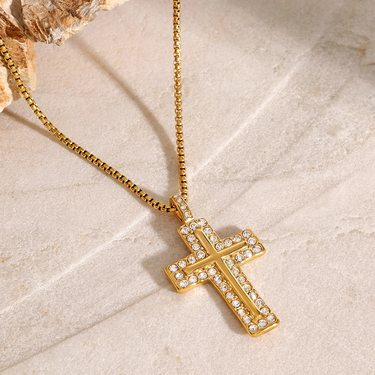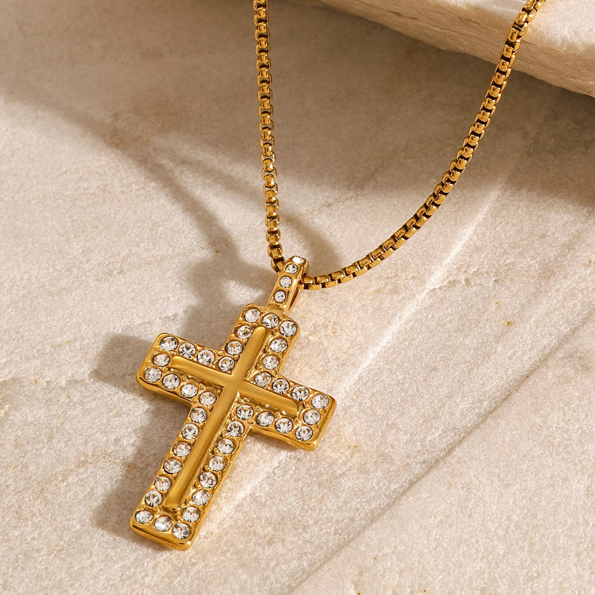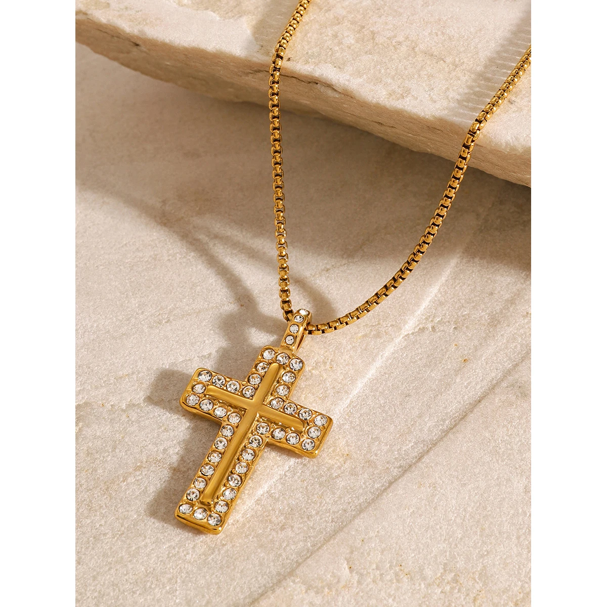 - Features a bold cross-shaped pendant decorated with tiny, shiny cubic zirconia stones embedded along the outline, creating an eye-catching sparkling effect.