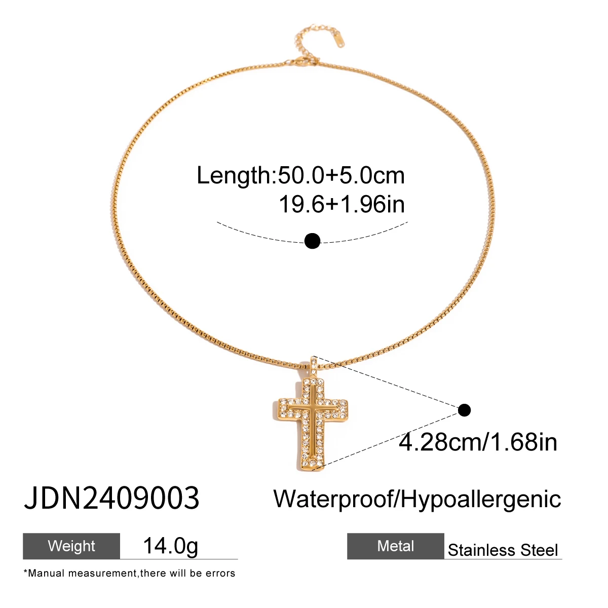 Imagine elevating your everyday look with this elegant yet trendy necklace. Crafted from durable stainless steel with a PVD gold finish, it features a bold cross-shaped pendant outlined with tiny, sparkling cubic zirconia stones that catch the light beautifully. The smooth edges and raised border give it a sleek, polished look perfect for dressing up or down. The textured rope chain adds a touch of sophistication, making this piece versatile for parties, casual outings, or special occasions. Weighing only 15 grams, it offers a lightweight, comfortable fit that resists fading, scratching, and water, ensuring you'll enjoy its beauty for years to come. This necklace is an essential accessory for modern fashion lovers seeking style and durability.