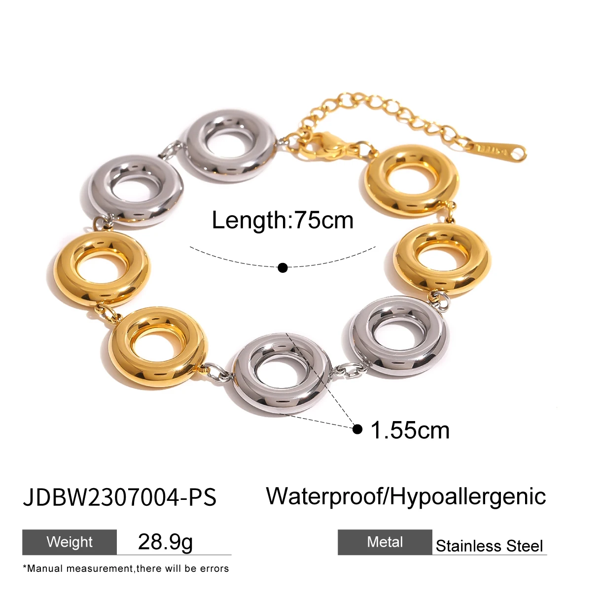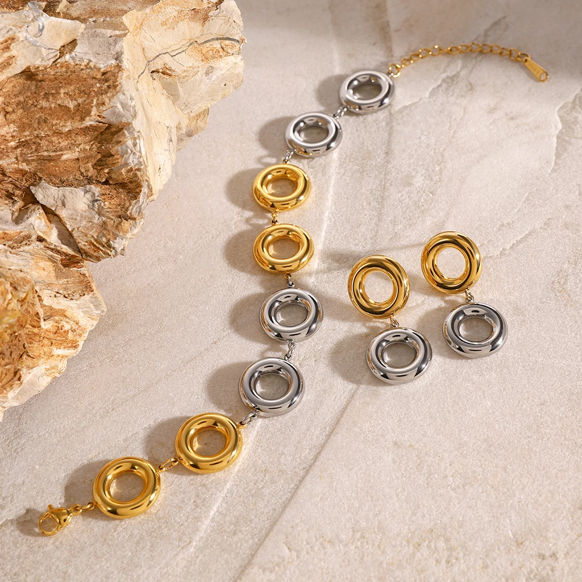 Experience timeless sophistication with this modern stainless steel jewelry set, designed to elevate your style effortlessly. Crafted from high-grade stainless steel, it features a glossy, reflective finish that enhances its luxurious appearance. The set includes large, hollow oval-shaped earrings with a sleek dangle design, perfect for making a statement at formal events or daily outings. The matching bracelet boasts polished circular links arranged in a striking two-tone metallic effect—gold and silver—adding versatility to your wardrobe. With an adjustable extension chain and secure clasp, the pieces provide a comfortable, customizable fit. The contemporary minimalist shapes, scratch resistance, and high-gloss shine make this set a reliable choice for long-lasting elegance and everyday charm.