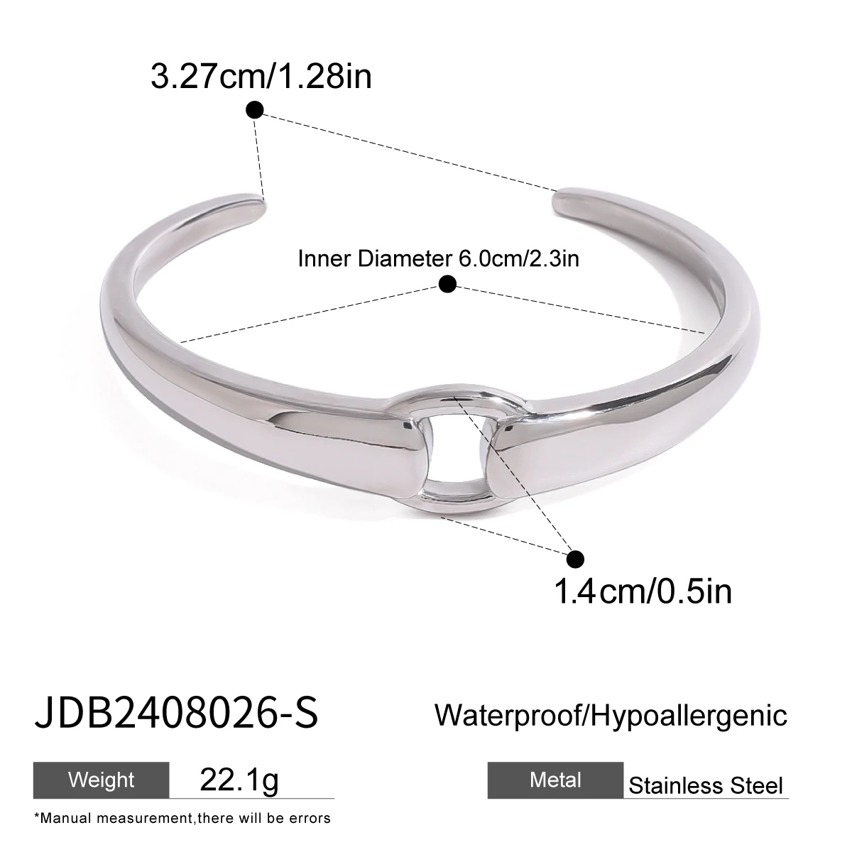 - Technical specifications include stainless steel material, polished surface finish, unisex design, and geometric shapes with rounded edges, emphasizing sleek modern minimalism.