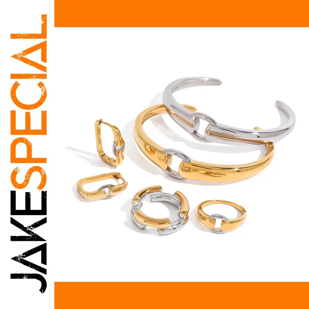 Discover the modern elegance of this unisex stainless steel jewelry set finished in a polished gold tone. Designed with minimalist sophistication, it features five versatile pieces: two cuff-style bangles, two small hoop earrings, and two geometric rings—one chunky and one delicate. The collection showcases smooth, rounded shapes with clean, sleek lines that reflect light beautifully, creating a trendy and refined look. Perfect for day-to-night styling, this set combines contemporary design with durability. Whether you're dressing up or down, it offers effortless versatility. Crafted to be waterproof and resistant to tarnish, these pieces promise long-lasting beauty and comfort. Elevate your style confidently with this cohesive and fashionable jewelry collection.