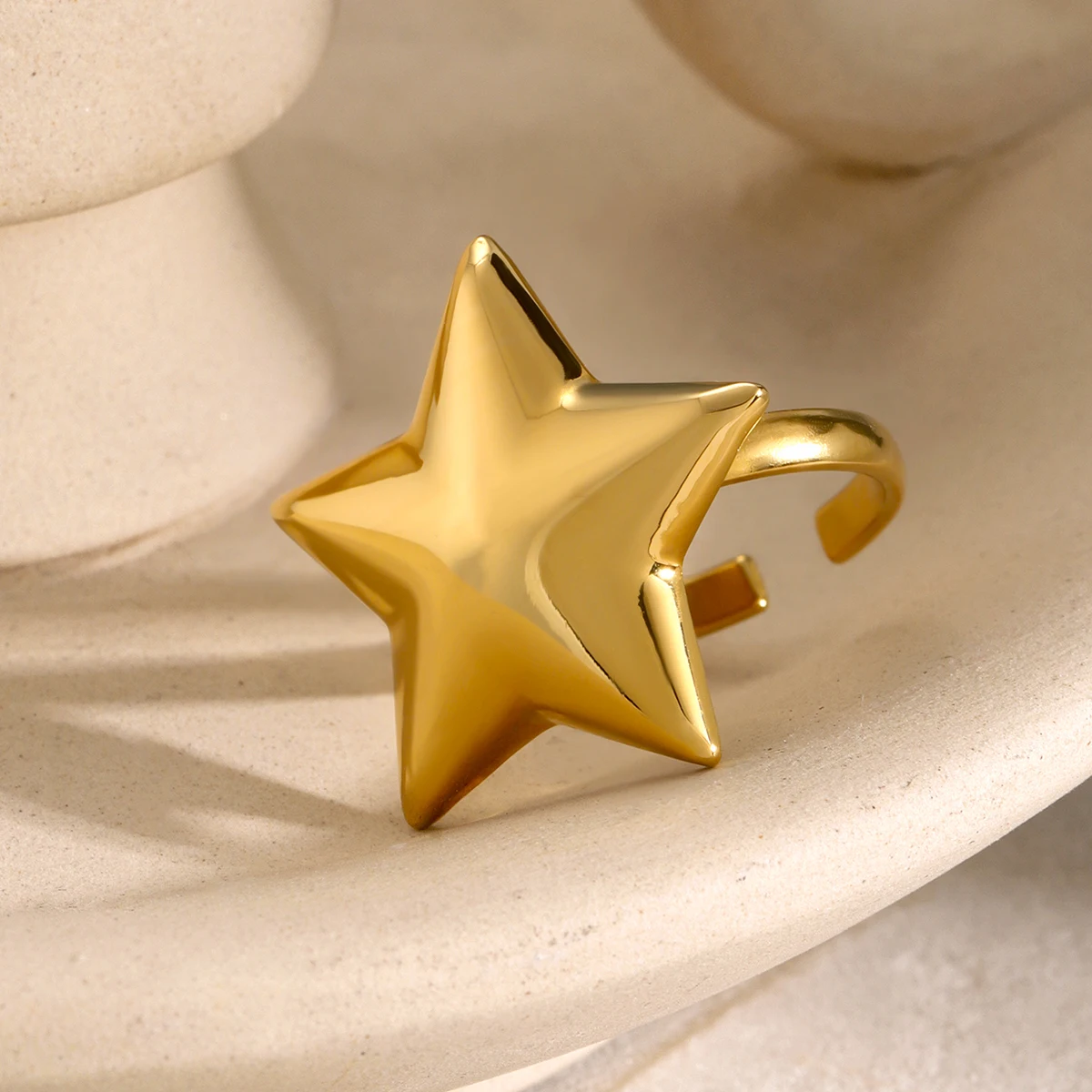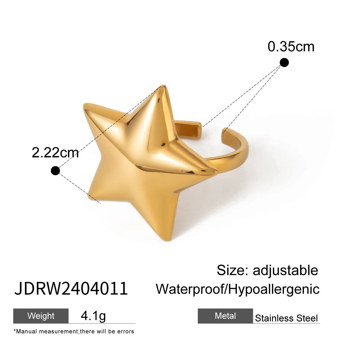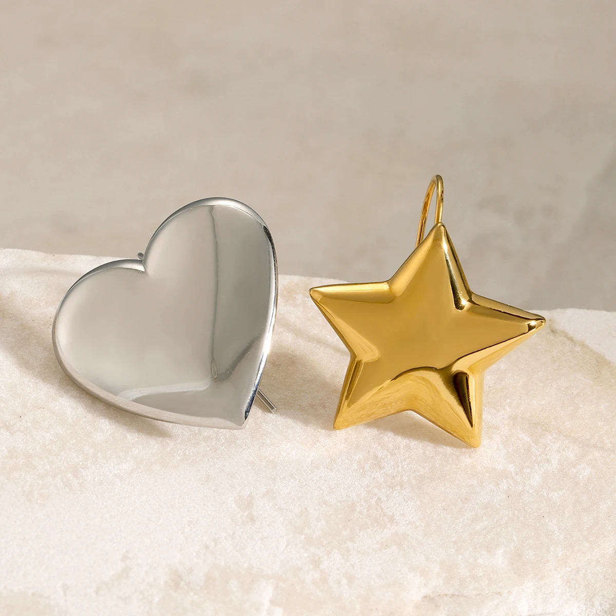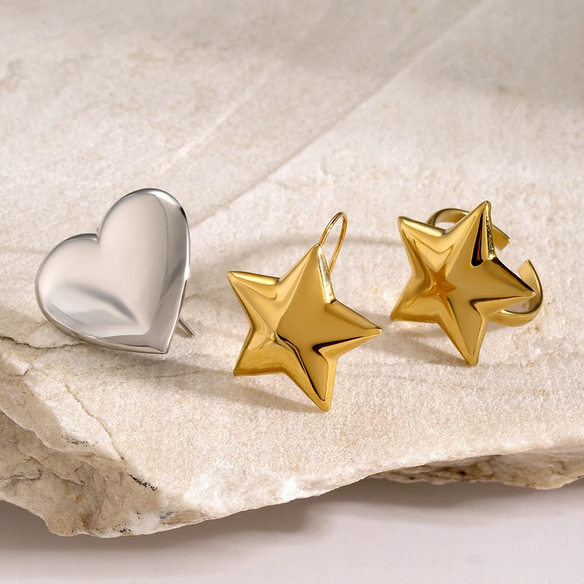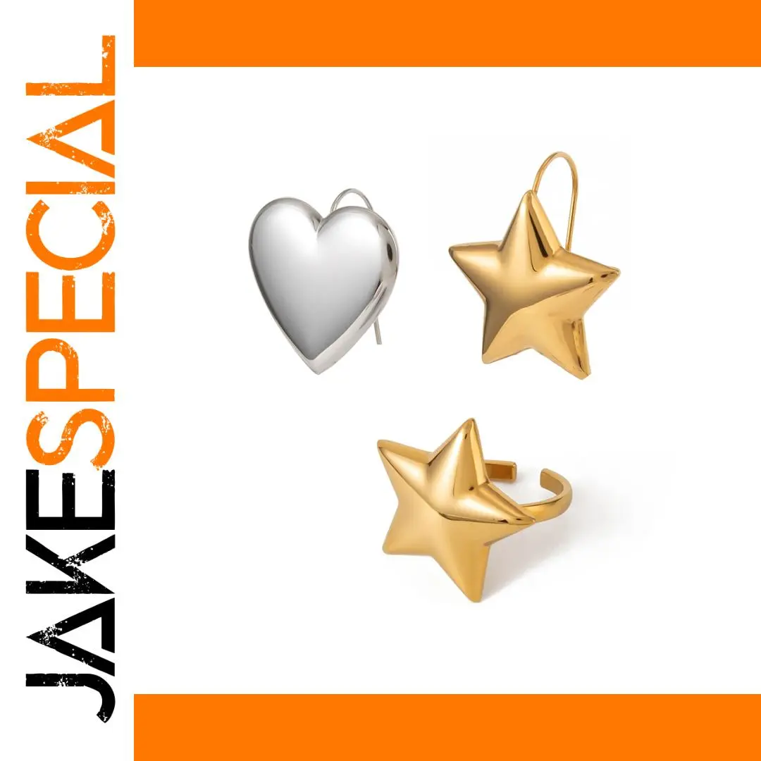 Enhance your style with this stainless steel jewelry set, featuring a pair of silver-tone, convex heart-shaped dangle earrings with simple hooks, and a gold-tone, three-dimensional star-shaped ring with an adjustable open band, polished surface, and exaggerated rounded tips. Crafted from durable, rust-proof stainless steel with a sleek, glossy finish, this versatile set offers a modern, trendy look suitable for daily wear or special occasions. The silver earrings are model-coded JDEW2404036-PS, while the gold ring corresponds to code JDRW2404011, ensuring high quality and durability. Perfect for elevating everyday outfits with contemporary elegance.