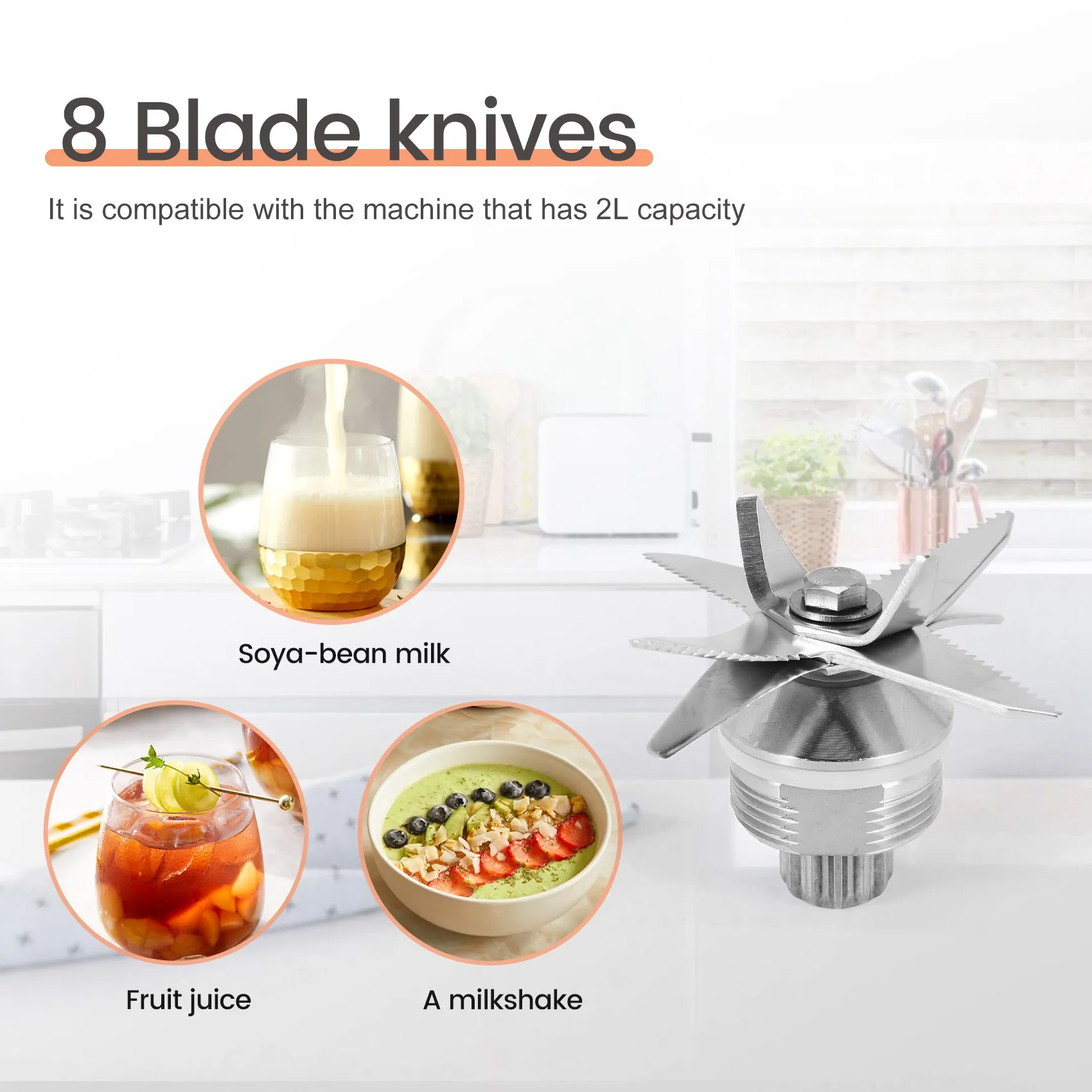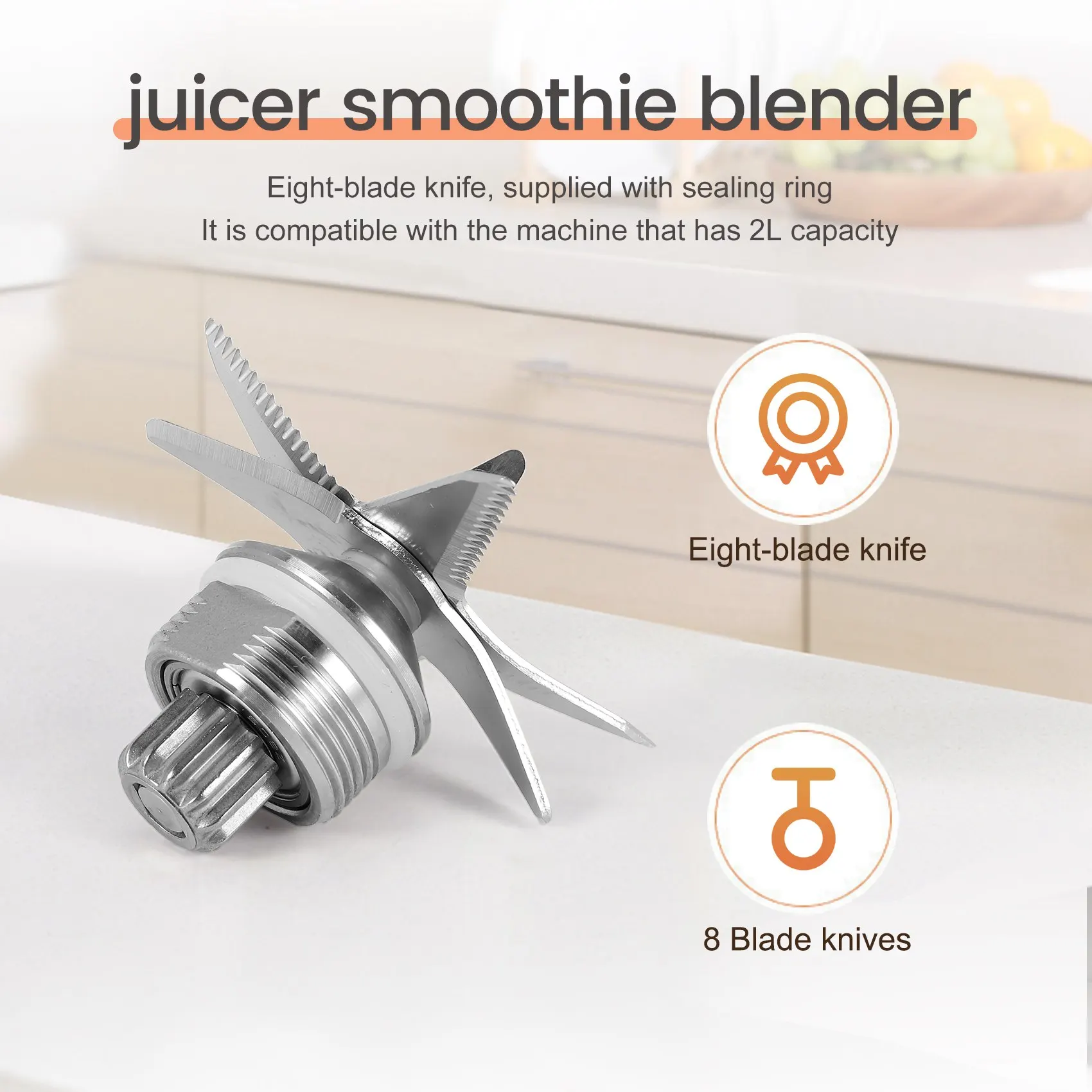 Experience effortless blending with this high-quality stainless steel eight-blade assembly designed specifically for your 2-liter capacity juicer or smoothie machine. The sleek silver finish and precision engineering make it not only durable but also visually appealing. The eight sharp, serrated blades are arranged radially around a robust central bolt, optimized for crushing ice, fruits, and vegetables efficiently. Included with the blades is a sealing ring that ensures a tight fit within your juicer, preventing leaks and maintaining optimal performance. This blade assembly offers a perfect upgrade to enhance your blending experience, ensuring smooth, consistent results every time. Imagine the ease of preparing your favorite smoothies or juices with this reliable, professionally crafted component.
