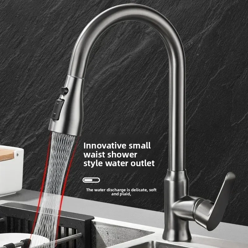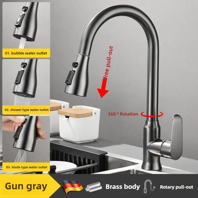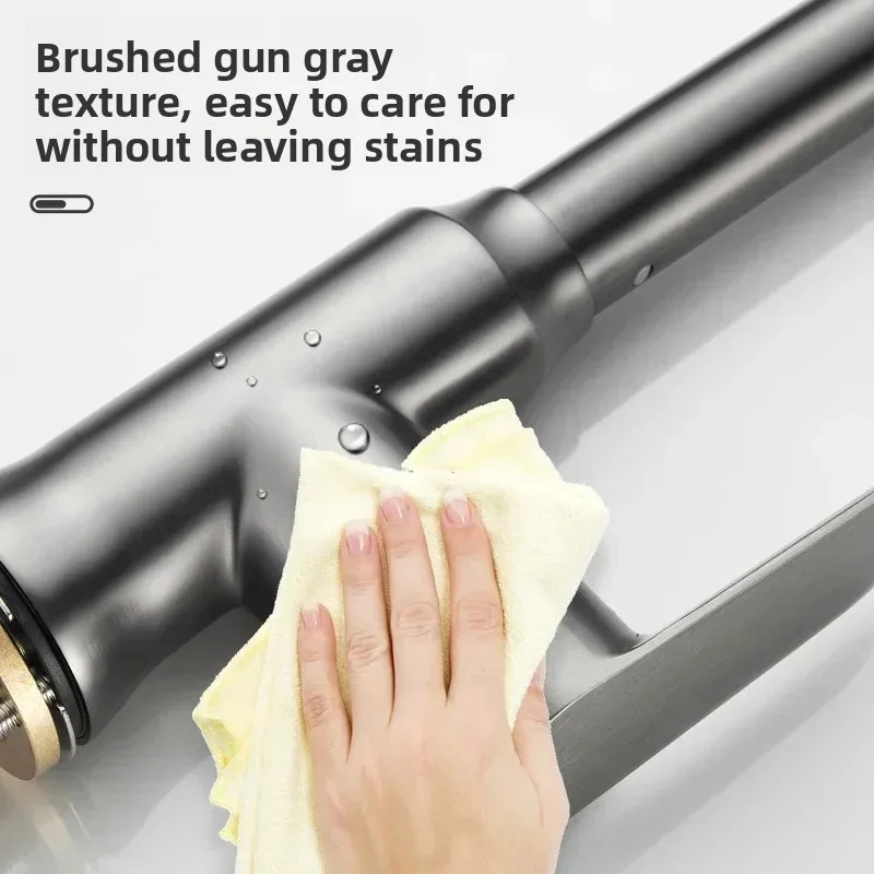 Experience the perfect blend of style, versatility, and durability with this sleek stainless steel kitchen faucet. Crafted from high-quality brass with a brushed finish, it offers a contemporary look that complements any modern kitchen. The high, curved spout provides ample clearance, while the 360° rotatable main body and 60 cm pull-out nozzle allow you to easily direct water exactly where you need it. The single lever handle ensures smooth control of hot and cold water, fitting comfortably at an ergonomic angle. Plus, with three distinct outlet modes—powerful blade, bubbly soft foam, and gentle shower—you can seamlessly switch between tasks like washing dishes, rinsing produce, or cleaning the sink area. This faucet combines aesthetic appeal with functional flexibility to elevate your kitchen experience.