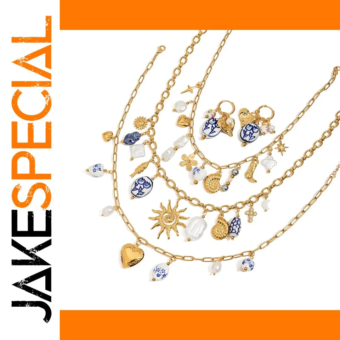 Discover the charm of this stunning layered gold chain necklace, crafted with a high-shine stainless steel finish that offers durability and elegance. The design features elongated oval-shaped links forming a modern silhouette, perfect for elevating any outfit. Adorned with delicate ceramic heart charms decorated with traditional blue floral patterns, it brings an artistic and sophisticated touch. Playful motifs, including gold hearts, stars, moons, and suns with radiating lines, are complemented by white faux pearls and pearl-like beads, adding texture and visual interest. Its intricate yet delicate craftsmanship makes it suitable for both casual and formal occasions. Feel confident and unique wherever you wear this versatile accessory, which is designed to enhance your personal style effortlessly.