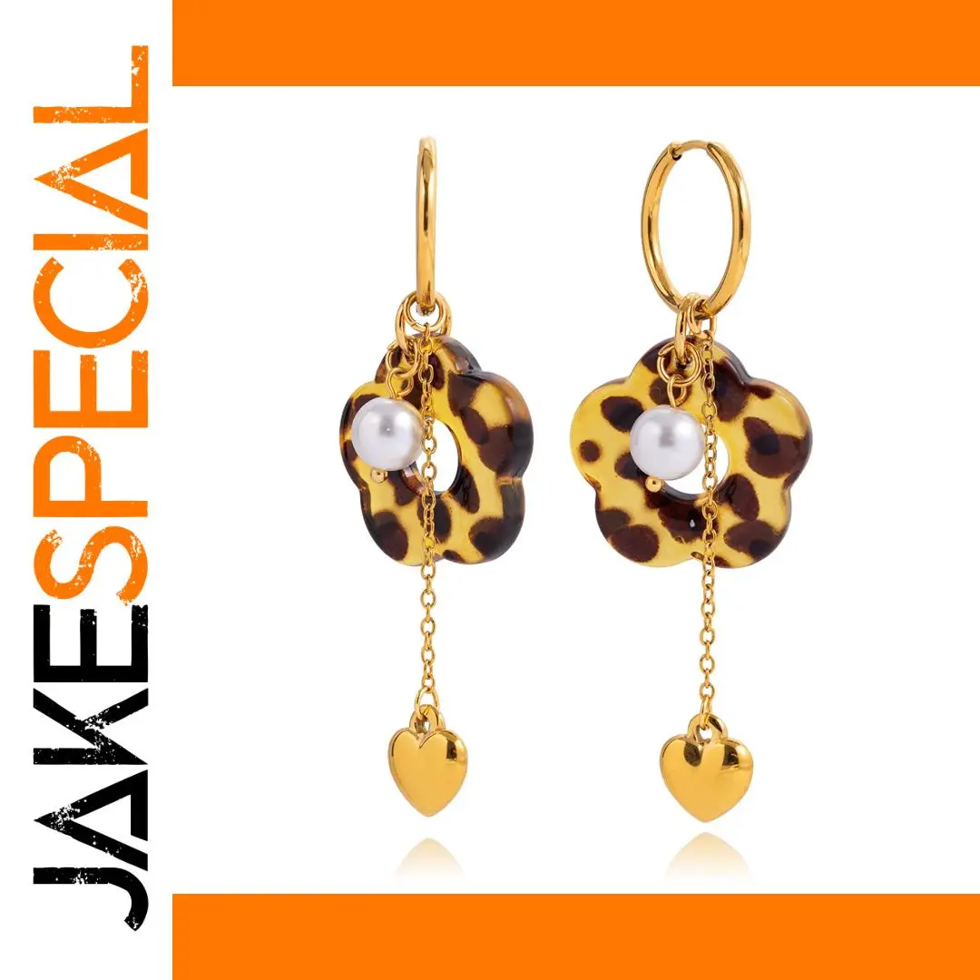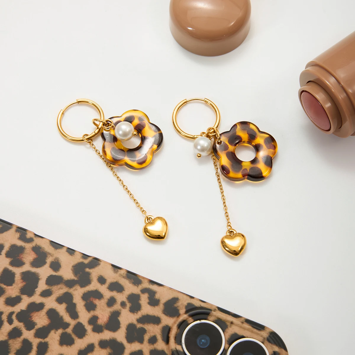 - Features acrylic floral charms with a vibrant tortoiseshell leopard print pattern, combined with a delicate chain connecting to a faux pearl and gold heart.