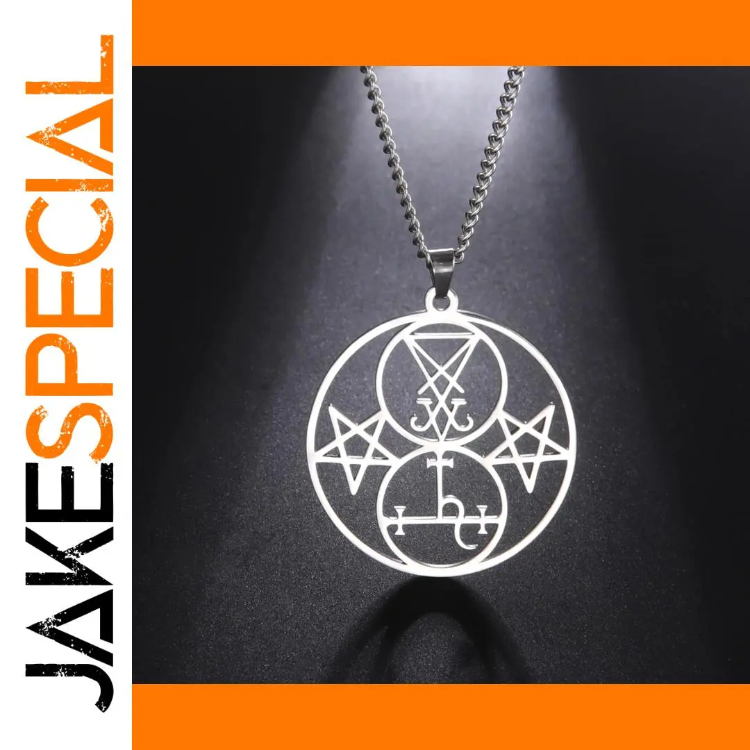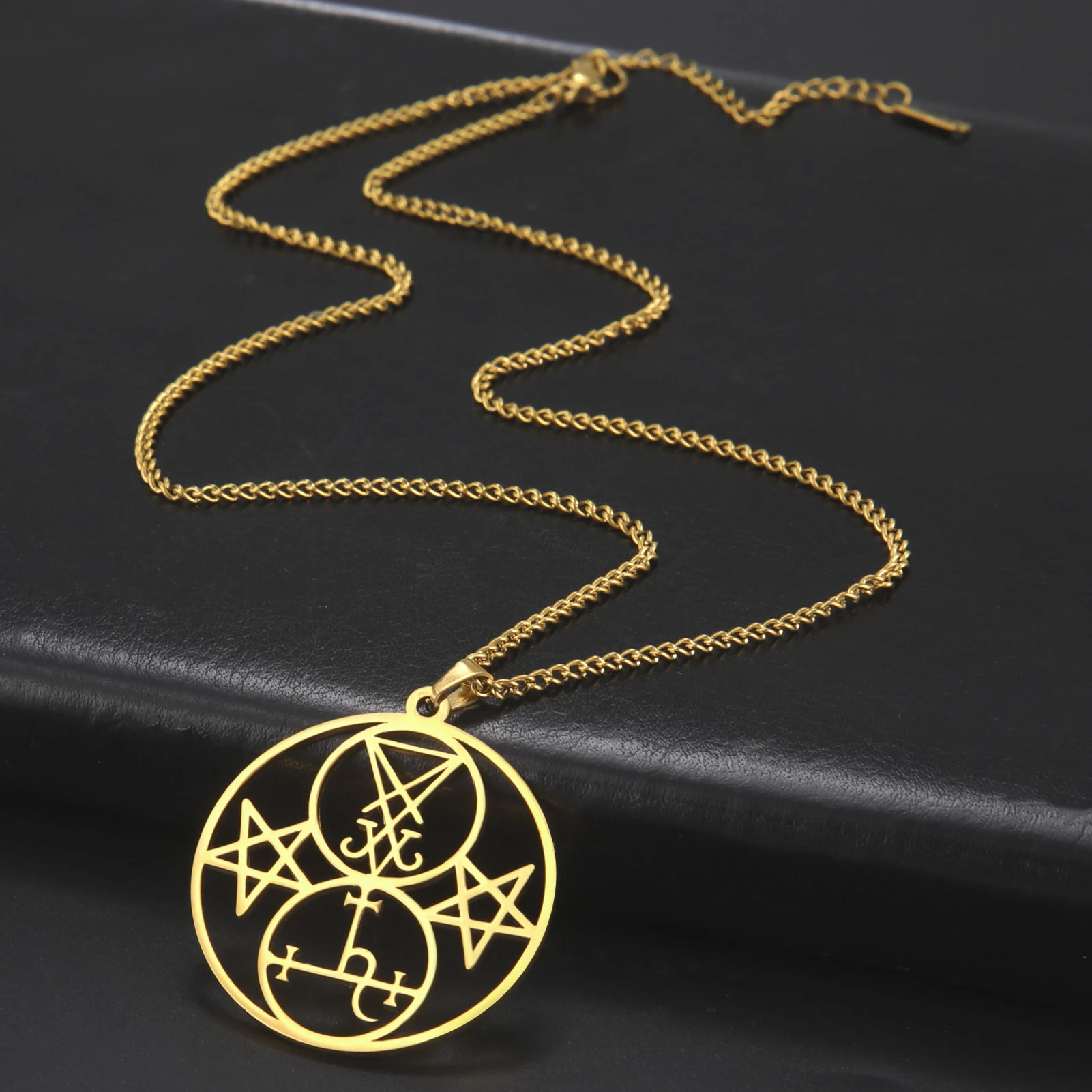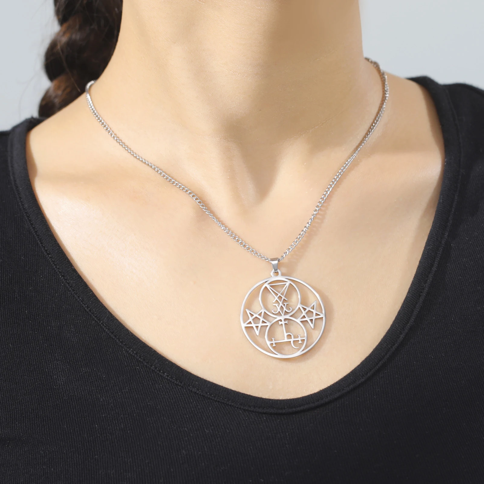 Immerse yourself in the striking elegance of this stainless steel pendant necklace featuring the iconic sigil of Lucifer Lilith double seal. Crafted with a polished, reflective surface, the circular pendant measures approximately 34.7 by 38 millimeters, showcasing intricate, vintage-inspired cutouts that blend geometric and symbolic elements. The detailed symmetrical pattern, adorned with five-pointed stars, exudes a timeless yet bold aesthetic. The durable link chain, available in high-gloss silver or gold tones, extends from 45 to 50 centimeters for versatile wear. Designed for both men and women, this necklace is perfect for special occasions like parties, anniversaries, or as a meaningful gift to a loved one. Its refined craftsmanship ensures lasting beauty and style.