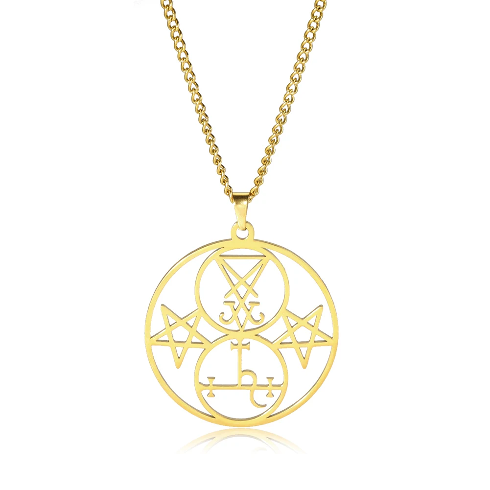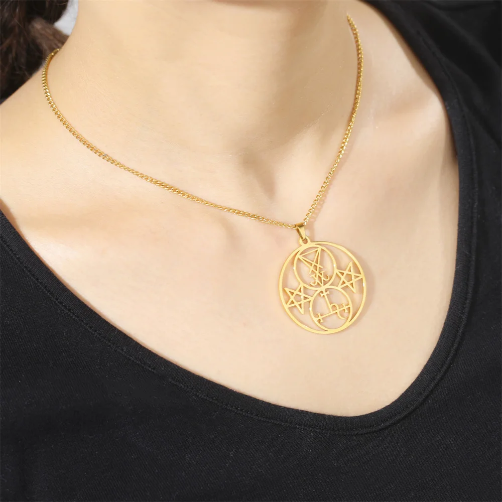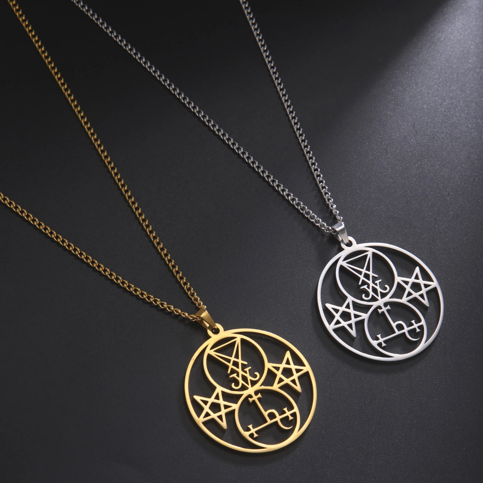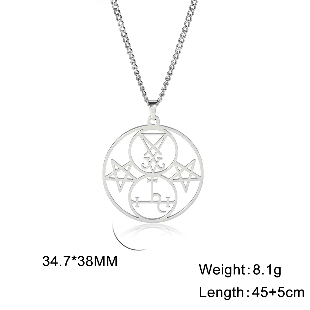 Immerse yourself in the striking elegance of this stainless steel pendant necklace featuring the iconic sigil of Lucifer Lilith double seal. Crafted with a polished, reflective surface, the circular pendant measures approximately 34.7 by 38 millimeters, showcasing intricate, vintage-inspired cutouts that blend geometric and symbolic elements. The detailed symmetrical pattern, adorned with five-pointed stars, exudes a timeless yet bold aesthetic. The durable link chain, available in high-gloss silver or gold tones, extends from 45 to 50 centimeters for versatile wear. Designed for both men and women, this necklace is perfect for special occasions like parties, anniversaries, or as a meaningful gift to a loved one. Its refined craftsmanship ensures lasting beauty and style.