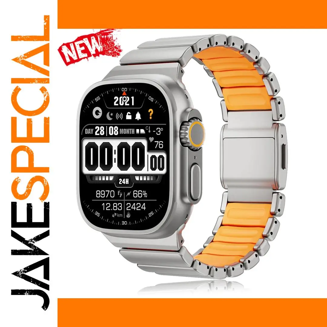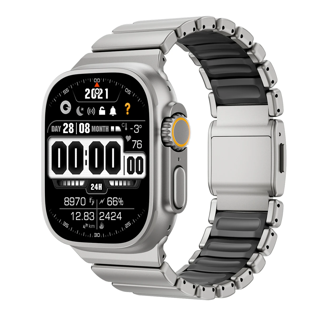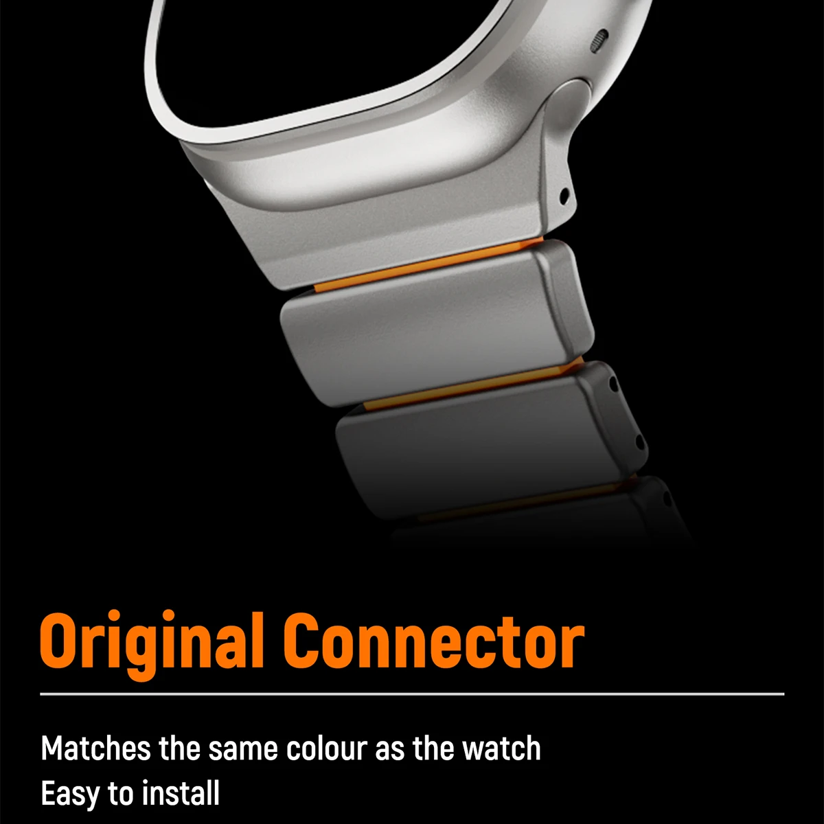 Enhance your Apple Watch experience with this sleek stainless steel and fluoroelastomer rubber magnetic band, compatible with models including Ultra 3, 2, 1 (49mm), Series 11 and 10 (46mm), Series 9, 8, 7 (45mm), and Series 6, 5, 4, SE (44mm). Designed with a polished silver finish and vibrant interior colors such as black, black-orange, black-yellow, titanium, titanium-orange, and titanium-yellow, this band combines durability and style. The magnetic buckle allows for secure and adjustable fit, making it perfect for various wrist sizes. Whether you prefer bold or subtle accents, this band offers a modern aesthetic and a comfortable fit.