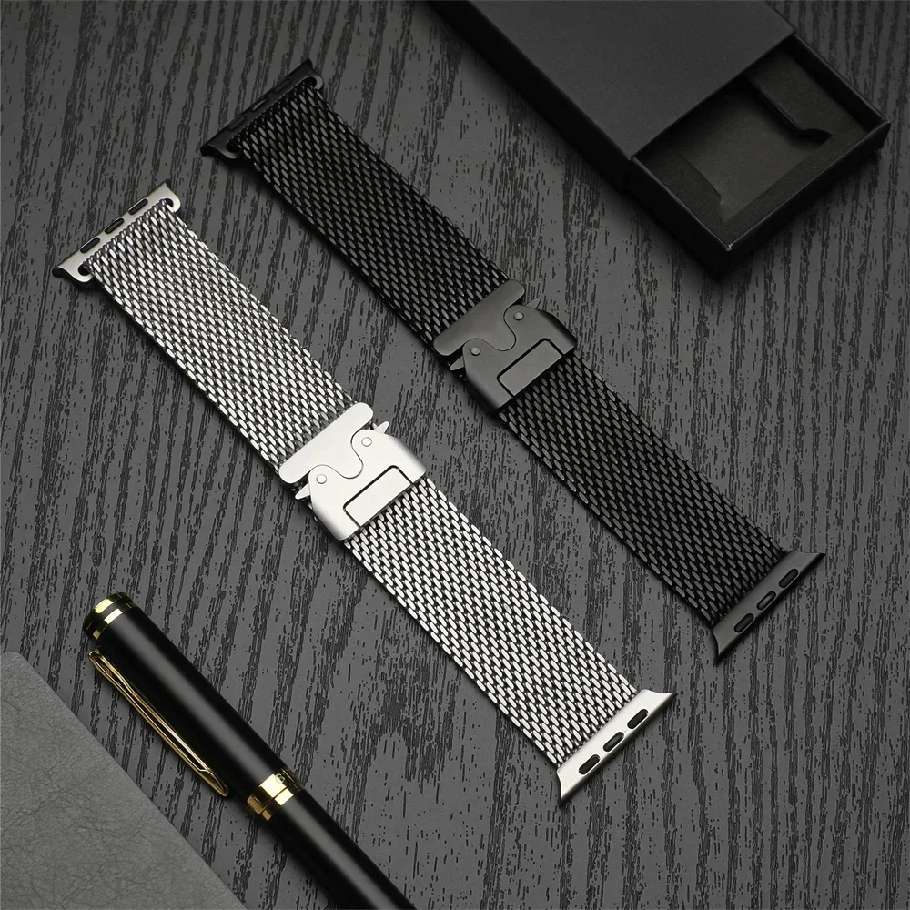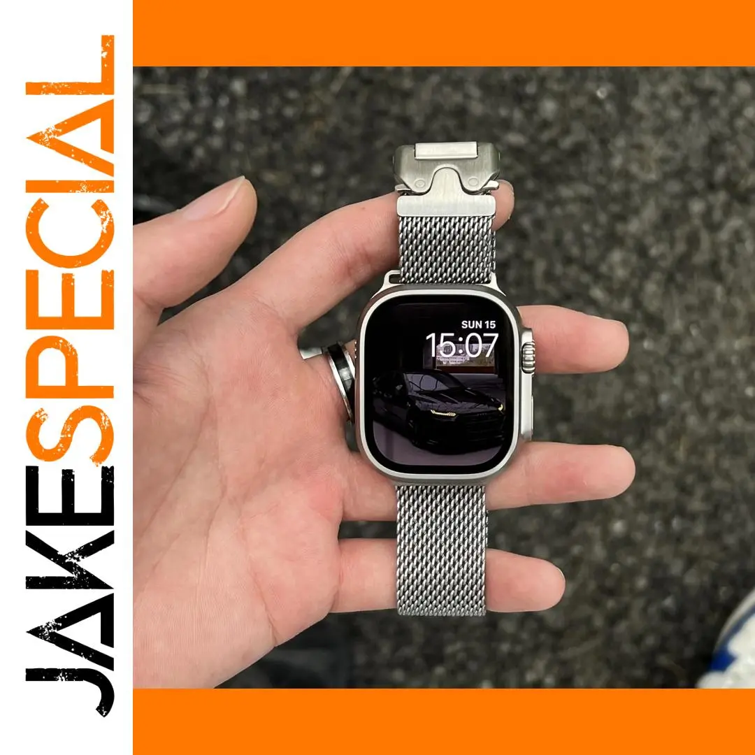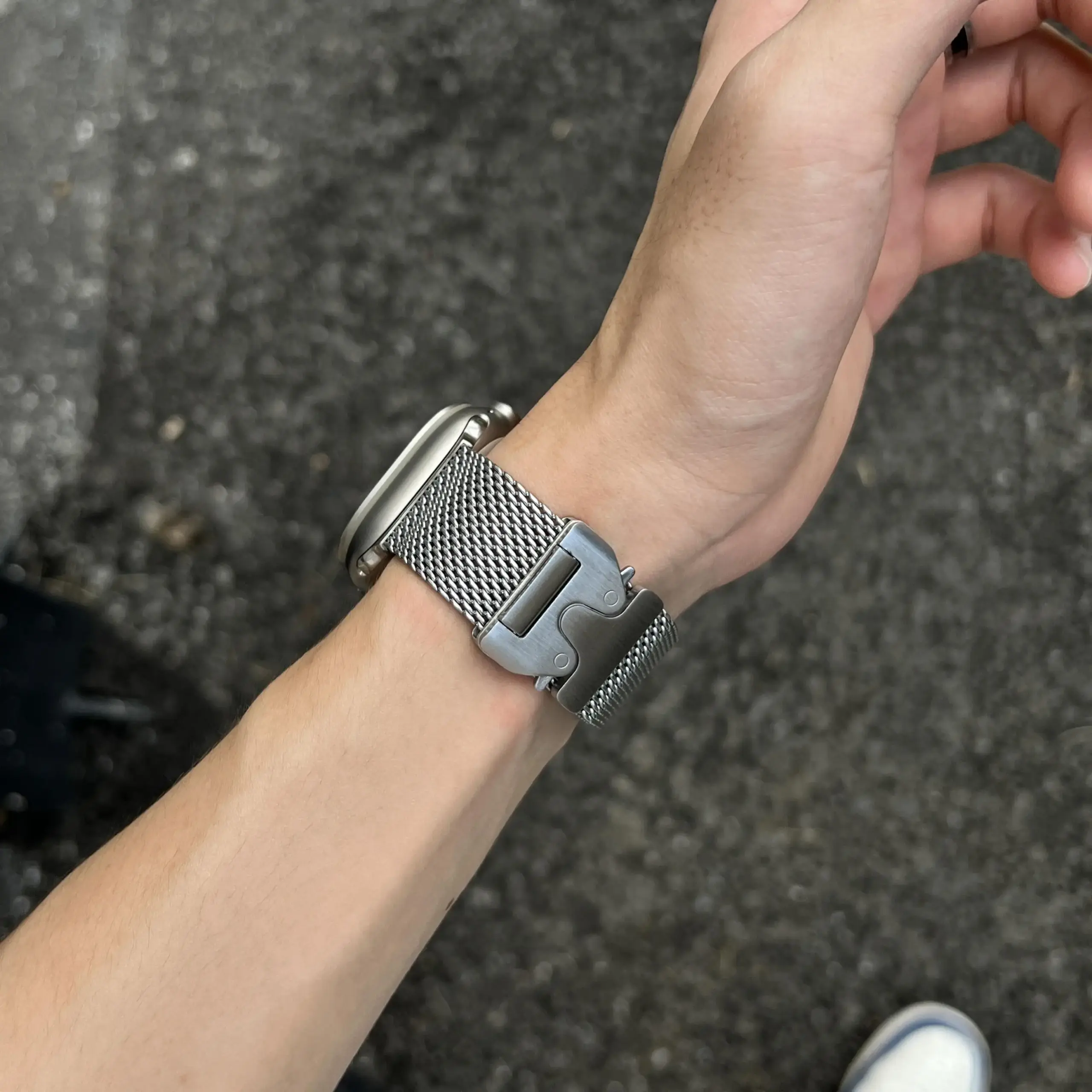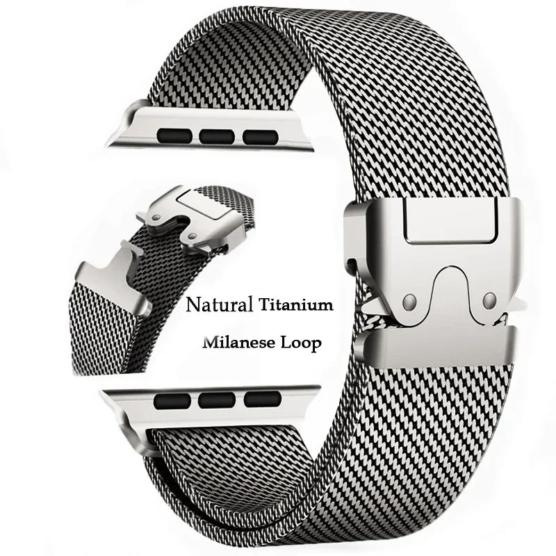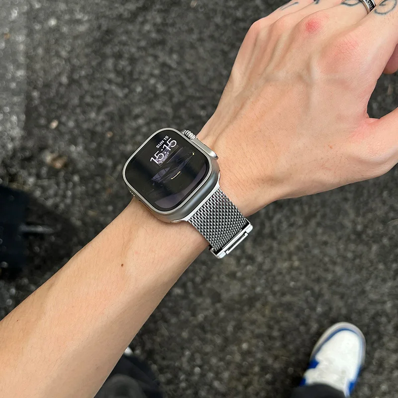 Immerse yourself in the sleek sophistication of this stainless steel Milanese loop band, designed exclusively for Apple Watch models from Series 3 to Series 10, including SE, Ultra 2, and more. Crafted with high-quality, durable stainless steel, it offers a refined mesh pattern that seamlessly combines form and function. The finely woven design assures a comfortable fit, while its silver, natural, or black titanium finishes add a modern touch to your device. With an adjustable clasp, you can effortlessly tailor the fit to your wrist, enhancing daily comfort and style. Elevate your look with this premium strap and enjoy a luxurious, minimalist aesthetic for all occasions—whether professional or casual.