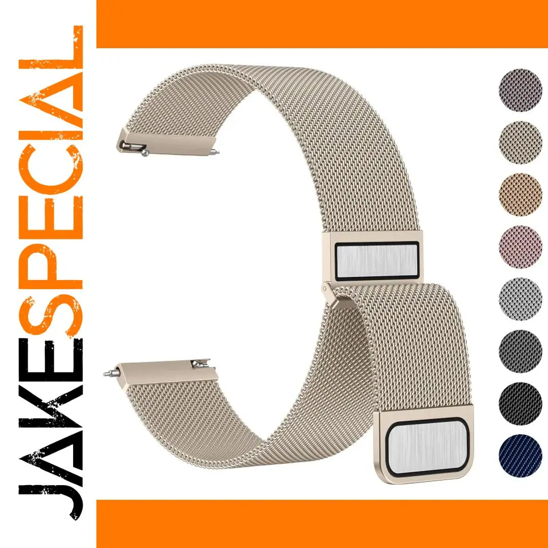 - Technical specifications include stainless steel material, 20mm or 22mm width options, magnetic clasp for ease of use, polished metallic finish, and support for watch models like Galaxy Watch 4 and 6, Galaxy Watch Active 2, Galaxy Watch 3, Huawei Watch GT series, Amazfit GTS and GTR series, Bip, Lite, and other compatible watches with standard lug widths.