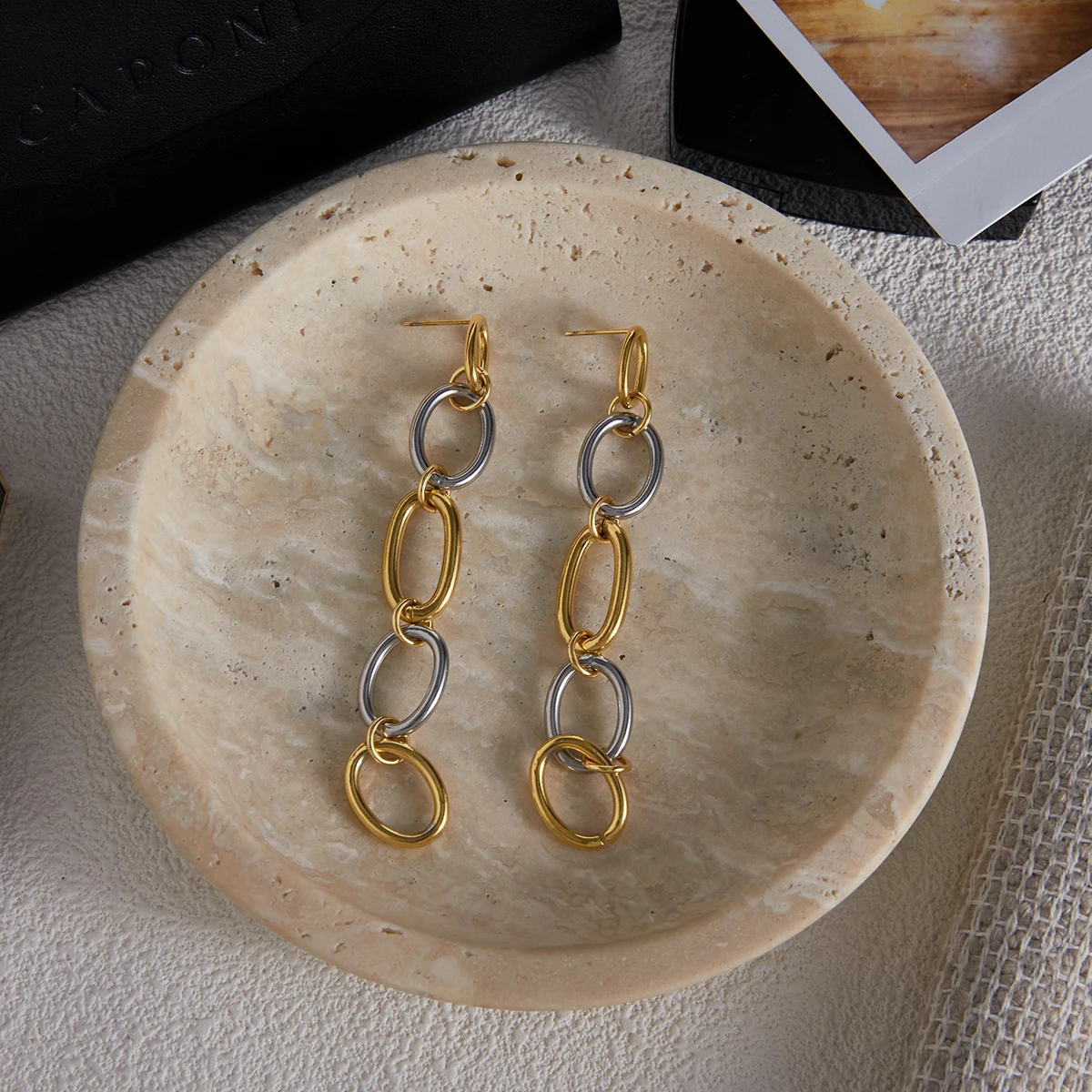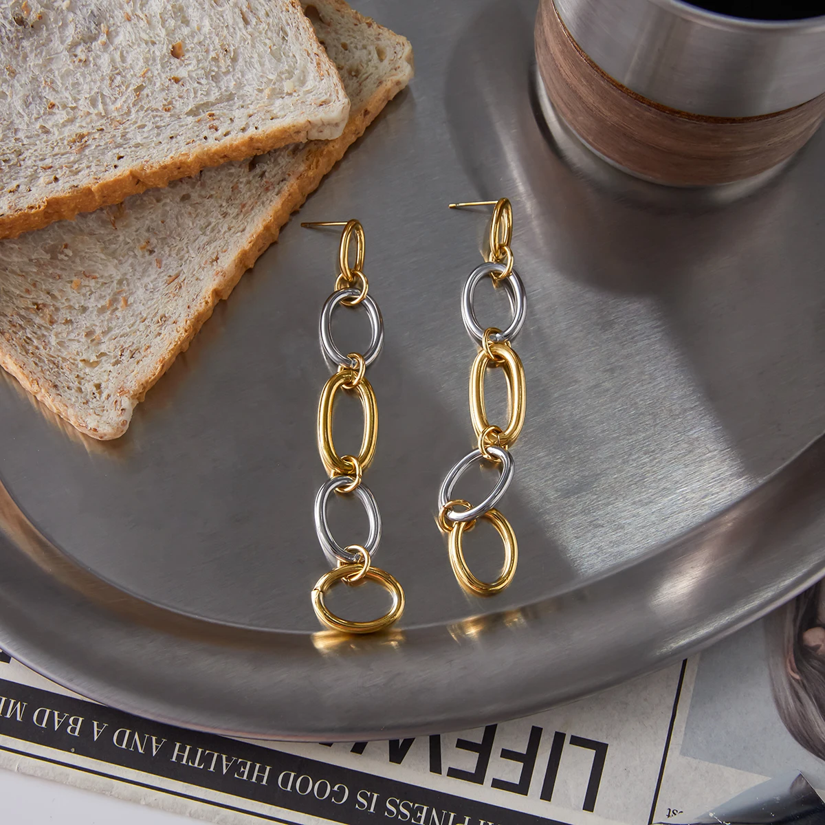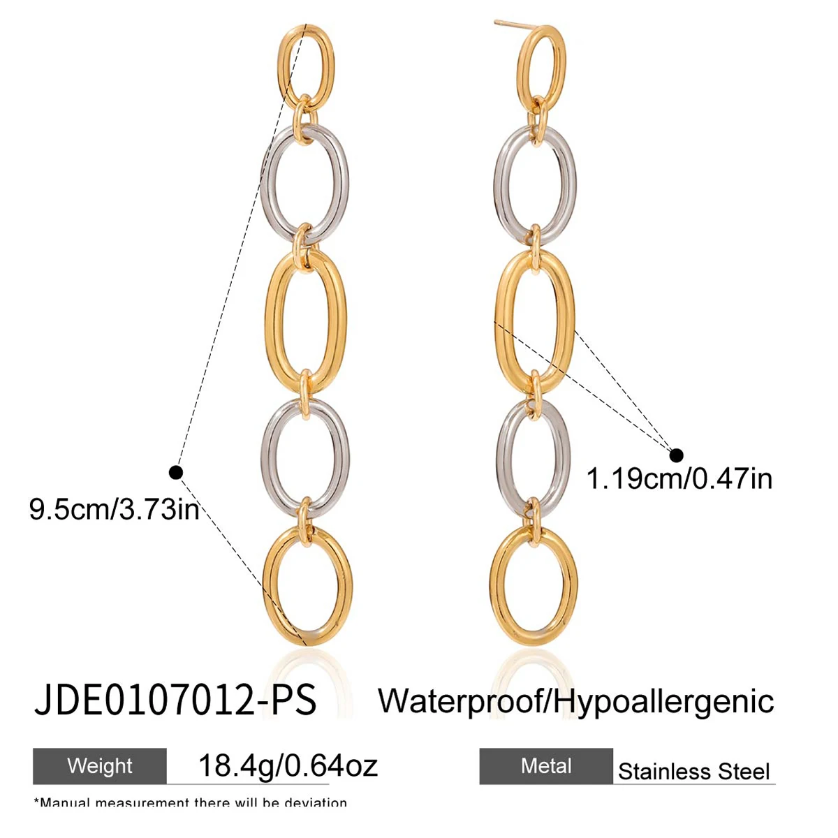 Enhance your accessory collection with these minimalist, trendy O-shaped earrings. Crafted from durable stainless steel, they feature a unique layered, chain-like design composed of four interlinked ovals—alternating between warm gold and cool platinum tones. Each oval has a subtly textured matte finish, adding sophisticated depth. Designed for women who appreciate modern elegance, these earrings are lightweight, hypoallergenic, and perfect for everyday wear. The secure push-back stud closure ensures comfort and stability. Whether you're dressing up for a special occasion or adding a chic touch to your daily look, these earrings offer a versatile, fashionable statement piece that complements any style.