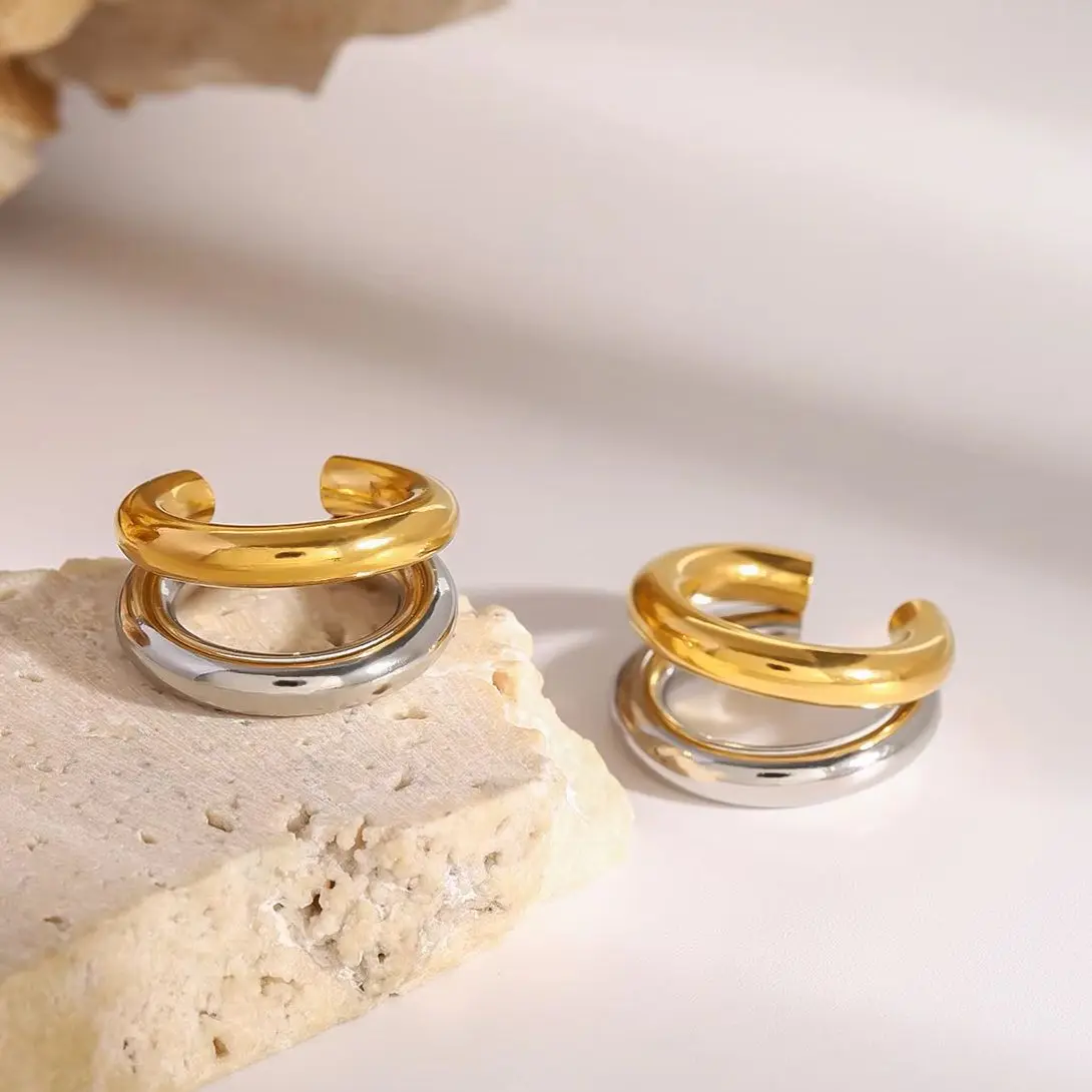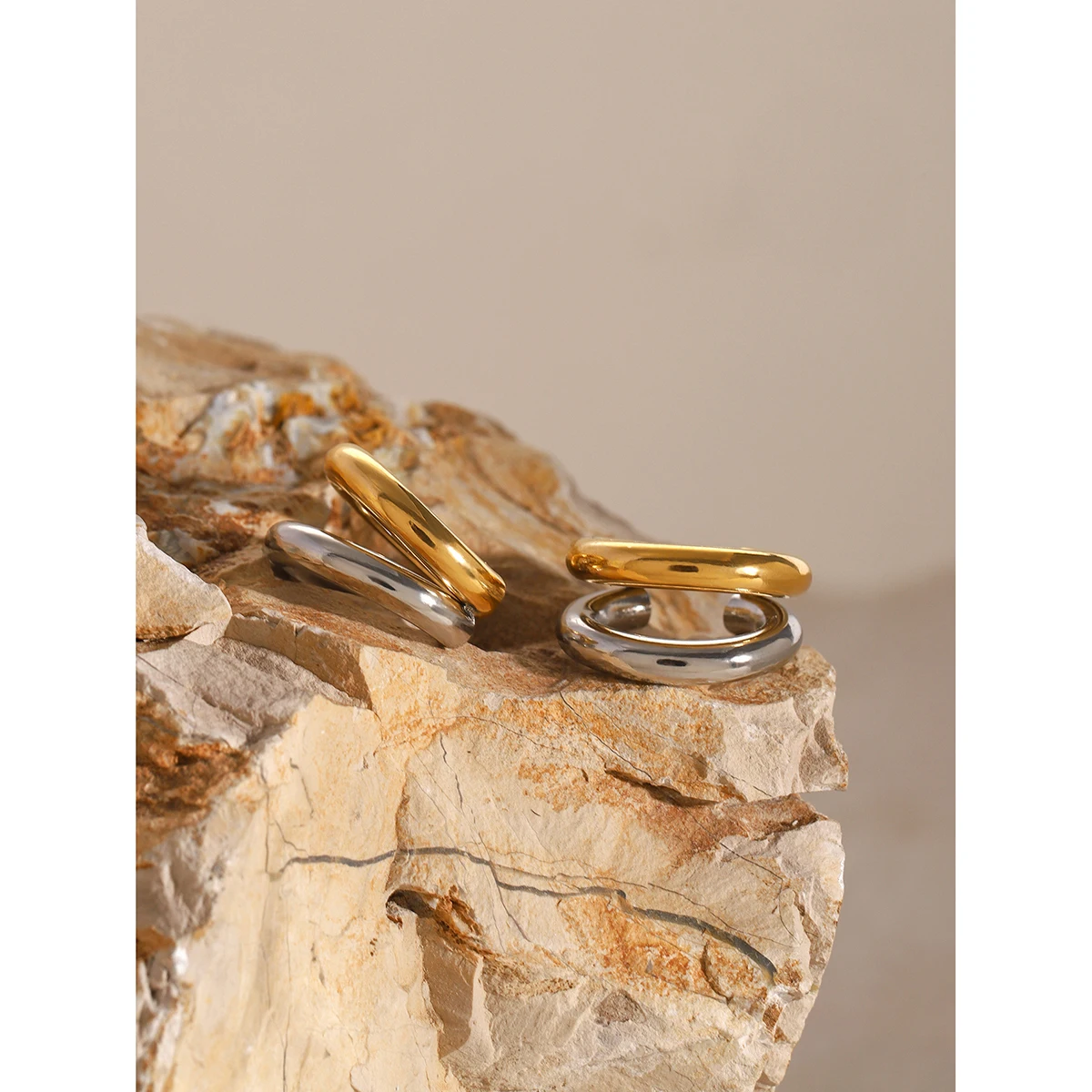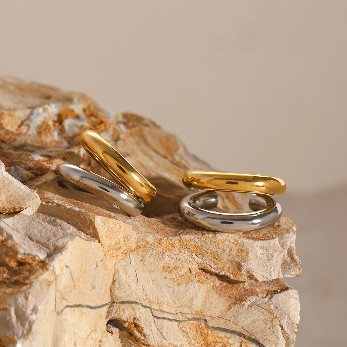 Experience effortless elegance with this pair of minimalist clip earrings, designed for modern fashion lovers. Crafted from durable stainless steel with a PVD gold finish, these earrings showcase a sleek, polished look that remains vibrant for years. The contrasting silver and gold tones create a balanced, versatile style perfect for daily wear or special occasions. Weighing only 10.8 grams, they offer a comfortable fit without sacrificing durability or luxury. The smooth, rounded shape catches light beautifully, adding a subtle shimmer to your look. Their waterproof design and nickel-free composition ensure safety and longevity, making them an ideal accessory for those seeking both fashion and dependability. Elevate your jewelry collection with these timeless, trendy pieces.