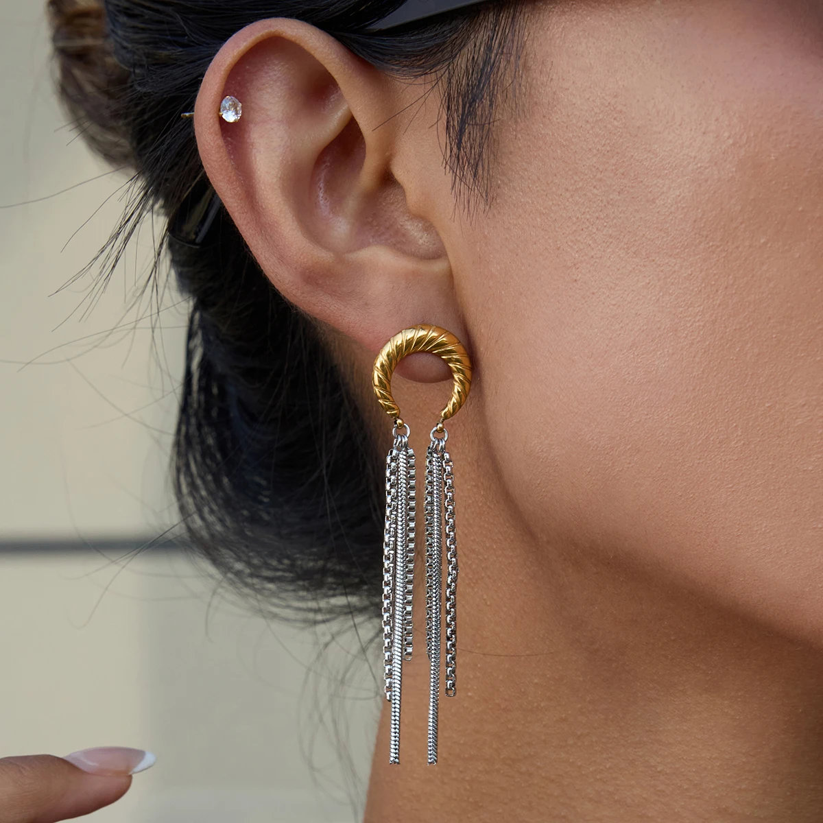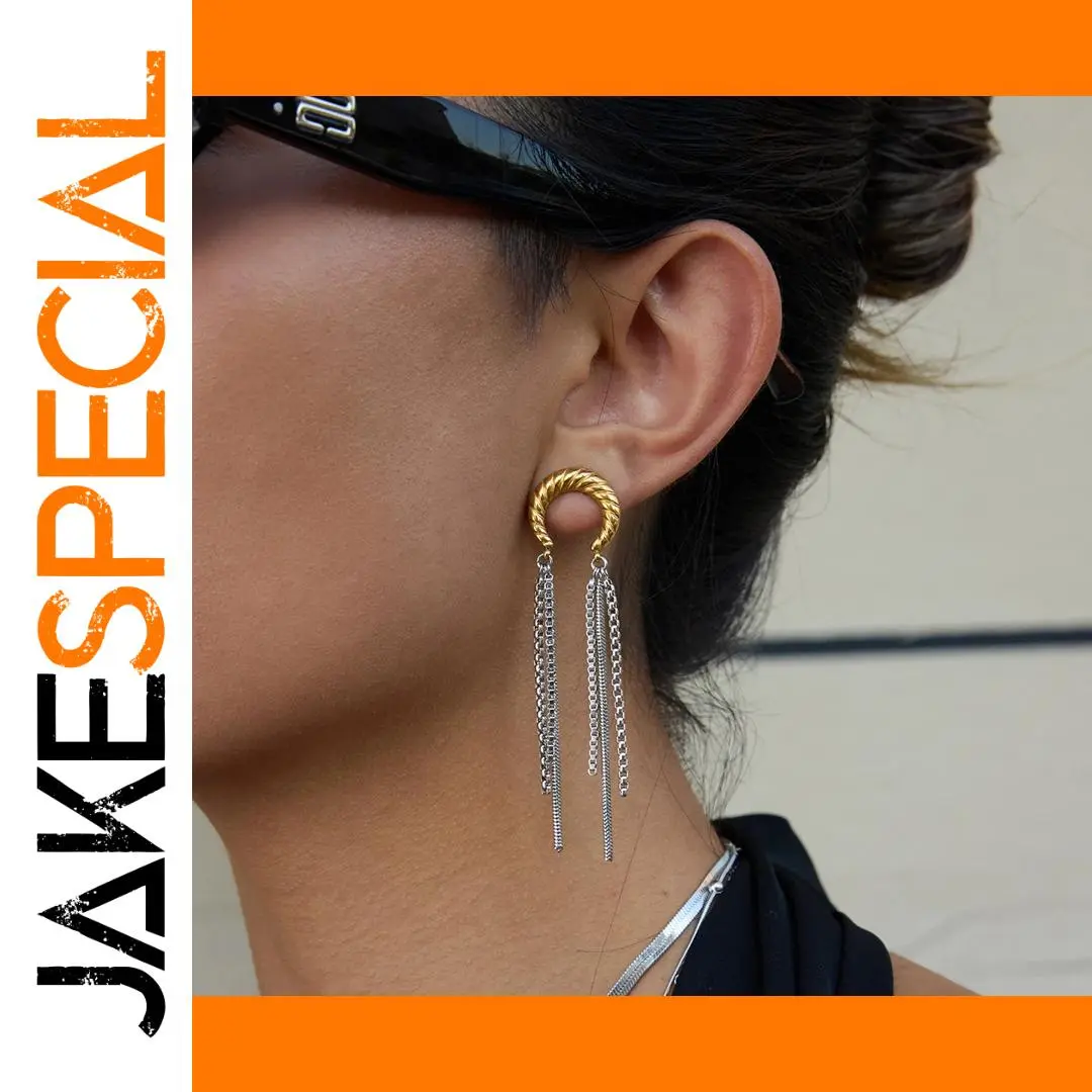 The pair of earrings will effortlessly add a touch of modern elegance to your look, whether you're heading to a social event or dressing up for a special night. Their trendy two-tone finish and layered chain design make them stand out, ensuring you'll receive compliments wherever you go. Trust in their durable stainless steel construction and timeless design to stay beautiful season after season. Treat yourself today to these fashionable earrings and enjoy a versatile accessory that enhances your personal style with confidence.