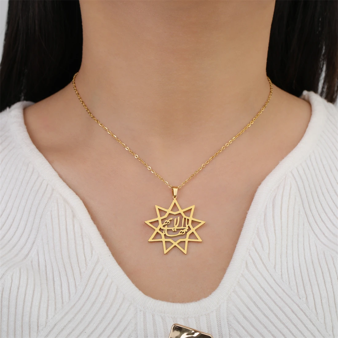 Experience the timeless beauty of this stunning necklace, crafted from durable stainless steel that resists rust, fading, and corrosion. Its versatile design features a delicate chain length of 45+5 cm, available in either a sophisticated silver or radiant gold finish. The pendant showcases a meticulously crafted Nine Point Star symbol inspired by the Bahai Bahaism faith, combining intricate geometric patterns with flowing calligraphy. Perfect for expressing faith or making a meaningful gift, this necklace combines traditional symbolism with modern elegance. Suitable for all genders and various occasions such as weddings, parties, or memorable celebrations, it offers a harmonious blend of style and spiritual significance. Elevate your jewelry collection with this exquisite piece that embodies grace and durability.
