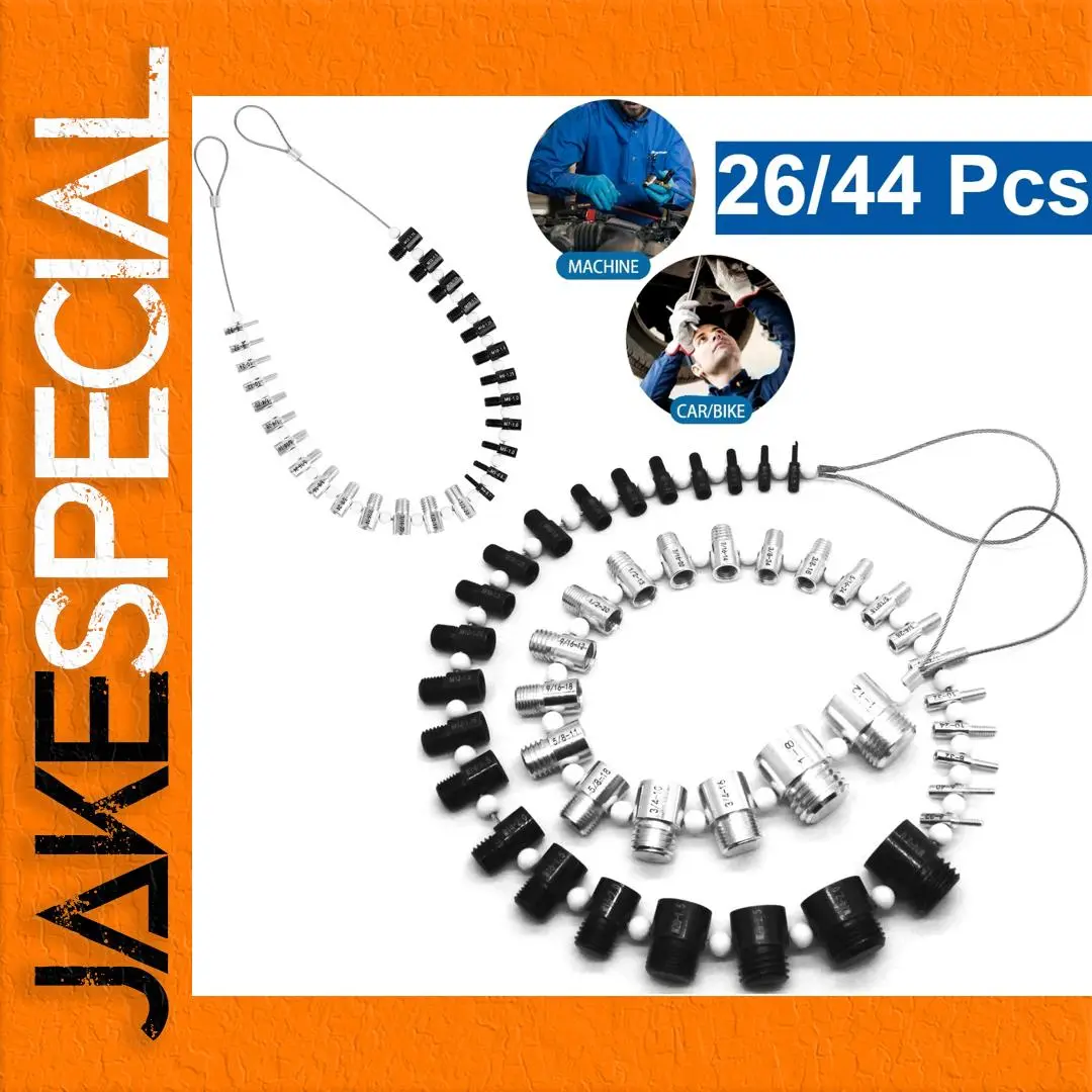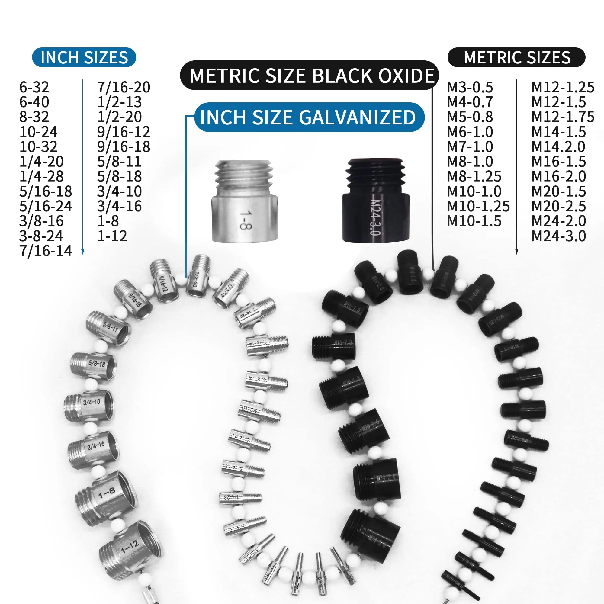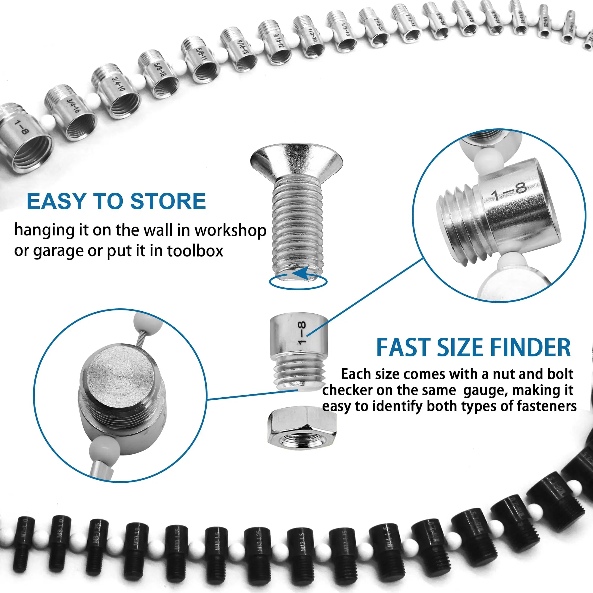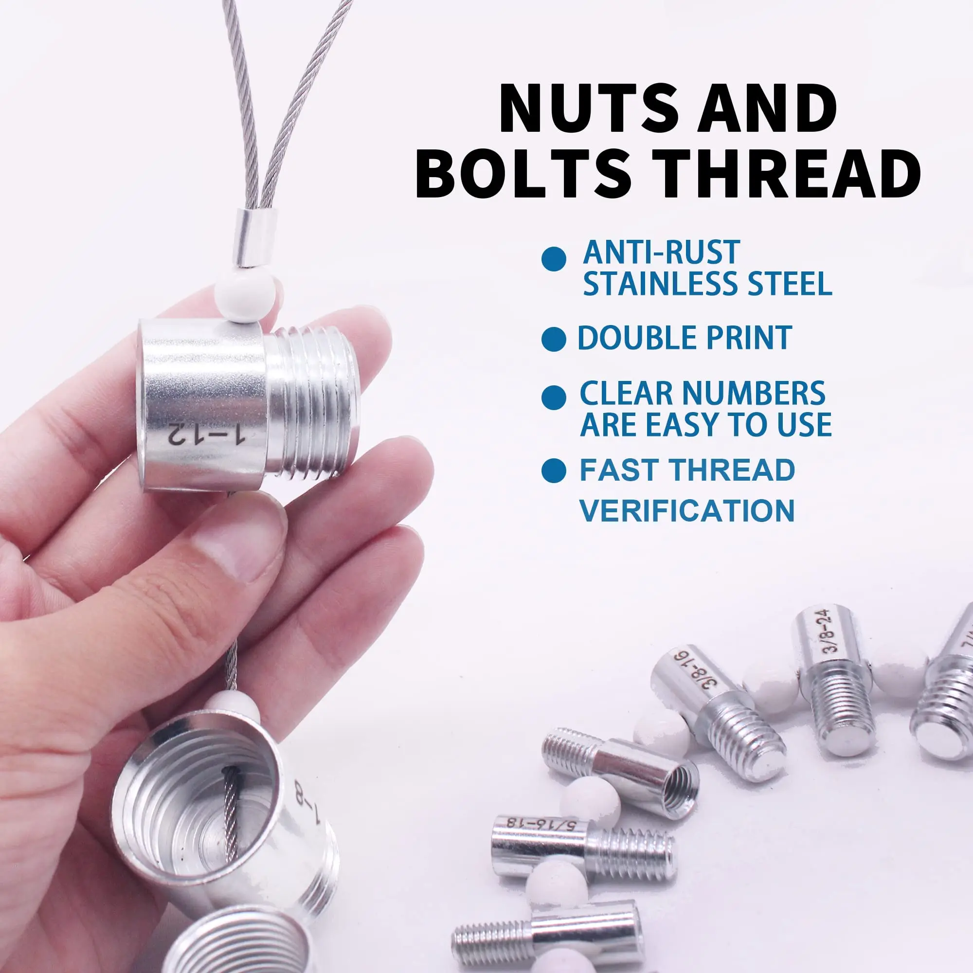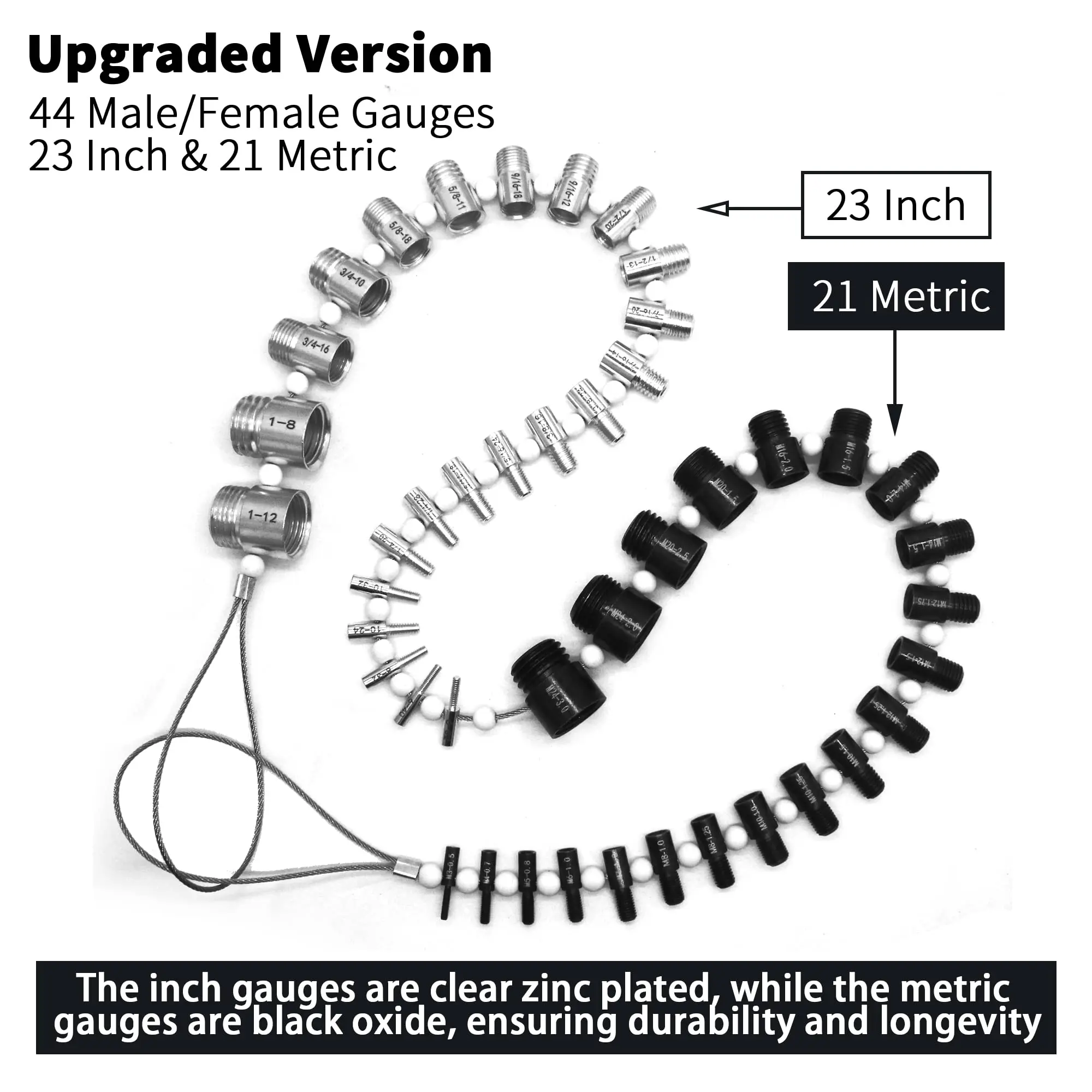 Experience precise and reliable nut and bolt inspection with this durable stainless steel thread checker set, available in 26-piece and 44-piece variants. The 44-piece set includes 23 metric sizes from M3x0.5 to M24x3.0 and 21 imperial sizes such as 6-32, 1/4-20, and 3/8-24, while the 26-piece set features 12 metric sizes from M4x0.7 to M12x1.75 and 14 imperial sizes like 6-32 to 1/2-20. Marked with permanently stamped measurements—black oxide for metric and zinc plated for inch sizes—these gauges are mounted on wire cables, ensuring quick, accurate, and efficient thread checking in industrial, repair, or DIY applications.