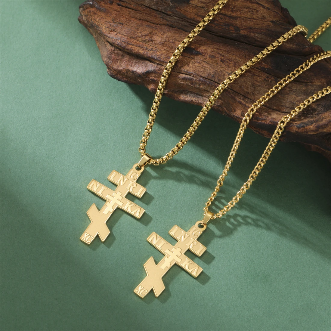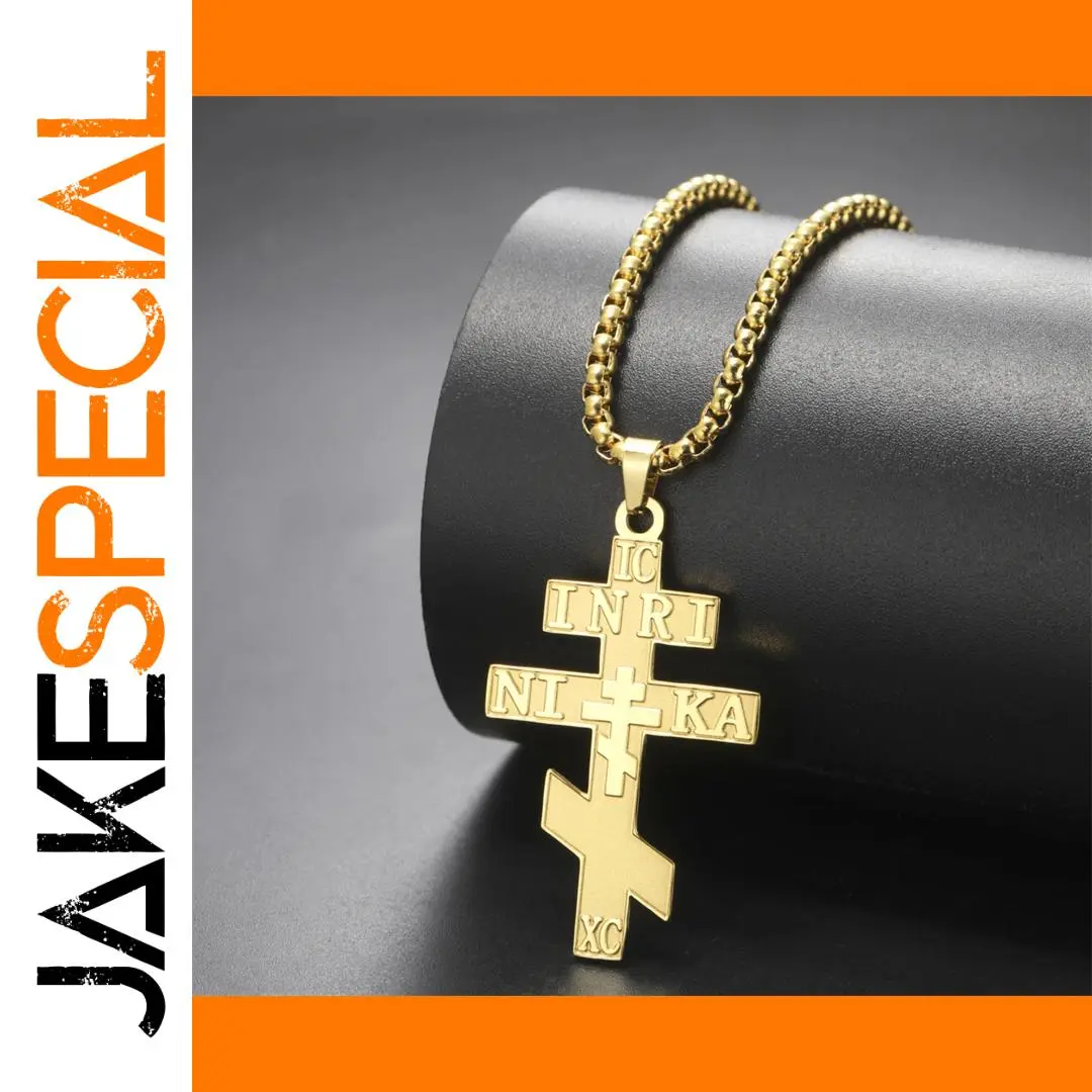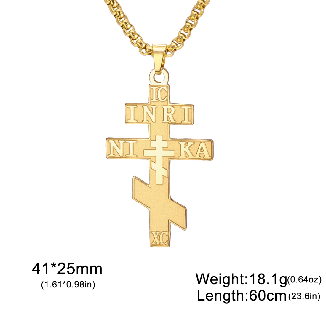 Experience timeless elegance with this unisex Orthodox Church Cross Pendant Necklace crafted from durable stainless steel. Measuring 41x25mm, the cross features intricate engraved symbols including “IC,” “XC,” and “INRI,” highlighted by a smaller cross at the intersection for added symbolism. Available in a polished silver or gold finish, the necklace features a sturdy 60cm box chain or 3mm link chain options, designed for everyday wear and special occasions alike. Resistant to rust, corrosion, and fading, this non-allergenic, anti-acid, and anti-alkali jewelry combines religious significance with modern style, making it a meaningful addition to your collection.