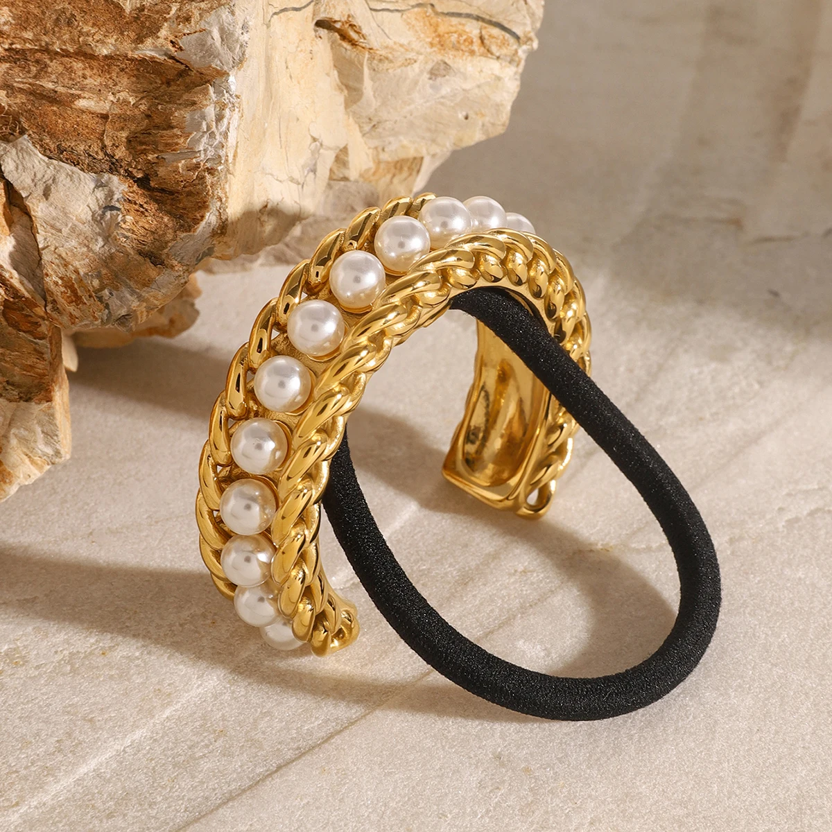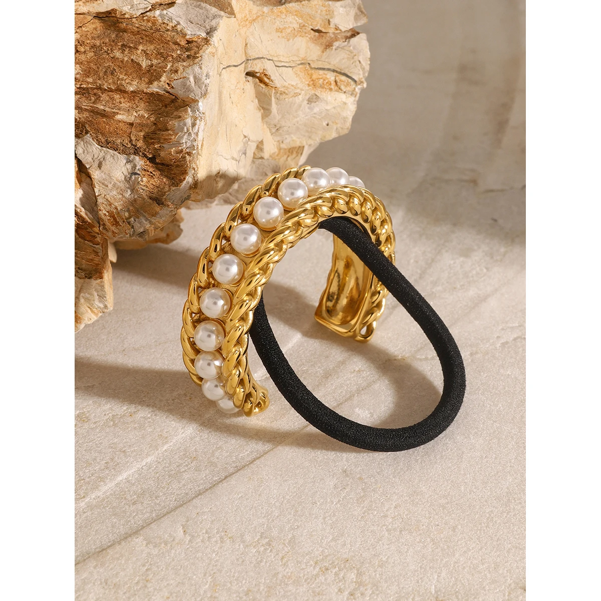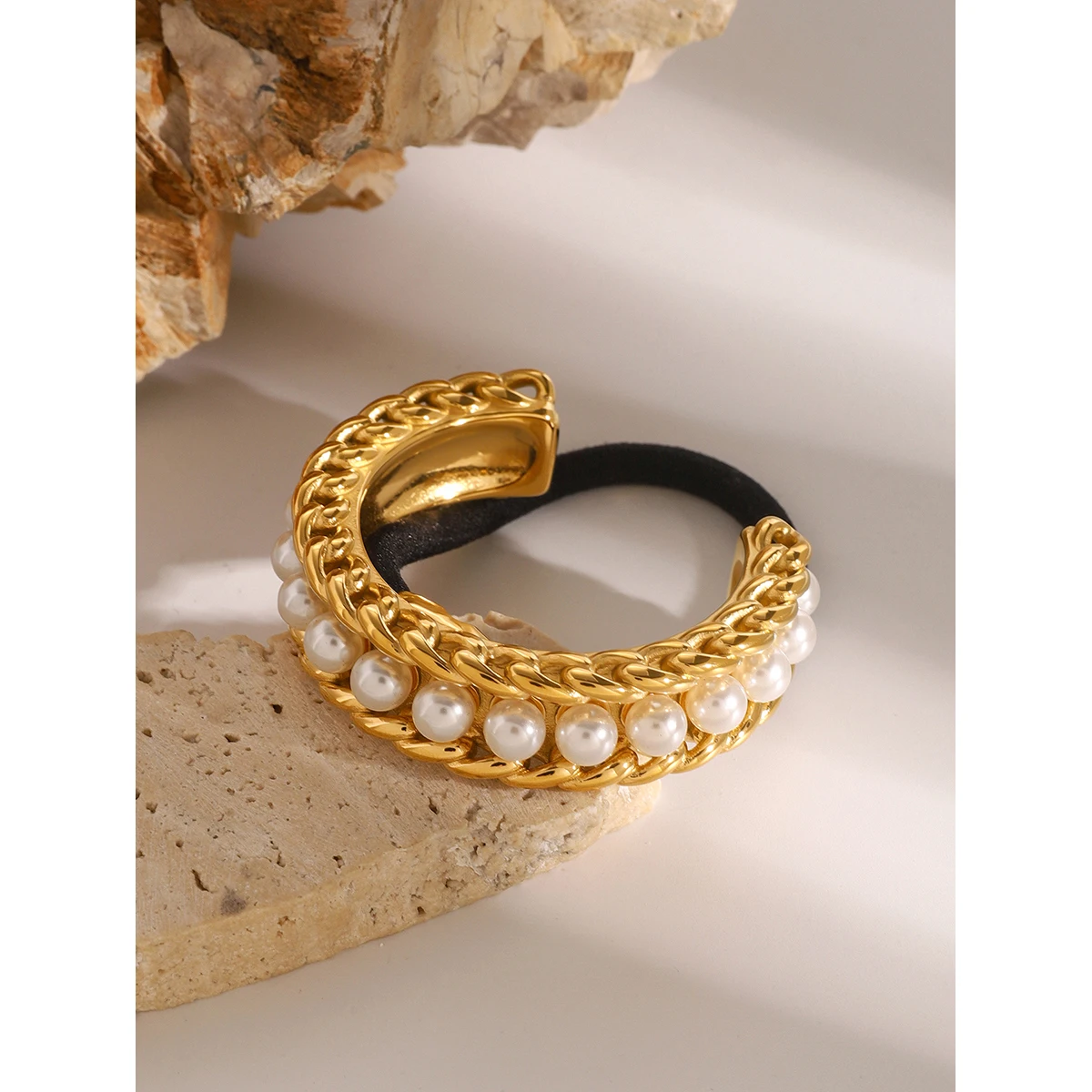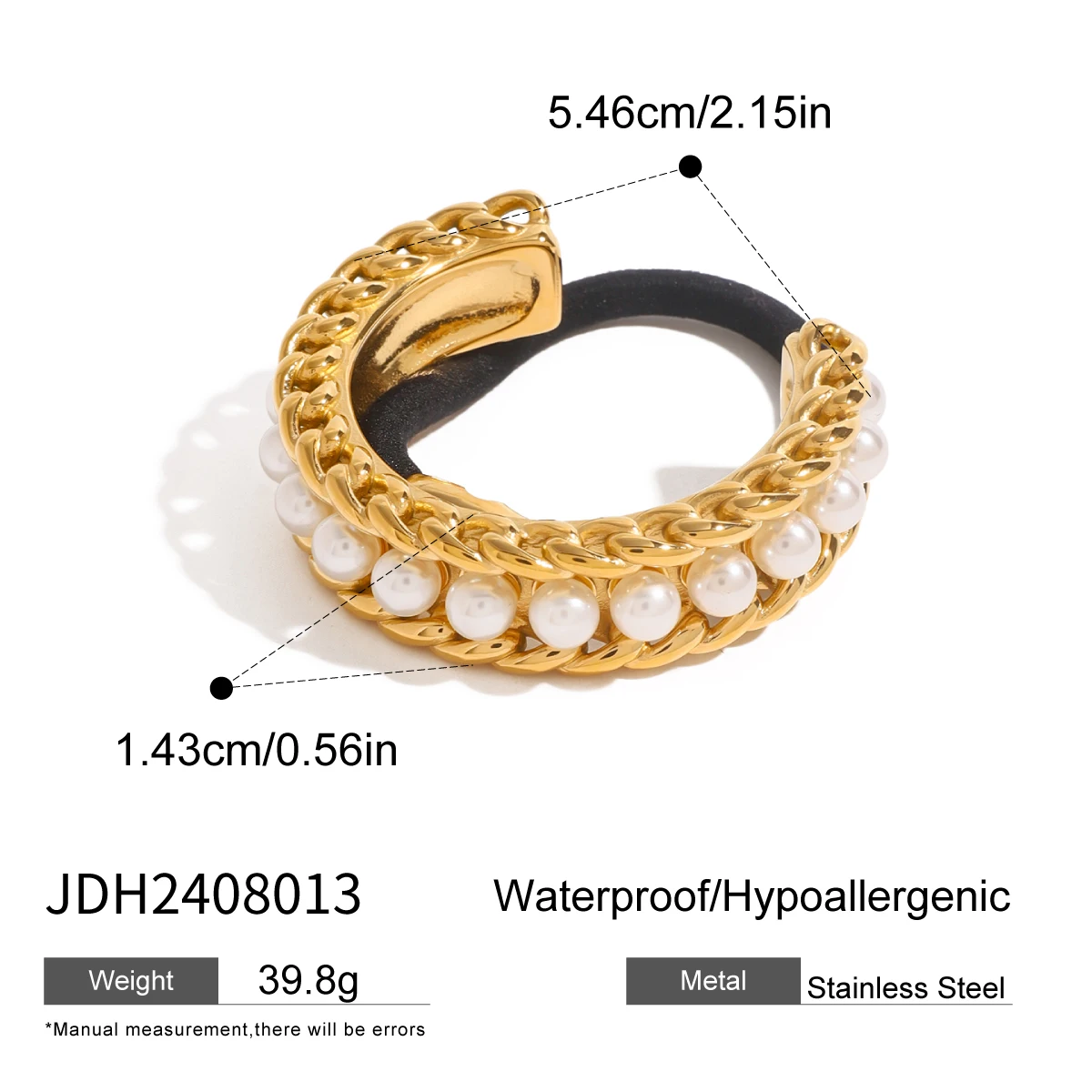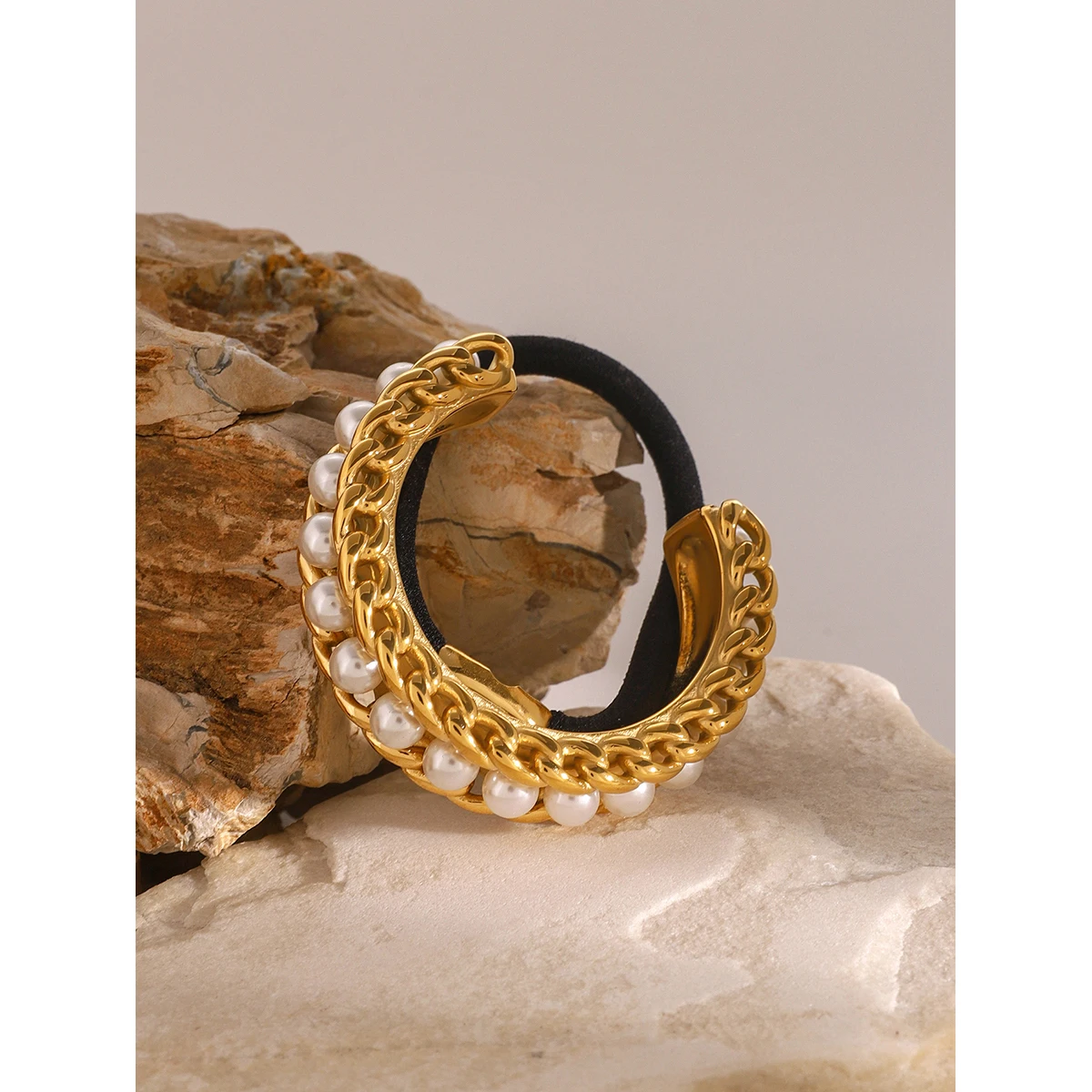 Imagine elevating your everyday look with this chic and modern headband. Crafted from durable stainless steel, it features a sleek black C-shaped band wrapped in soft fabric for all-day comfort. Embellished with a stunning gold-colored PVD stainless steel adornment, it showcases a chunky, interlinked chain detail, exuding bold contemporary style. Accentuated by perfectly spaced, lustrous white faux pearls, this accessory seamlessly blends sophistication and trendiness. Lightweight at just 13 grams, it offers effortless elegance while being waterproof and resistant to scratches and fading. Perfect for those who want a luxurious touch to their wardrobe, this headband transforms any outfit into a fashion statement and is ideal for daily wear or special occasions.