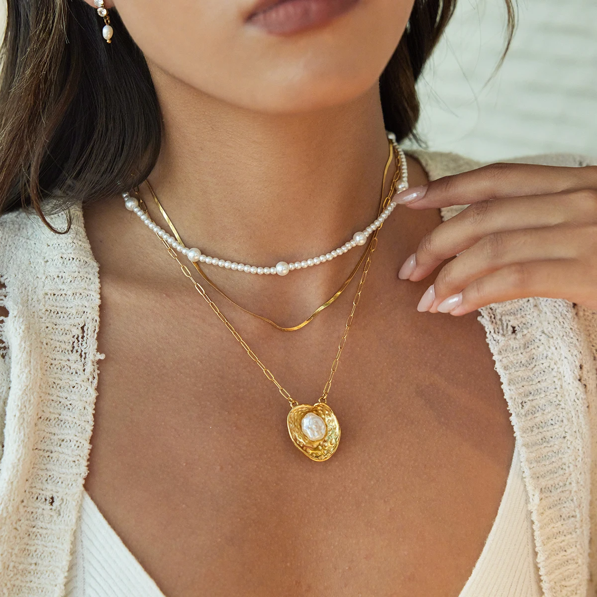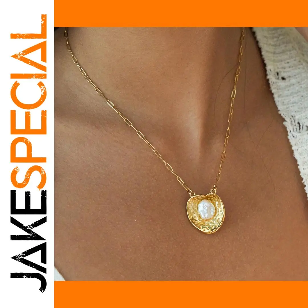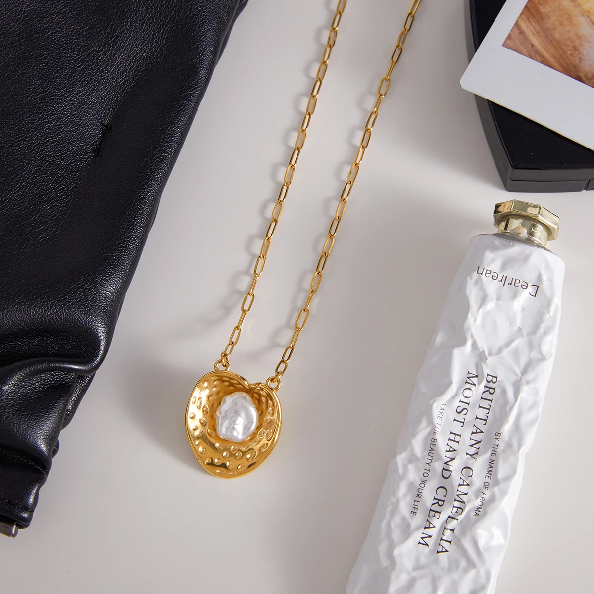 Experience an effortlessly chic look with this fashion-forward, elegant necklace featuring a stunning pearl pendant. Crafted from durable stainless steel with a stylish PVD gold finish, it offers sophistication and modernity in one piece. The highlighted geometric design combines organic irregularities with contemporary lines, making it perfect for party occasions or casual outings. The delicate, elongated chain with oval-shaped links creates a trendy silhouette that enhances any outfit, adding a touch of luxurious charm. The textured gold-tone pendant is uniquely shaped like an irregular heart or teardrop, adorned with small, rounded indentations for subtle organic appeal. A lustrous pearl centerpiece completes this sophisticated piece, elevating your style instantly and making you stand out.