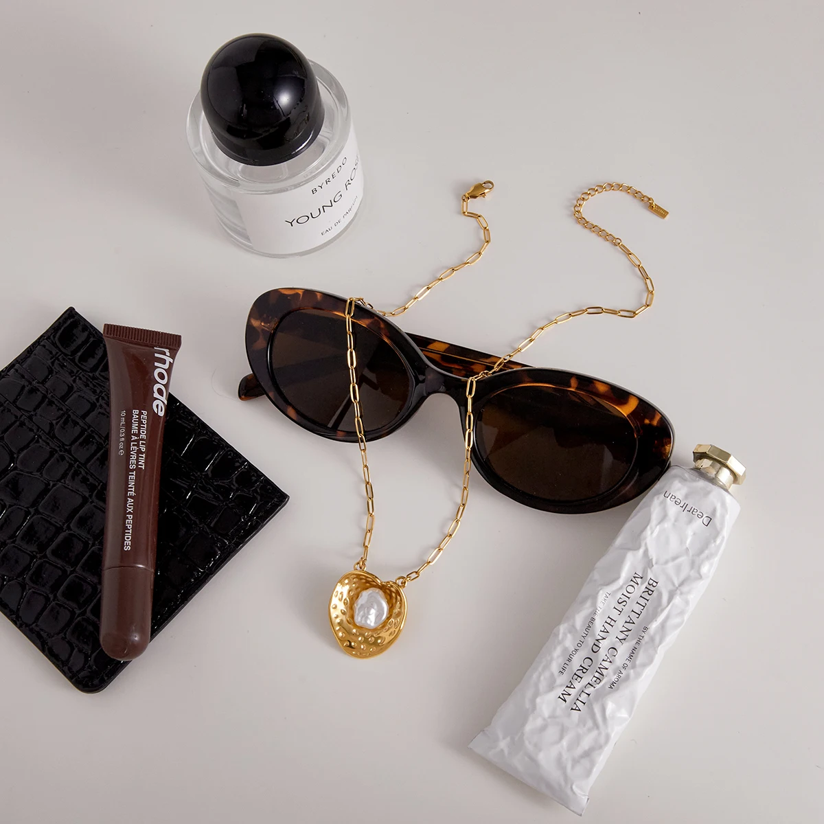 - Technical specifications include stainless steel material, PVD gold finish, irregularly shaped pendant with a lustrous white pearl, and compatibility with all attire, making it a versatile and stylish accessory.