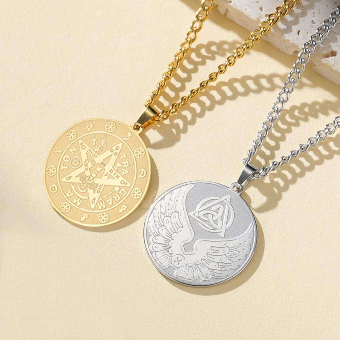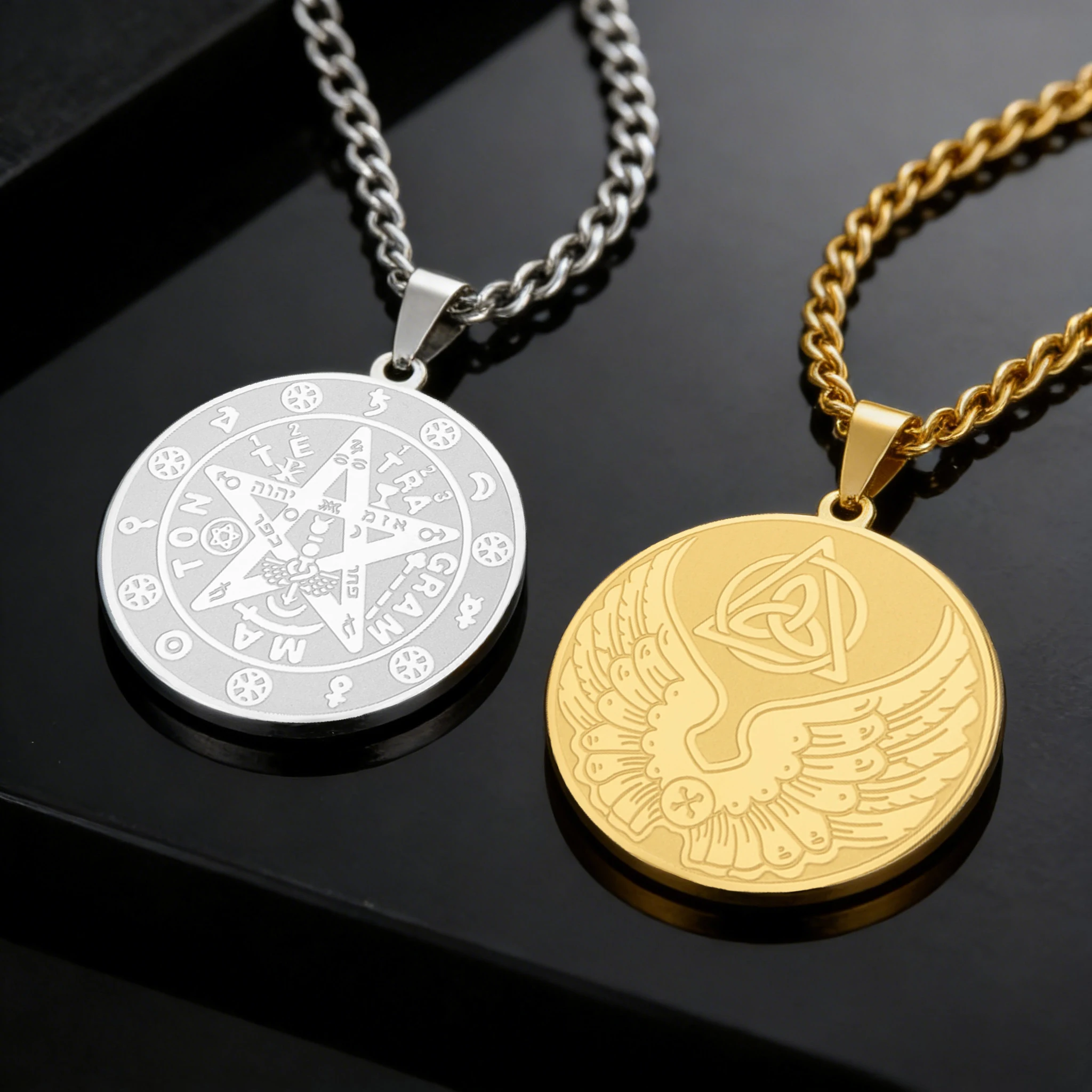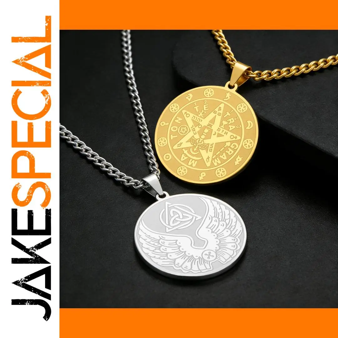 Imagine elevating your style with this beautifully crafted stainless steel necklace, available in elegant silver and gold finishes. It features two intricately engraved pendants, a gold-tone pentagram with detailed symbols and Hebrew characters for a mystical vibe, and a silver-tone engraved swan symbolizing grace and freedom. The pendants, measuring approximately 25x27mm, are linked to sturdy, thick chains of 45 to 60cm with a link design that exudes strength and sophistication. Perfect for various occasions—parties, anniversaries, birthdays, or daily wear—this accessory balances vintage charm with minimalist modern design. Its versatile style makes it an ideal gift, adding a touch of elegance and symbolism to your personal collection or as a meaningful present for loved ones.