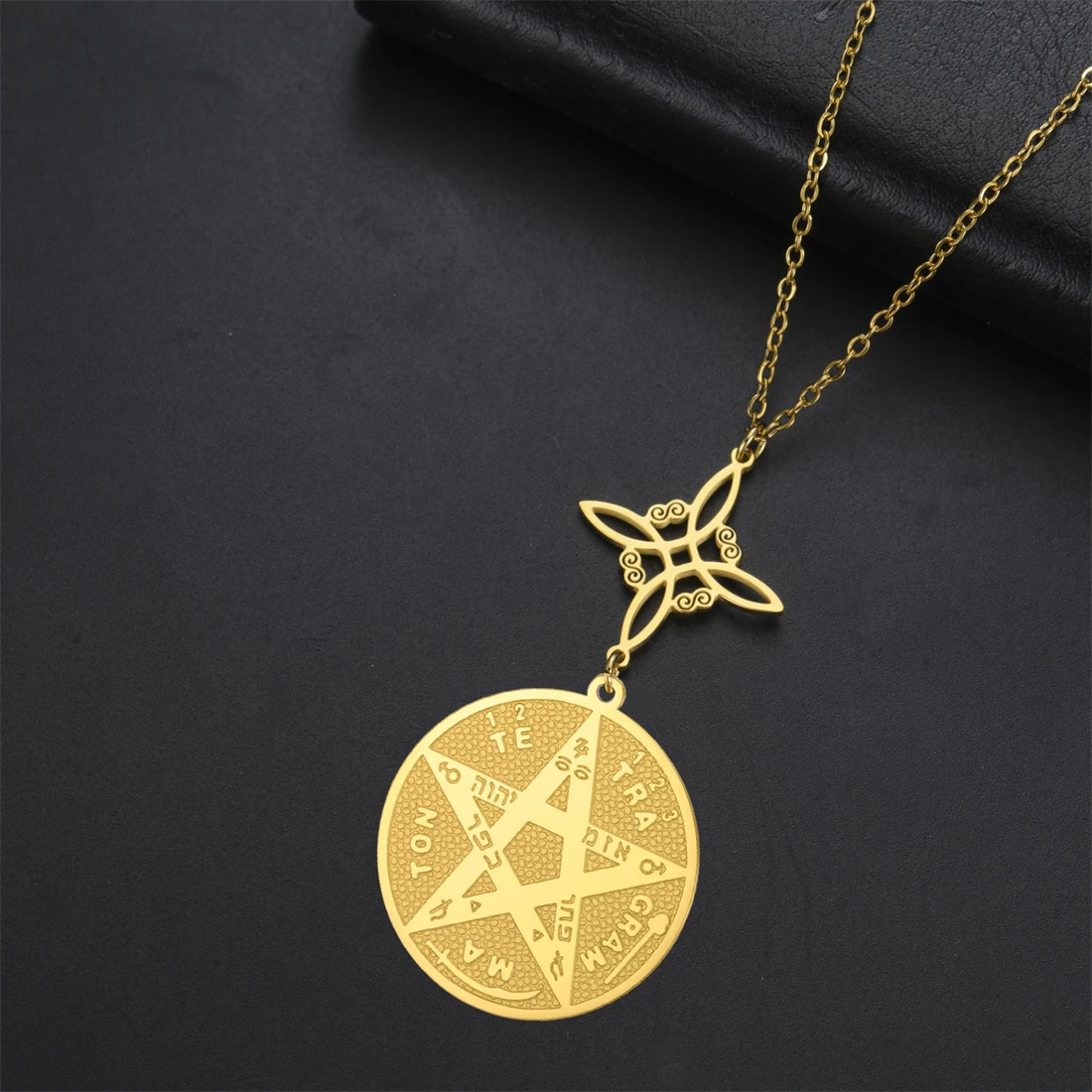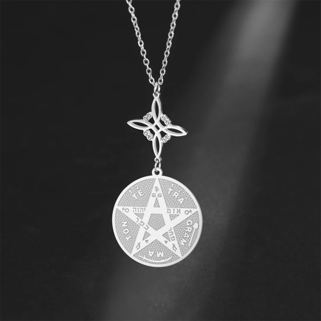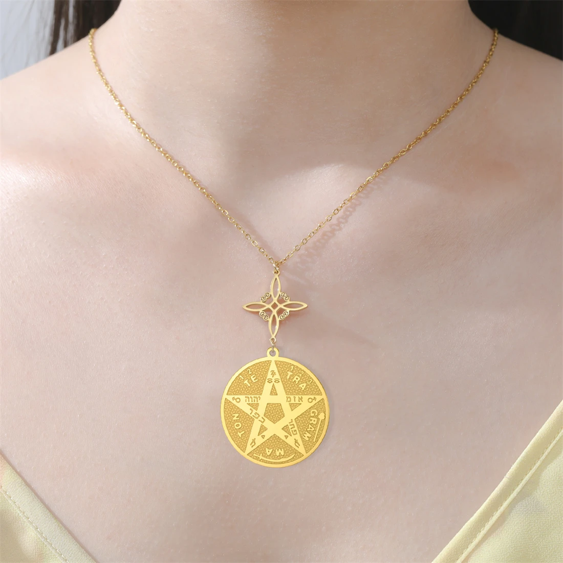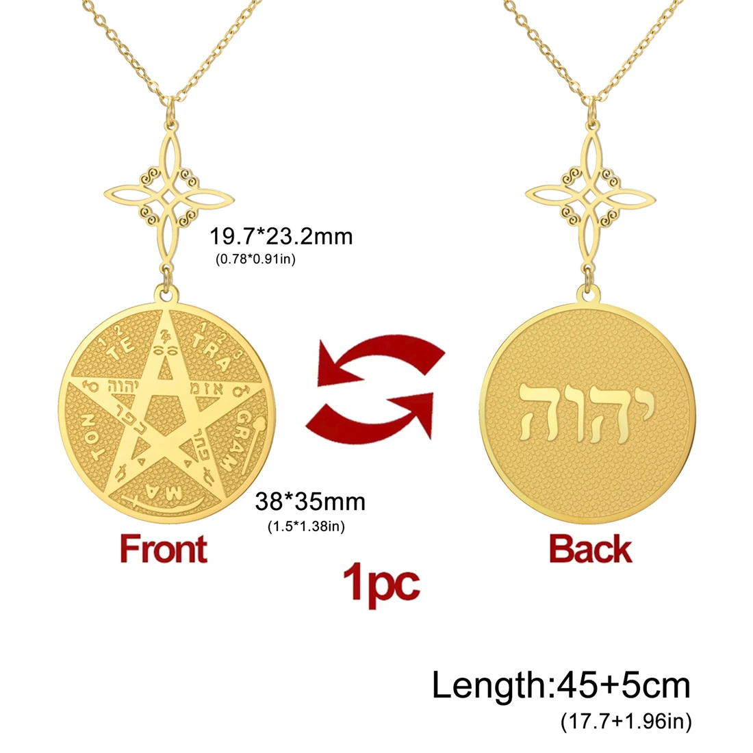 Elevate your style with this stainless steel unisex necklace featuring a vintage-inspired, minimalist design. The 45+5 cm polished chain, available in silver and gold tones, is durable, rust-resistant, and hypoallergenic, ensuring long-lasting wear. The pendant, crafted in a geometric shape, showcases the sacred God Name Tetragrammaton Pentacle, surrounded by intricate inscriptions and symbols, all set against a textured background that highlights its mystical appeal. Perfect for any occasion—from parties and birthdays to engagements and weddings—this elegant piece combines timeless symbolism with modern sophistication, making it an ideal meaningful gift or personal statement for those who appreciate spiritual and geometric design elements.