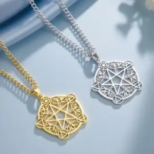 This stunning stainless steel pendant necklace features a large, intricately designed star-shaped pentagram, measuring 27.9 x 29.4 mm. The openwork filigree design showcases delicate geometric patterns, symbolizing the five elements—earth, air, fire, water, and spirit—encased within a circle representing eternity and infinity. Available in both steel and gold tones, the necklace boasts a 45+5 cm link chain with evenly spaced rounded links, perfect for adding a mystical touch to any outfit. Ideal for women and suitable for occasions like parties, this elegant piece blends spiritual symbolism with refined craftsmanship, making it a versatile addition to your jewelry collection.