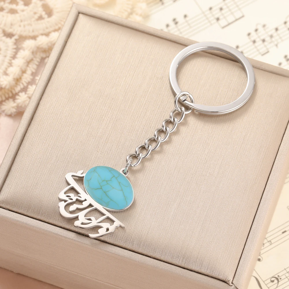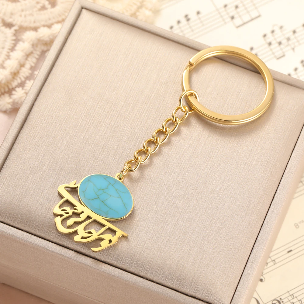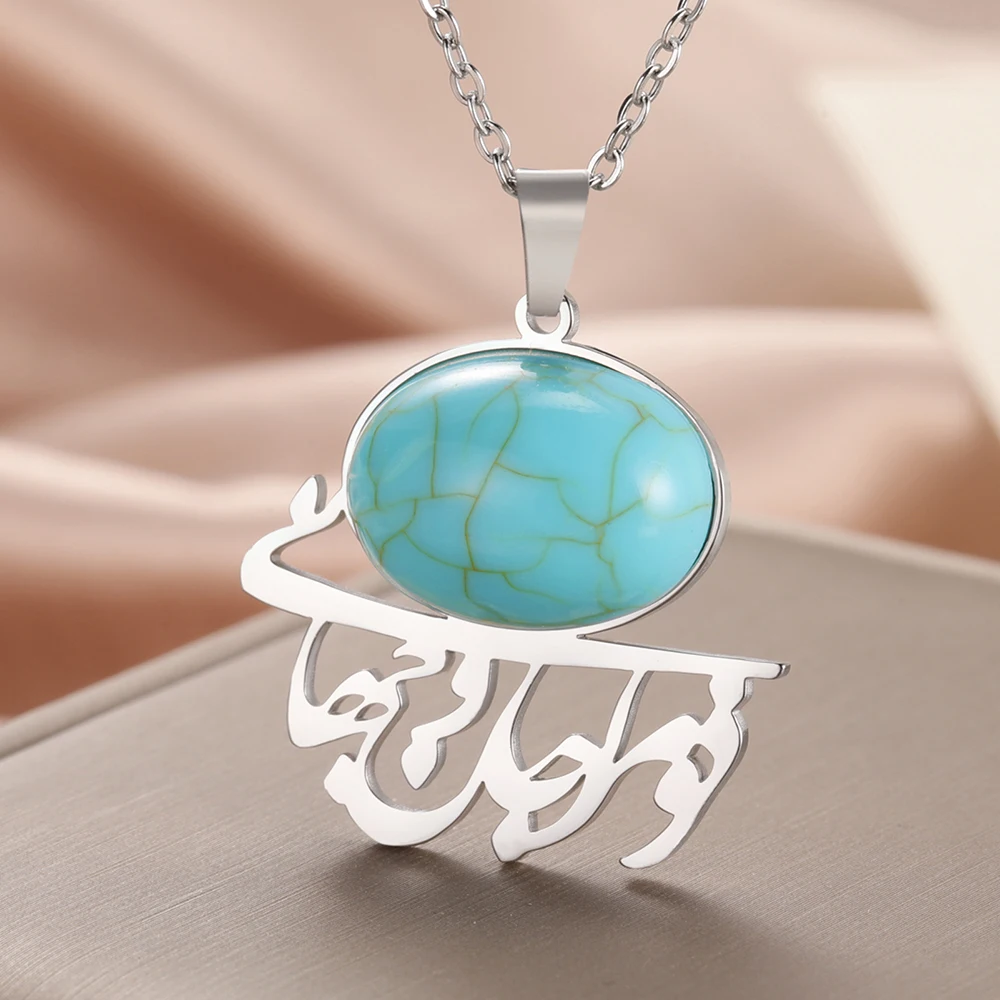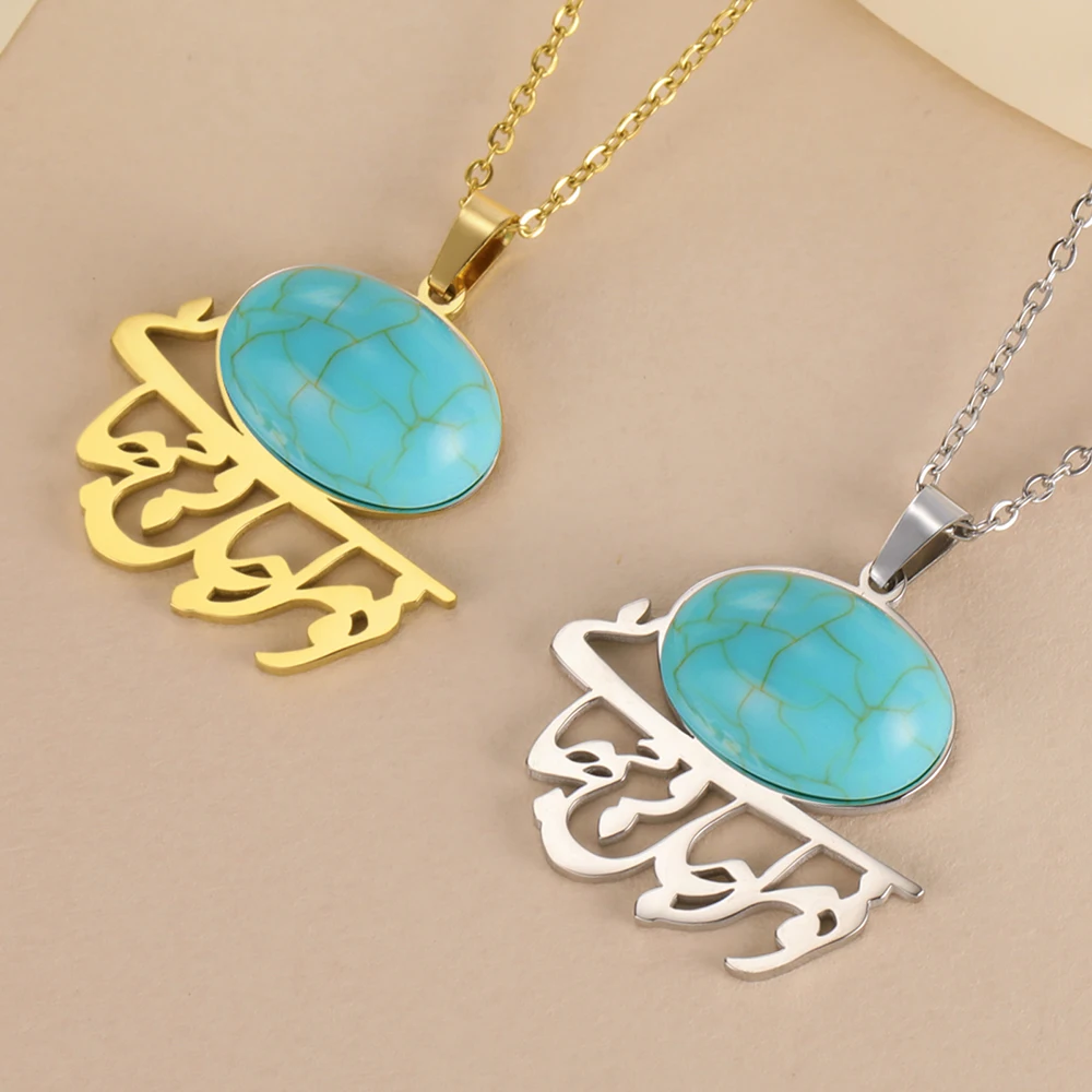 Imagine adorning yourself with this stunning pendant that perfectly balances vintage charm and cultural artistry. Crafted from durable stainless steel, this necklace features a large, oval Lab-made turquoise stone with a polished surface showcasing natural veining in shades of gold and darker blue. The vivid turquoise is set within a shiny metal frame that contours its shape, enhancing its elegance. Below the stone, an artful calligraphic inscription reads “you are my life and soul,” adding a poetic and meaningful touch. The necklace's delicate, adjustable chain measures 45+5 cm, making it suitable for various styles and necklines. Its hypoallergenic, tarnish-resistant finish ensures lasting beauty, making it an ideal accessory for both everyday wear and special occasions.